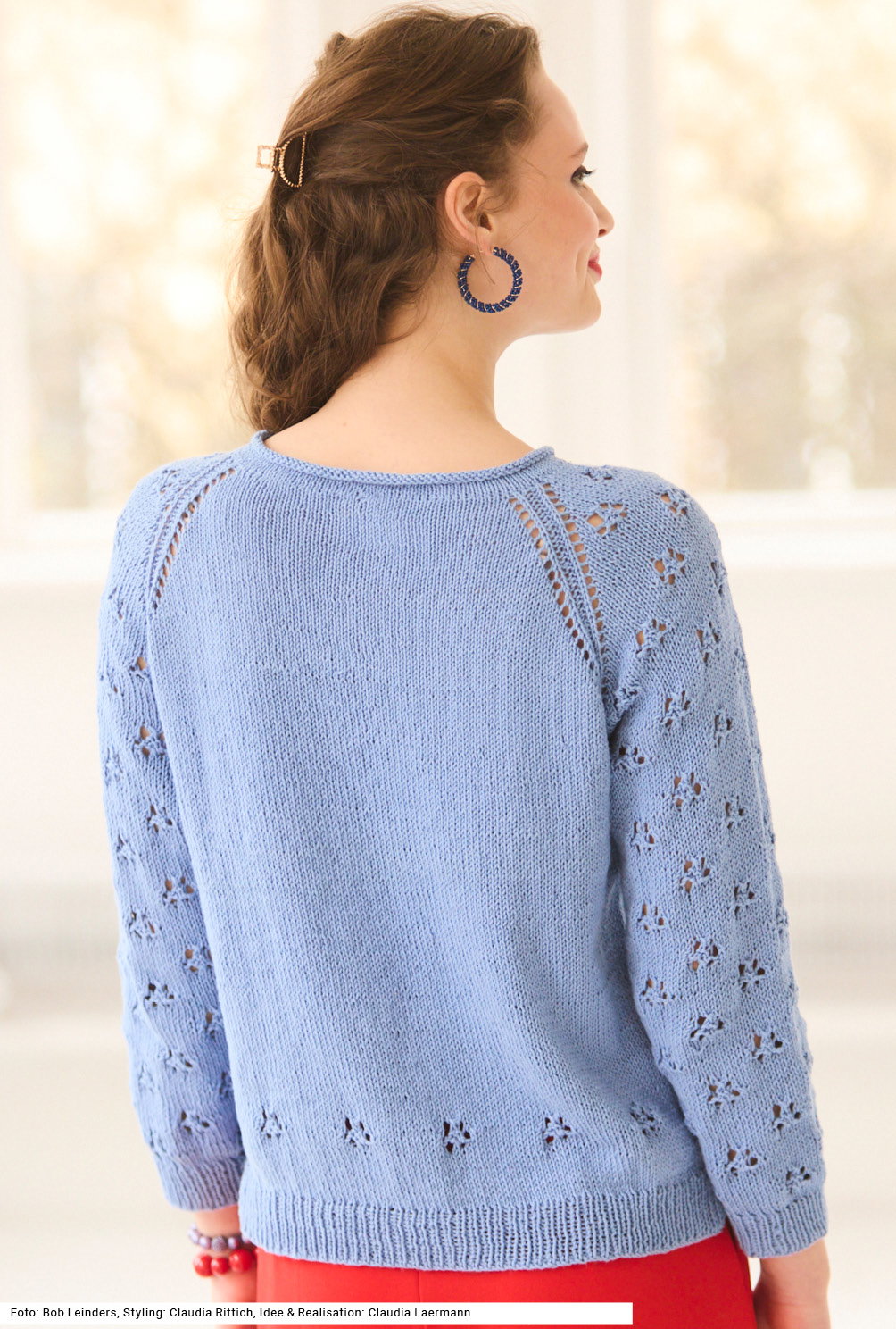 Dieser feminine Pullover mit klarer Linienführung wird von oben nach unten in einem Stück gestrickt. Die Raglanschrägungen sind durch Lochmusterstreifen betont. Daneben entfaltet sich das zarte Blütenmuster komplett über die Ärmel und setzt die Schultern elegant in Szene. Einzelne Blüten kommen noch einmal oberhalb des Rippenbunds zur Geltung. Der Rumpf-Bereich wird schlicht glatt rechts gearbeitet, sodass nichts die Wirkung der floralen Elemente schmälert. Die Anleitung für ein Garn aus Baumwolle und Viskose gibts für die Größen 36/38 und 40/42 sowie 44/46.