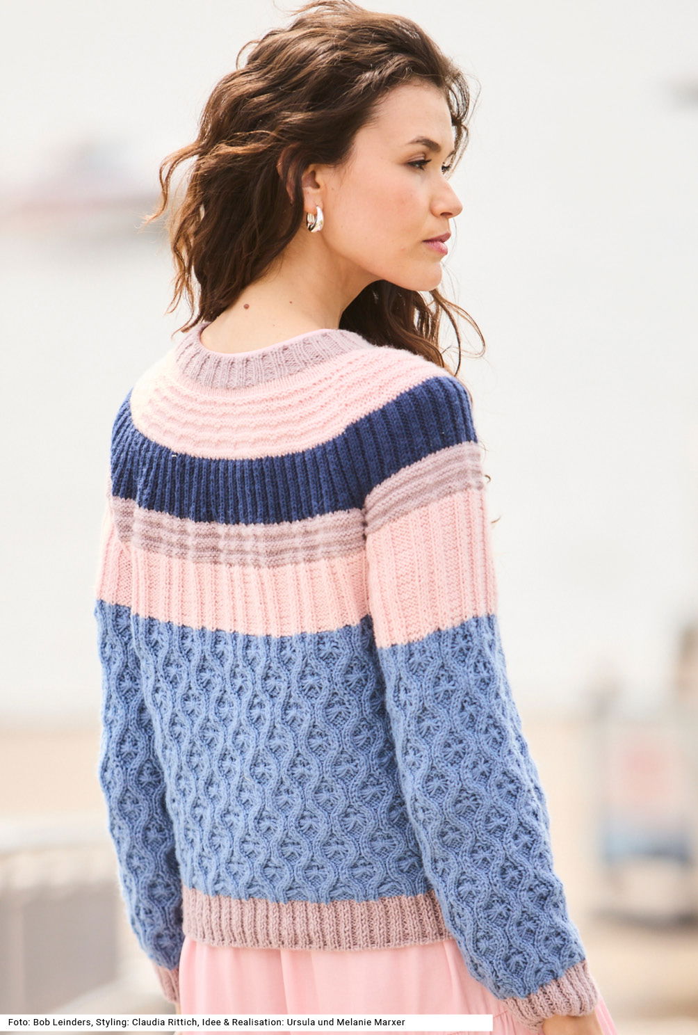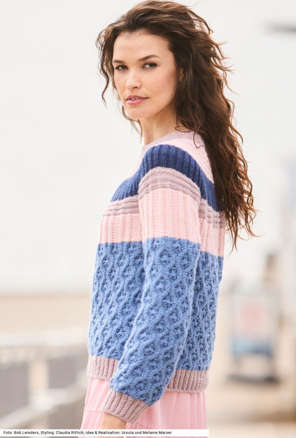 Dieser Pullover mit markanter Rundpasse spielt mit vier kontrastierenden Farben und ebenso vielen Mustern – vom filigranen Wabenmuster über plastische Streifen in verschieden breiten Rippen bis zu markanten Querrippen in kraus rechts ist für jede geübte StrickerIn etwas dabei. Das federleichte Garn aus Polyacryl und Polyamid mit seidigem Glanz betont diese Vielfalt zusätzlich und passt hervorragend zu diesem facettenreichen, kreativ arrangierten Pulli. Es wird zunächst jedes Teil für sich gestrickt, dann folgt die Passe in Runden. Eine Anleitung gibts für die Größen 36/38, 40/42 und 44/46.