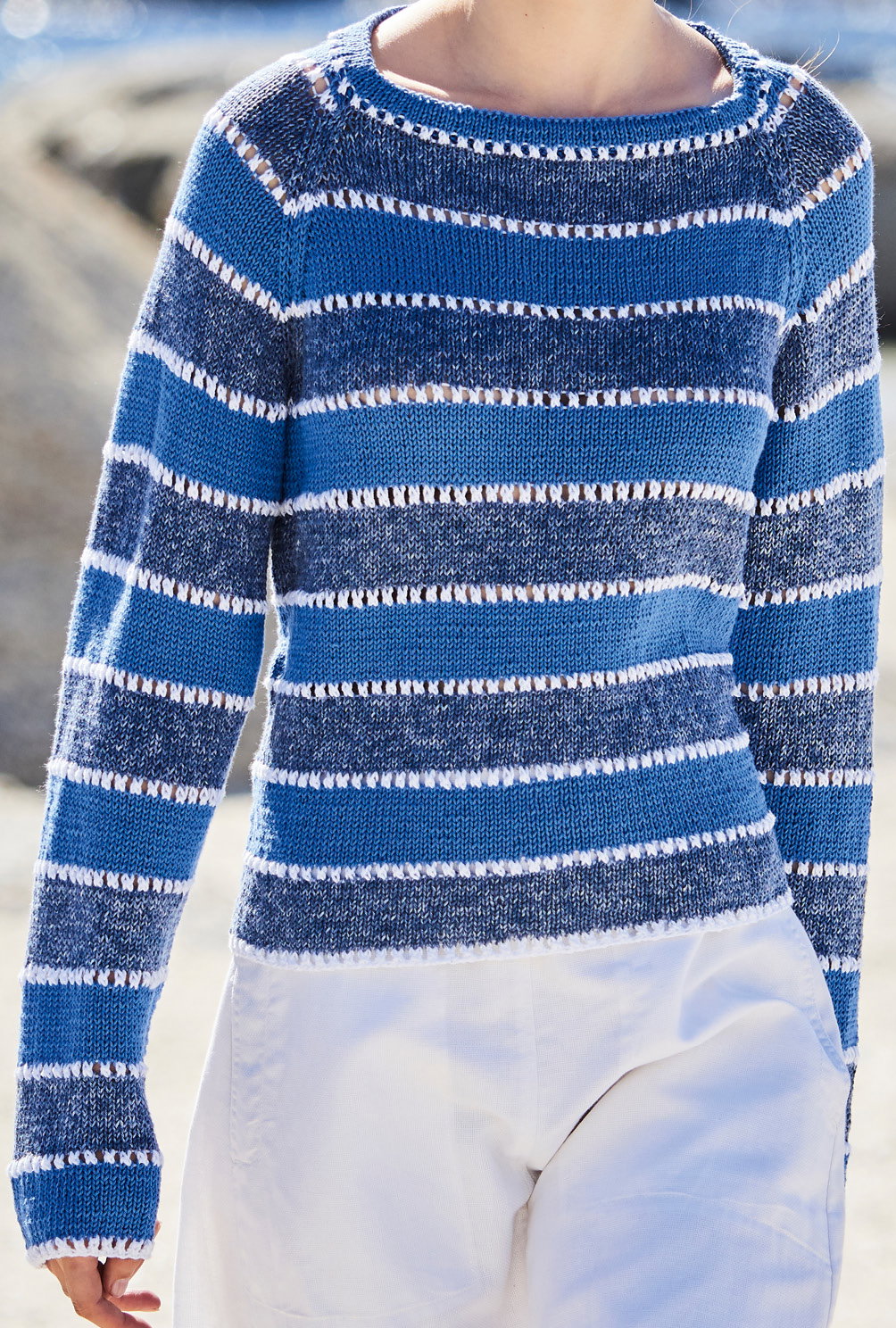 Streifen gehen immer! Sie beschleunigen den Strickprozess ungemein, weil man immer unbedingt noch die nächste Streifenfolge sehen möchte und machen auch das Arbeiten in glatt rechts abwechslungsreich. Besonders, wenn es dabei so harmonisch zugeht, wie bei diesem Raglanpulli aus reiner Baumwolle. Kleine Lochmuster-Streifen in Weiß lockern den Pullover optisch noch einmal auf und sorgen für frischen Kontrast. Dieses Muster ist ganz einfach zu stricken und somit absolut anfängertauglich. Der Raglanschnitt in Kombination mit der Baumwolle und dem Streifenmuster sorgt für eine unkomplizierte, leicht sportlich angehauchte Note und macht den Strickpulli so kombinationsfreudig. Kurz: Ein Modell, dass man immer wieder und in unterschiedlichsten Farbkombinationen stricken wird. Übriegns kann man dieses Modell auch ganz prima mit schmaleren Streifen nachstricken – dann ist es ein super Projekt zur Resteverwertung.