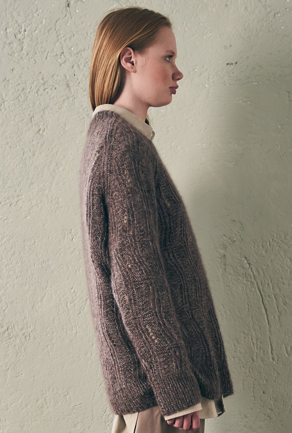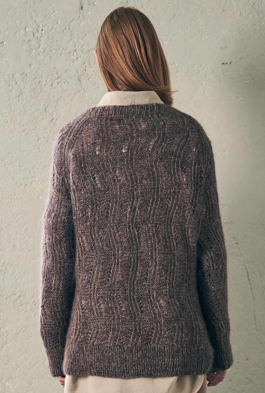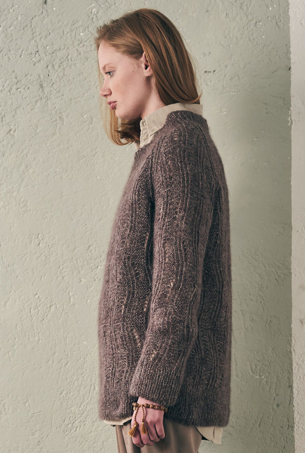 Greige, Silbergrau und Aubergine werden hier zusammen verstrickt – daraus entsteht eine Nuance, die unvergleichlich schön ist. Mit einem wellenförmigen Ajourmuster und dem lässigen Raglanschnitt wird daraus ein echtes Maschen-Highlight für entspannte Stunden. Zugegeben, das Lochmuster benötigt zwar ein wenig Aufmerksamkeit, aber die klare Strickschrift in der Anleitung hilft dabei, stets den Überblick zu behalten. Dreifädig mit Nadelstärke 4,5 gestrickt, geht es auch recht zügig voran. Gestrickt wird in einzelnen Teilen von unten nach oben. Sind alle vier Teile fertig gestrickt, werden noch alle Nähte geschlossen und aus dem Halsausschnitt die schmale Blende im Rippenmuster herausgestrickt. Am besten nimmt der fertige Pulli jetzt noch ein kleines Bad und wird im Liegen getrocknet. Dabei schön in Form bringen und glattstreichen – so öffnet sich das Lacemuster und entfaltet seine ganze Pracht.