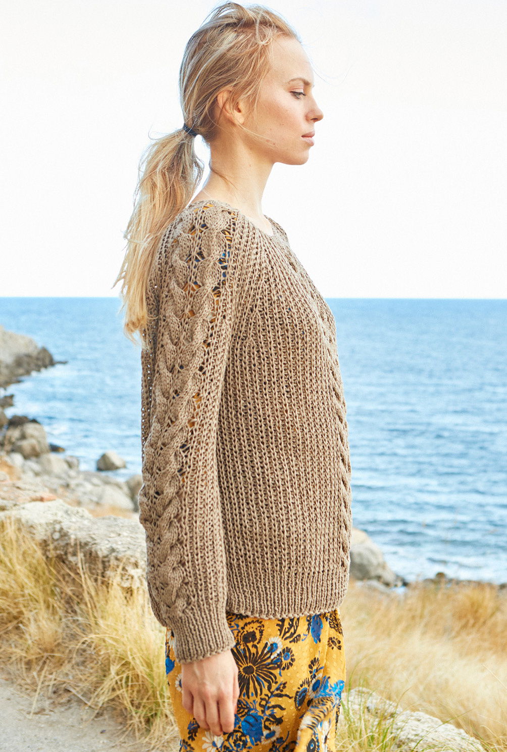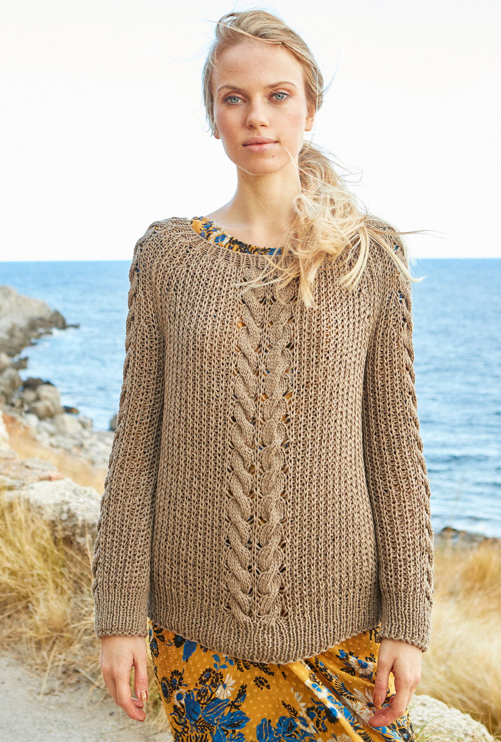 Sehr lässig zeigt sich der Raglanpullover mit seinem legeren Schnitt, den plastischen Rippen und einem effektvollem Zopfstreifen in der Mitte. Mit Nadelstärke 7 gestrickt, braucht es auch nicht sonderlich viel Geduld, bis der neue Lieblingspulli fertig ist. Gestrickt wird der Raglanpulli in einzelnen Teilen von unten nach oben. Sowohl Rückenteil, Vorderteil und die Ärmel beginnen erst einmal mit einem Rippenbündchen. Danach werden die Maschen für die Rippen im Halbpatent-Muster und den Zopfstreifen eingeteilt. Besonders zu Beginn sind hierbei Maschenmarkierer sehr praktisch, um die einzelnen Musterabschnitte zu kennzeichnen. Dann geht es immer in der Mustereinteilung weiter hoch, die Raglanschrägungen werden später noch zusätzlich mit betonten Abnahmen gearbeitet. Beide Muster sind in der Anleitung Reihe für Reihe erklärt, wobei der Zopfstreifen seine besondere Optik durch geschickt platzierte Umschläge erhält. Sind alle Teile fertig, werden die Nähte geschlossen und aus dem Halsausschnitt das Rippenbündchen herausgestrickt.