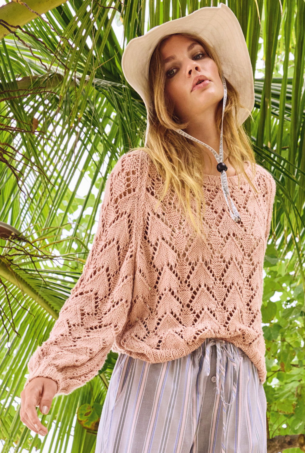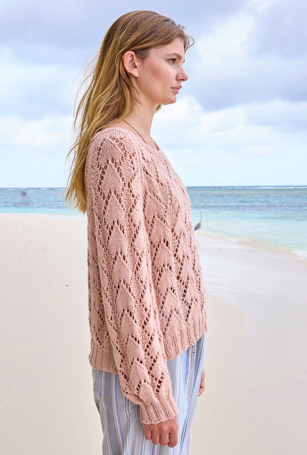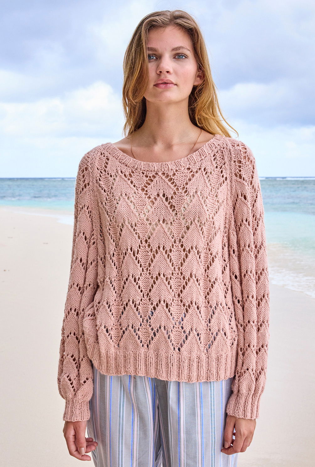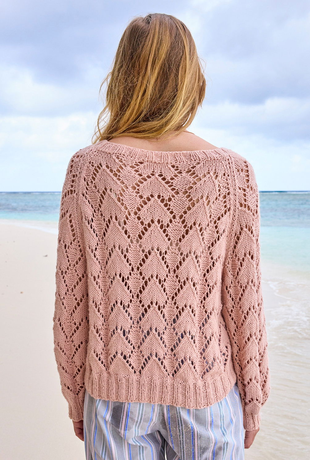 Jede Menge Bewegungsfreiheit garantiert der salopp geschnittene Ajourmuster-Pulli, bei dem die Raglanschrägungen besonders tief angesetzt und zusätzlich mit einer Glatt-rechts-Linie akzentuiert wurden. Die reine Baumwolle ist dabei ein Garant für ein angenehmes Tragegefühl auch bei wärmsten Temperaturen. Mit Nadelstärke 4,5 im Ajourmuster und in vier Einzelteilen von unten nach oben gestrickt, geht es recht zügig voran. Das Lochmuster benötigt zwar ein wenig Aufmerksamkeit, aber die klare Strickschrift in der Anleitung hilft dabei, stets den Überblick zu behalten. Sind alle vier Teile fertig gestrickt, werden noch alle Nähte geschlossen und aus dem Halsausschnitt die schmale Blende im Rippenmuster herausgestrickt. Am besten nimmt der Sommerpulli dann noch ein kleines Bad und wird schön glatt ausgestrichen und liegend getrocknet. Dabei entfaltet das Ajourmuster seine volle Schönheit.