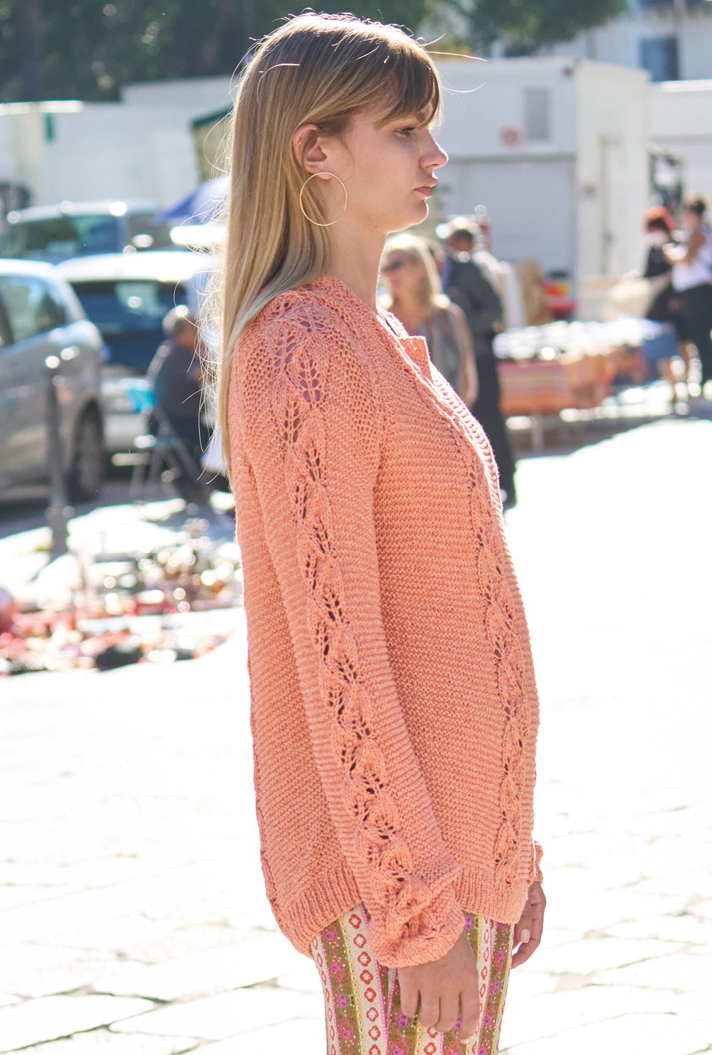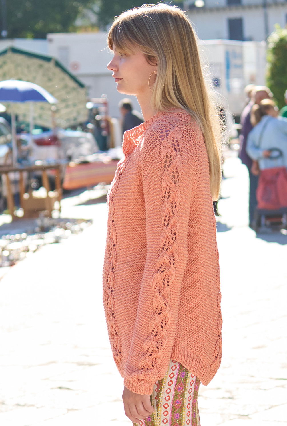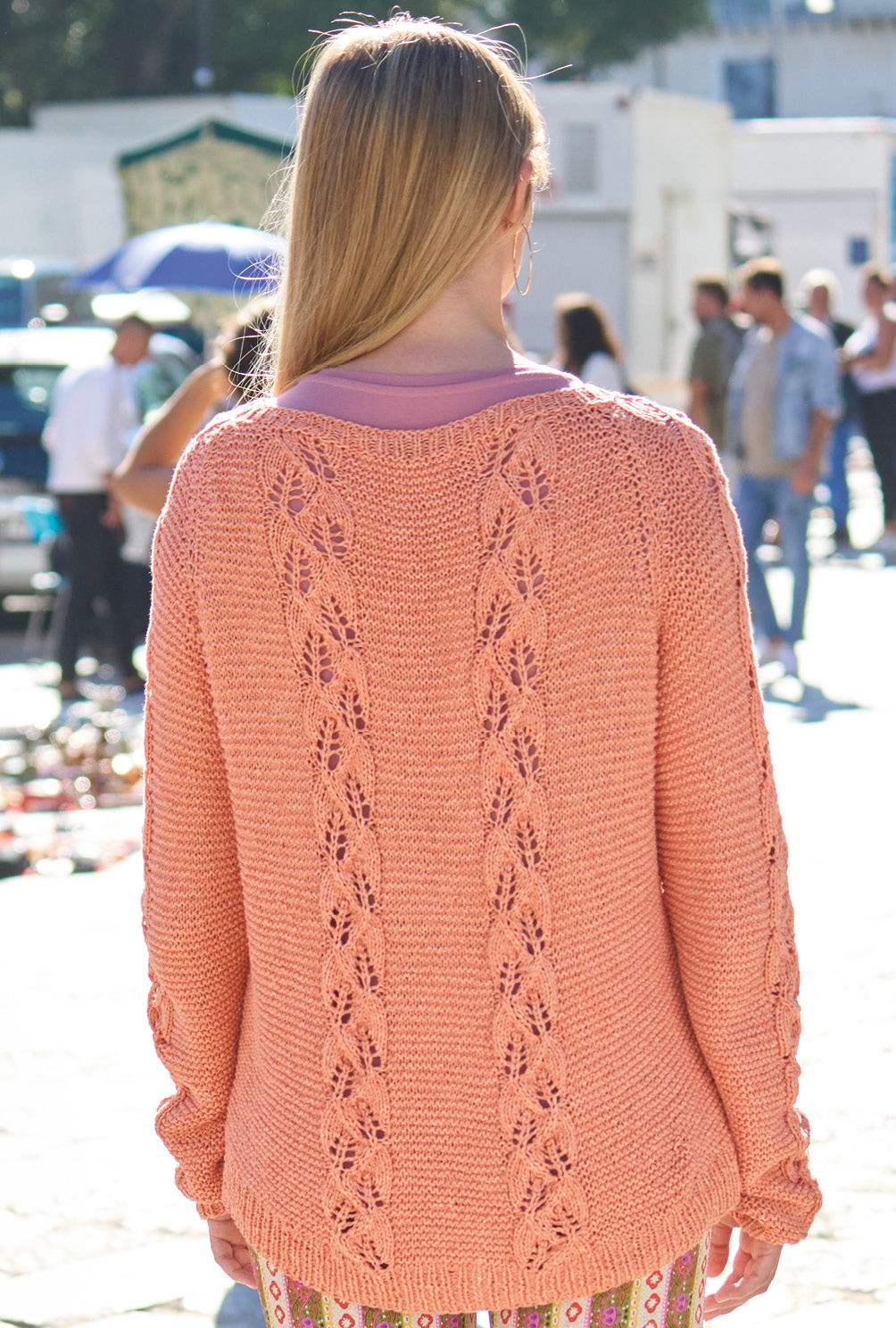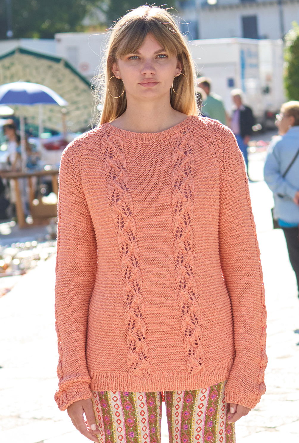 Schmale Blattmusterstreifen ziehen sich hier vertikal über den Pulli und werden mit einfachen Kraus-rechts-Partien kombiniert – eine tolle Optik, deren ausdrucksstarke Wirkung durch das griffige Bändchengarn aus Baumwolle und Schurwolle unterstützt wird. Der modische Raglanschnitt gibt den lässigen Touch, Rippenblenden am Saum, an den Ärmeln und am Halsausschnitt bilden den klassischen Rahmen. In hellem Orange ein Highlight, das jedes frühlingshafte Outfit bestens ergänzt.