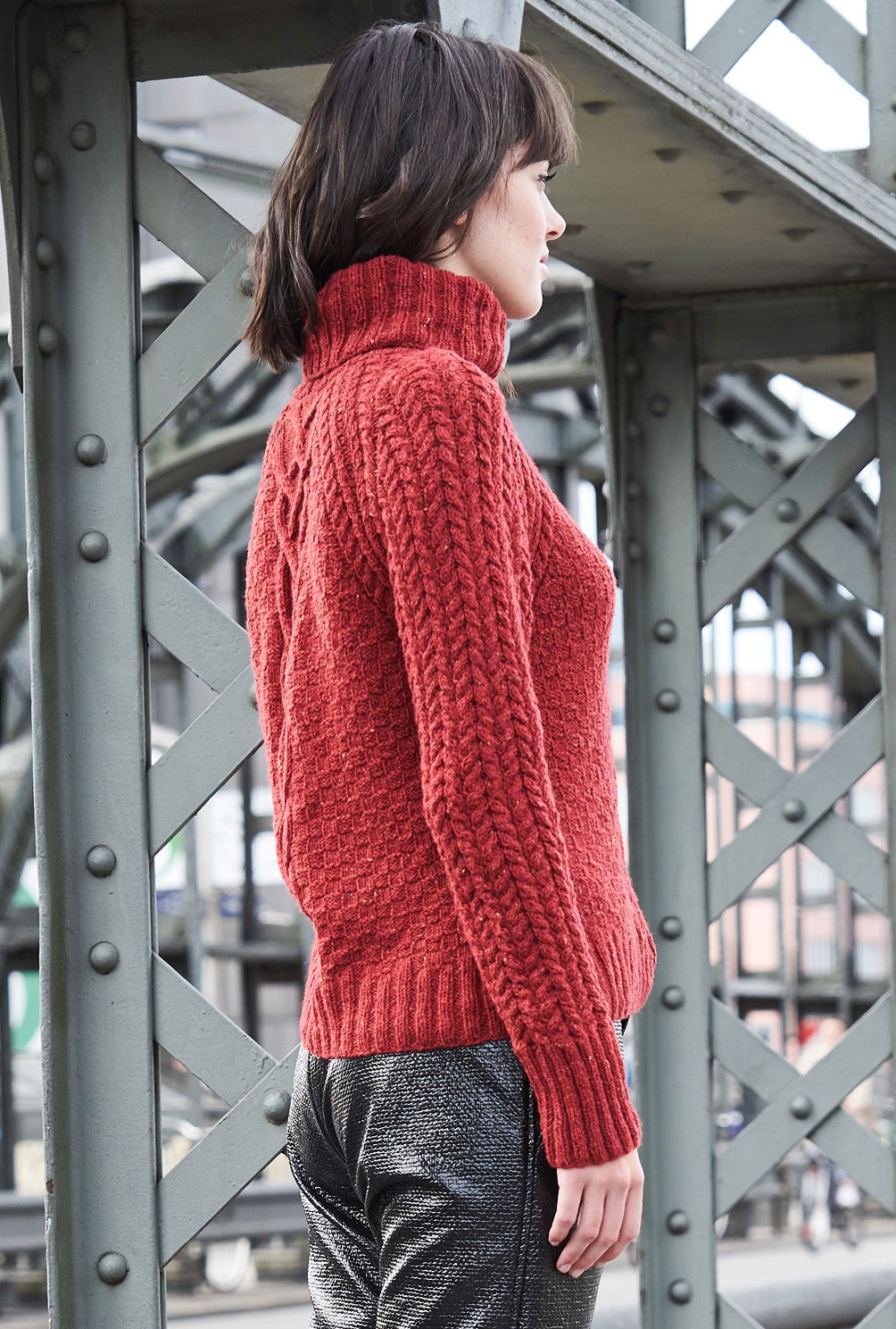 Der Mix macht´s: Man nehme einen femininen Schnitt, trendiges, durch einen Anteil Kaschmir extra weiches Tweedgarn und traditionelle Fishermen-Zöpfe! Schon hat man ein Garant für einen absoluten Hingucker und richtig viel Strickspaß. Gestrickt wird der Raglanpulli in vier Einzelteilen. Die seitlichen Zöpfe und der Mittelzopf werden durch die Struktur des Schachbrettmusters wunderbar eingerahmt. Hat man sich die Maschen für die Musterfolge erst einmal eingeteilt, geht es mit Hilfe der übersichtlichen Strickschrift schnell voran. Die Ärmel mit ihren feineren Zopfmusterstreifen betonen gekonnt die feminine Raglanline. Nachdem dann alle Nähte geschlossen wurden, müssen nur noch die Maschen für den Rollkragen aus dem Halsausschnitt herausgestrickt werden und dieser in Runden und im Rippenmuster fertig gestrickt werden. Schon kann der brandneue, anschmiegsame Klassiker unsere Garderobe bereichern.