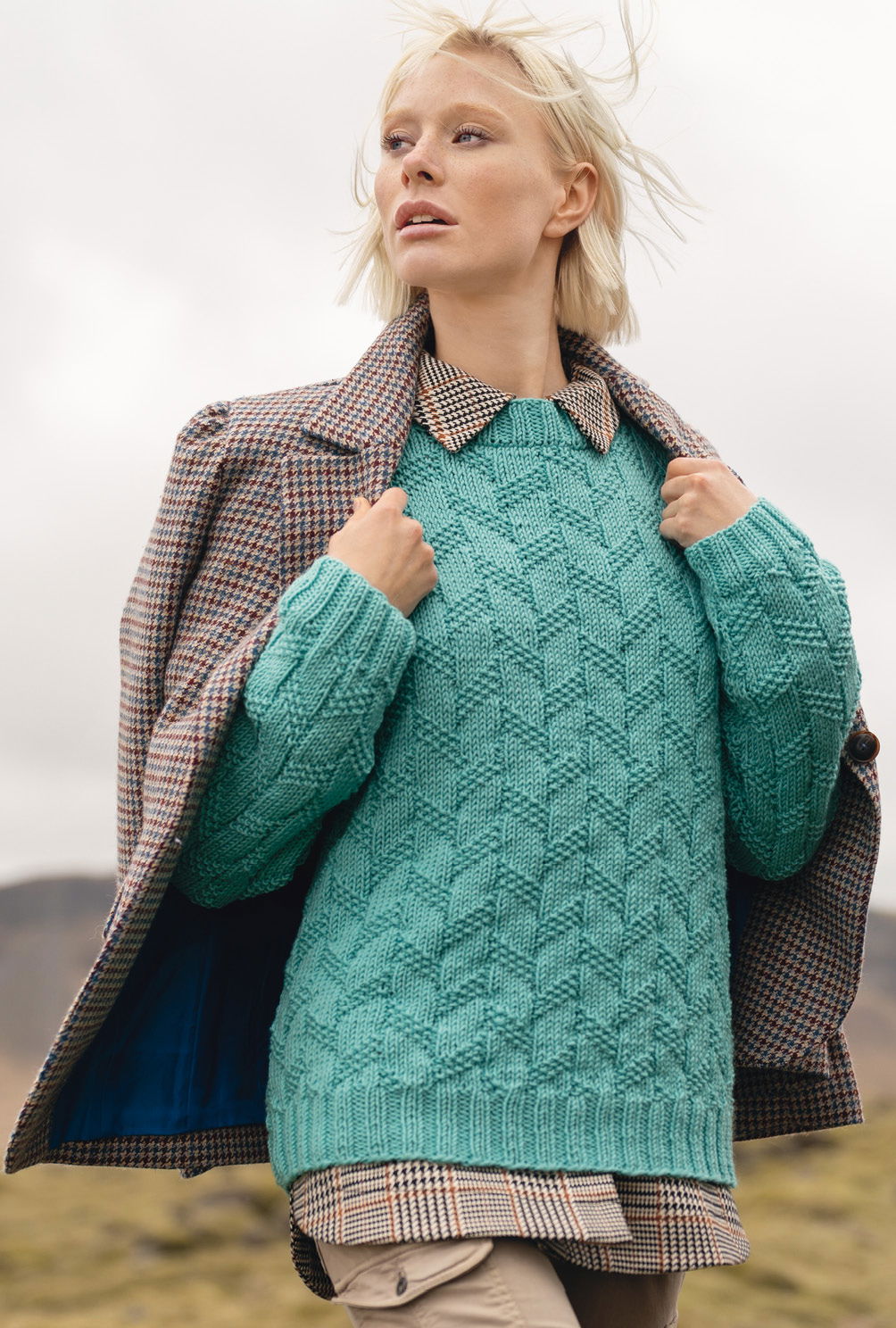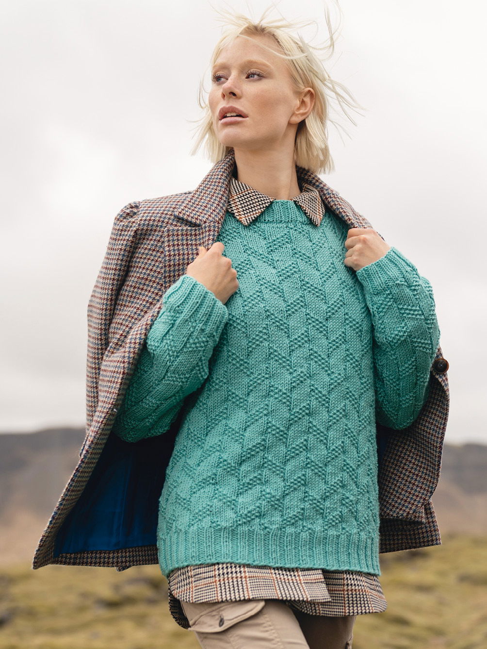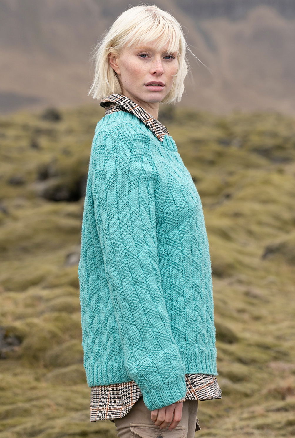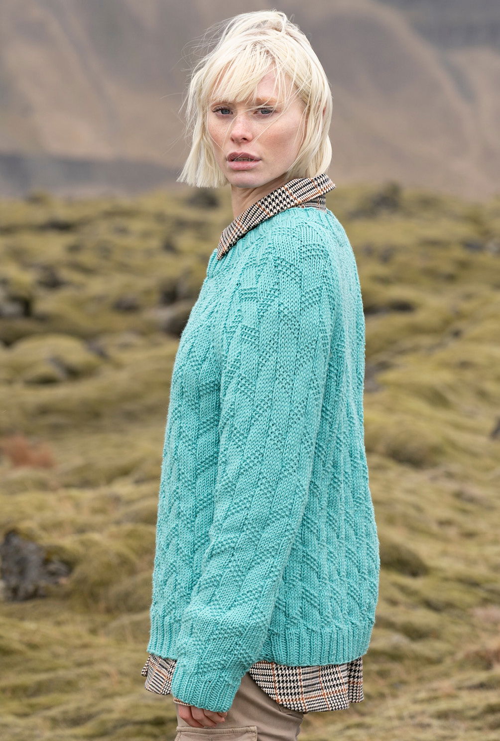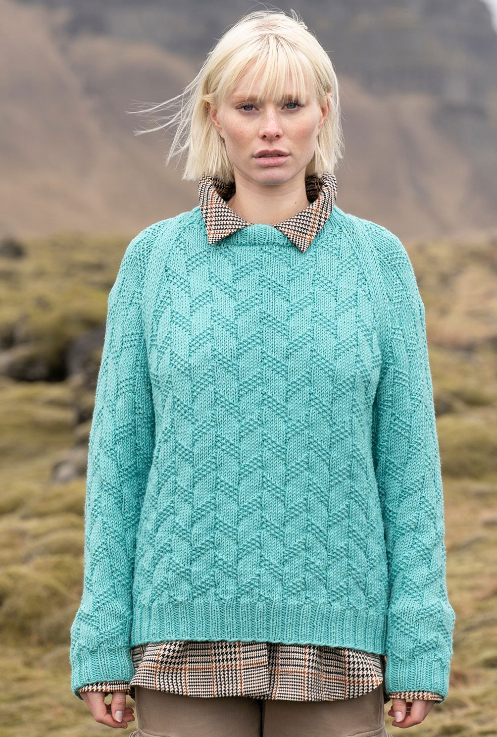 Ungeachtet der Tendenz zu mehr Weiblichkeit bleibt das grundsätzliche Bedürfnis der Frauen nach Alltagstauglichkeit bestehen. Hier zeigen wir dir einen klassisch geschnittenen Raglanpulli in kräftigem Türkis, dessen Allover-Strukturen aus rechten und linken Maschen gestrickt werden. Eigentlich nicht so schwer, da aber auch in Rückreihen gemustert wird, heißt es bei den Abnahmen für die Raglanschrägungen aufgepasst. Wir haben in unserer Anleitung eine kleine Strickschrift angefertigt, an der du dich orientieren kannst. Eine weitere Hilfe sind die Glatt-rechts-Streifen vor und nach den Abnahmen. Fertig? Dann musst du nur noch die vier Teile zusammennähen und die gerippte Halsblende anstricken.