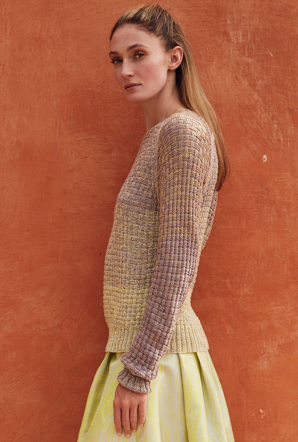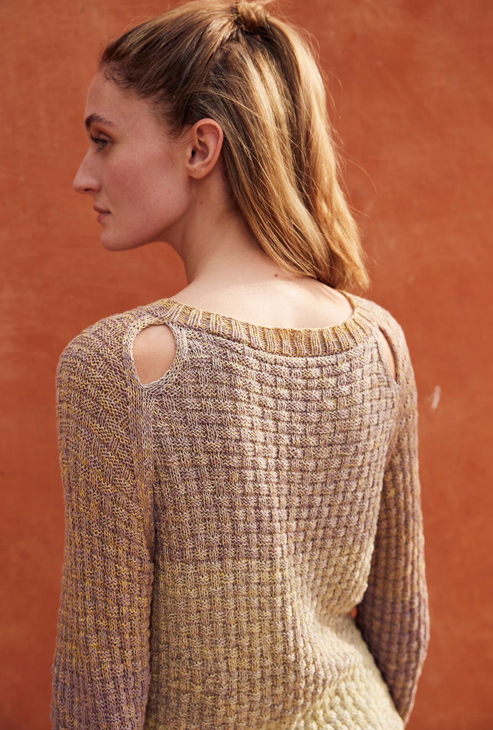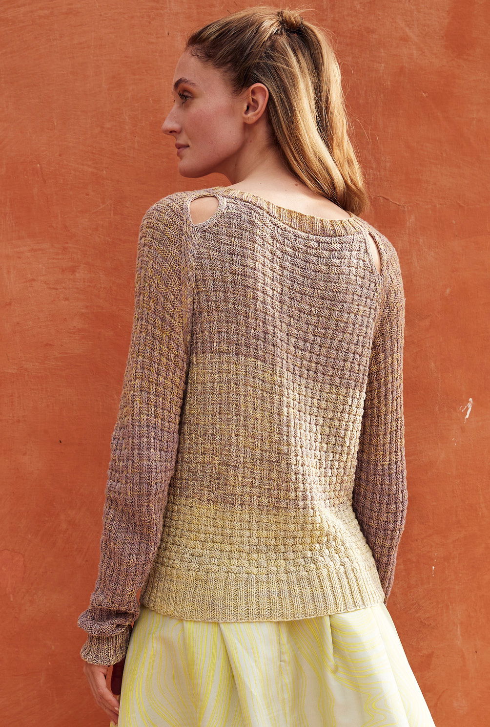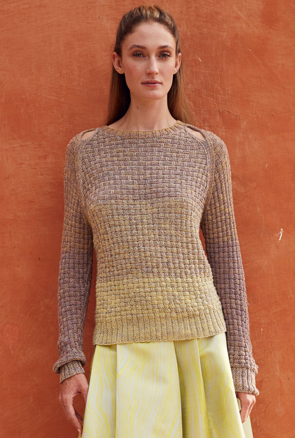Von hellem Gelb bis sanftem Taupe geht hier die aparte Farbnuancierung, die ausschließlich durch das Verlaufsgarn geschaffen wird, also direkt aus dem Knäuel kommt. Das Allover-Strukturmuster entsteht ganz einfach aus rechten und linken Maschen und lässt einen tollen Pulli entstehen, an den sich auch Strickneulinge wagen können. Bei den Raglanschrägungen heißt es allerdinges aufgepasst, sie werden durch betonte Abnahmen akzentuiert, was in unserer Anleitung genau beschrieben ist. Wem die Cutouts im Schulterbereich nicht gefallen, näht einfache die Raglankanten komplett zu.