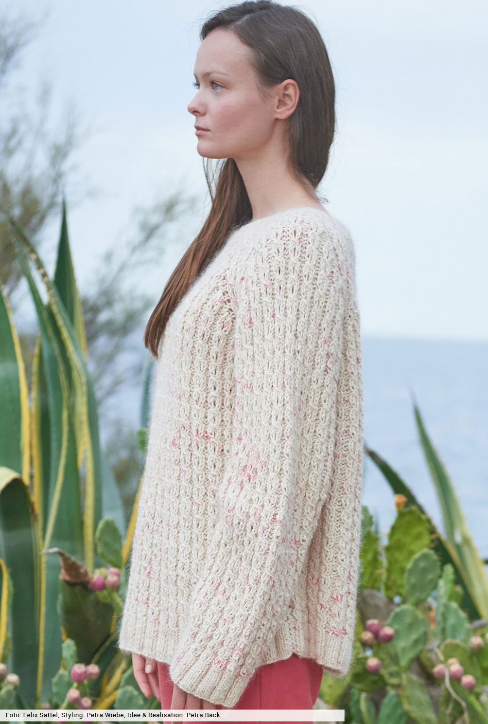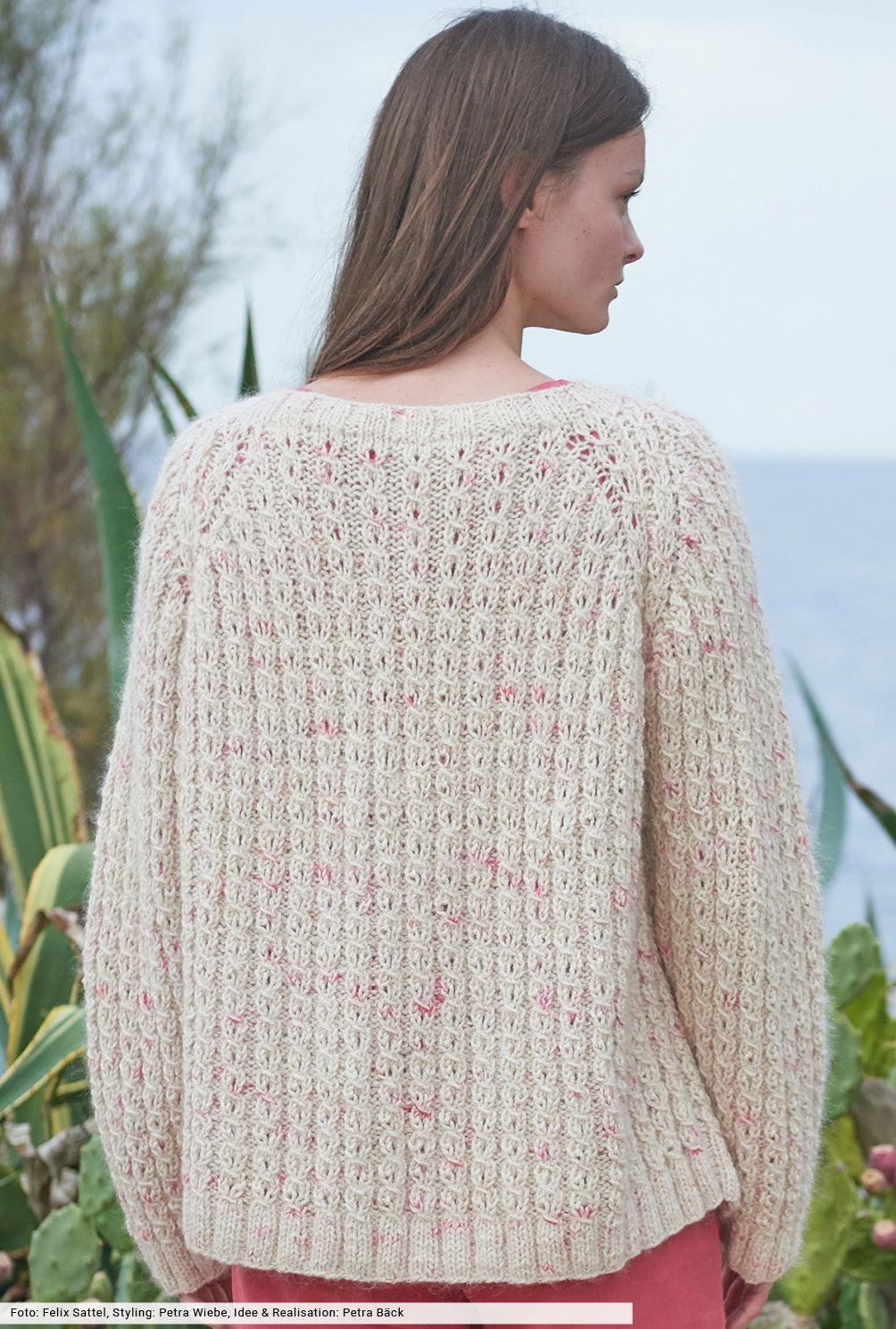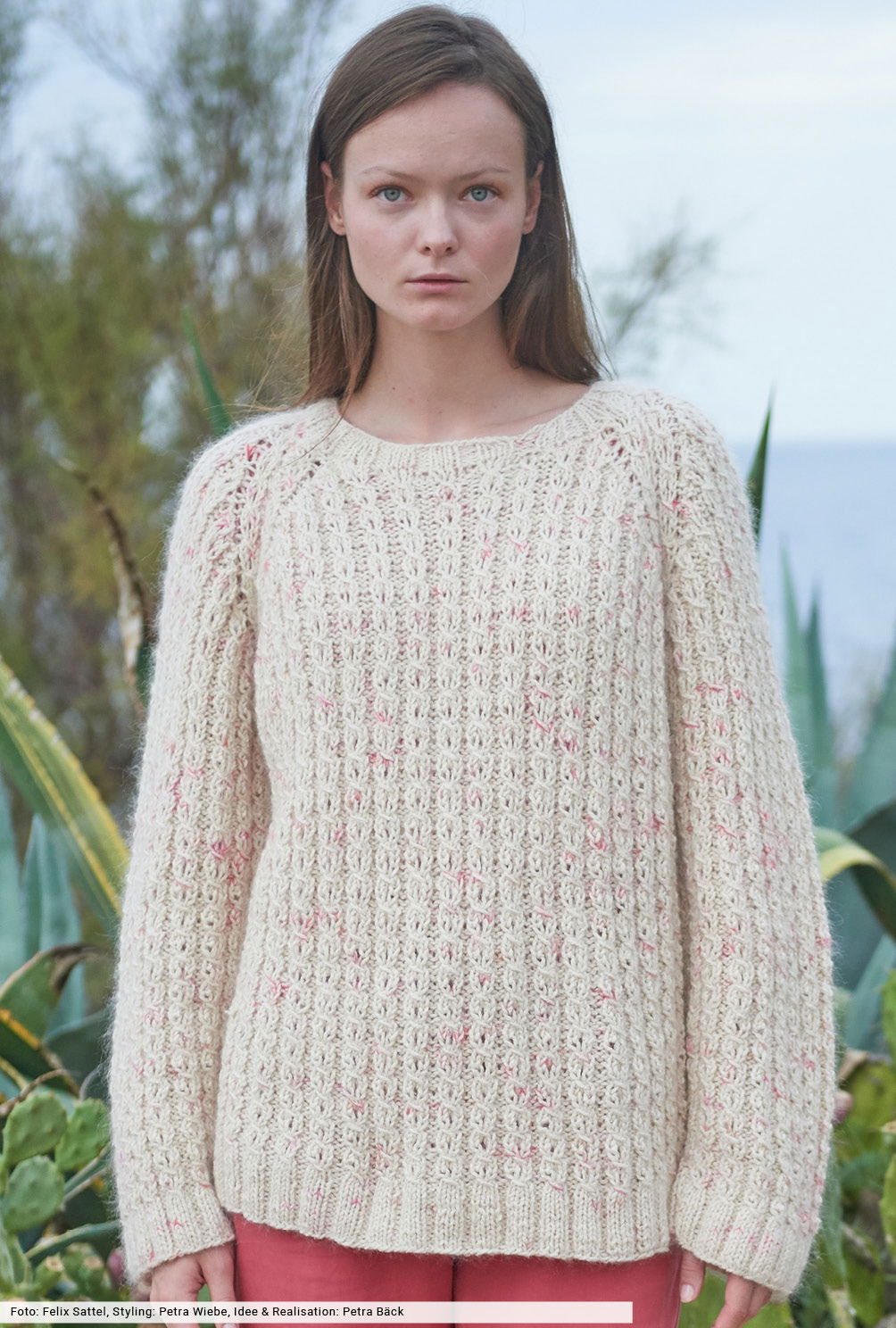 Raffinierte Effekte machen immer wieder Lust auf Strick: Hier haben wir zum griffigen Seidengarn cremefarbenes Mohair verstrickt, das sich durch Farbtupfer in Pink und Koralle ganz dezent hervorhebt. Außerdem kommt ein schlichtes Zopf-Ajourmuster ins Maschenspiel, das wir in unserer Anleitung genau beschrieben haben. Dazu die hüftlange Form und elastische Rippenbündchen, fertig ist ein lässiger Raglanpulli, der länger als eine Saison begeistert.