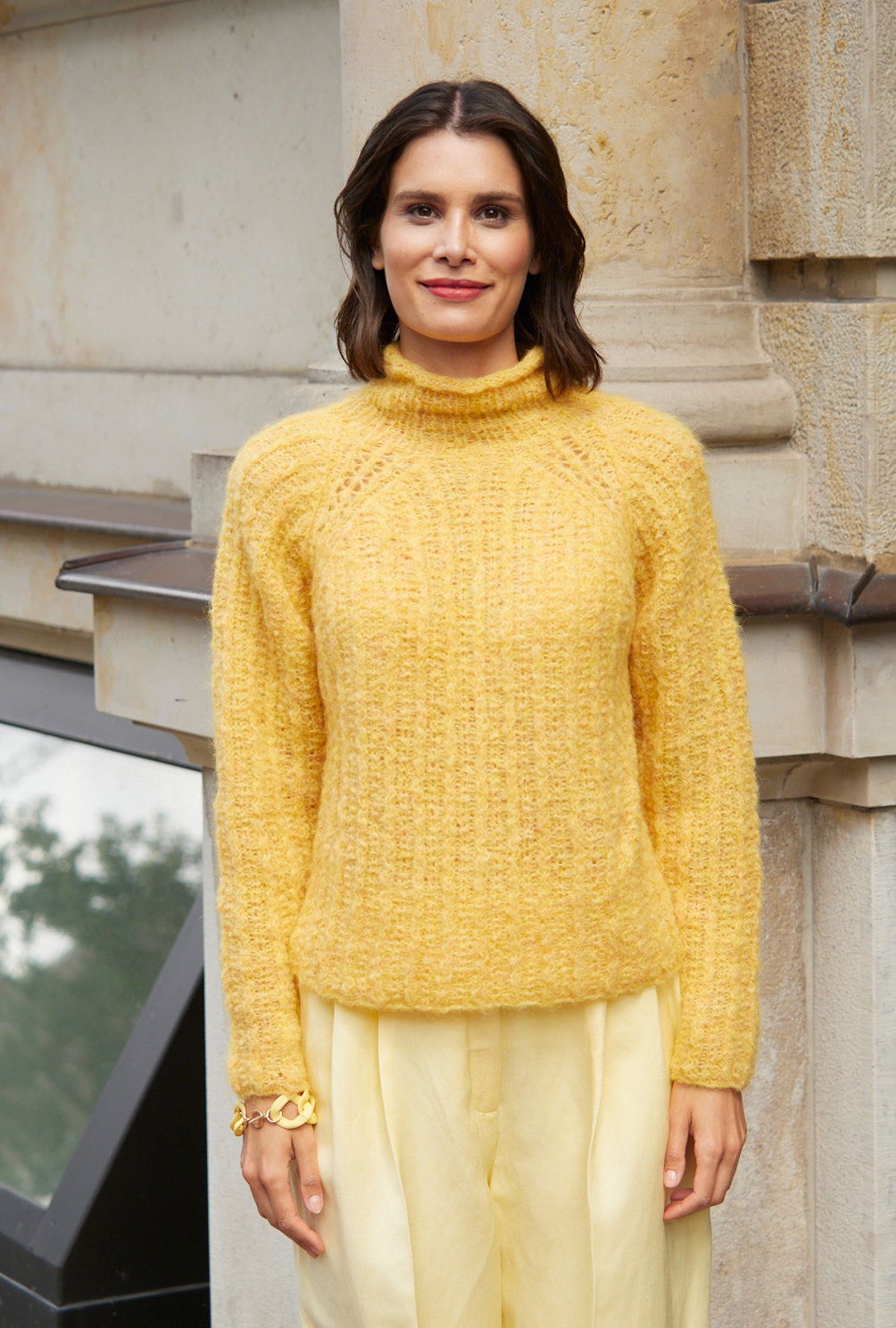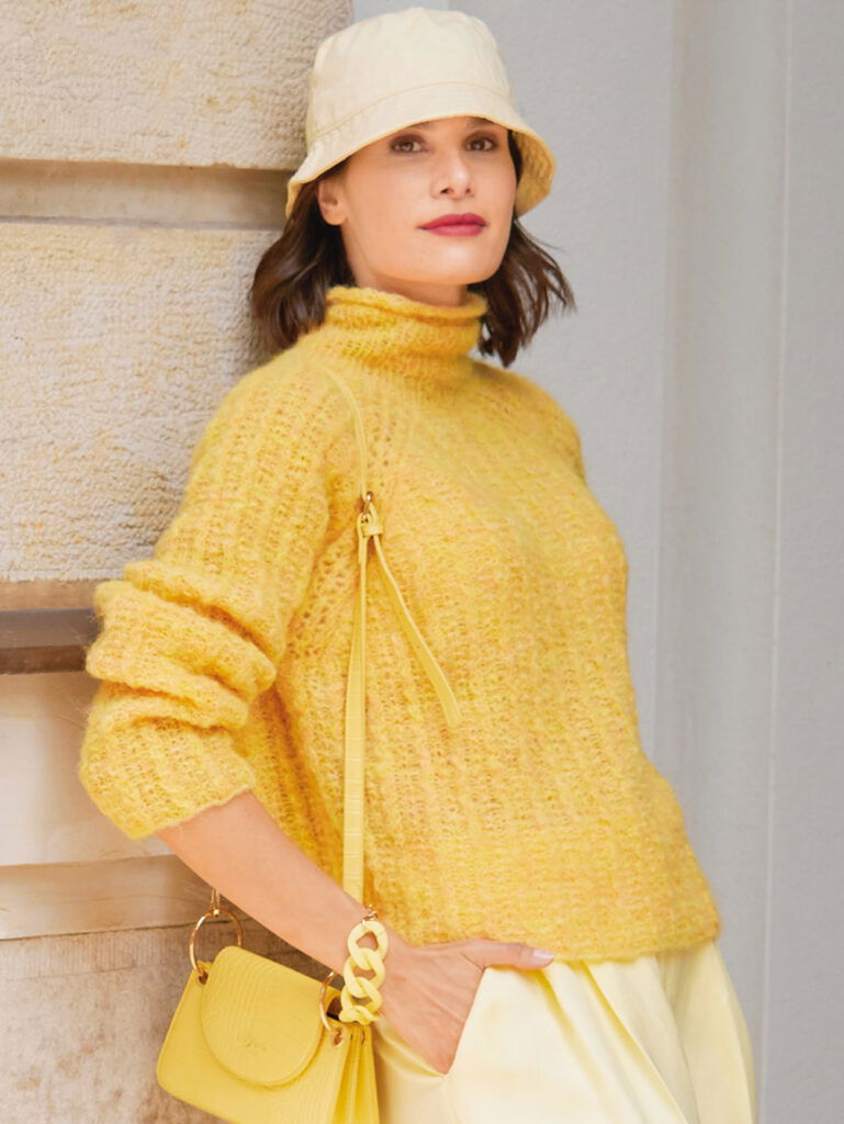Dieser bequem geschnittene zitronengelbe Raglanpullover aus einem Garn mit sehr hohem Alpaka-Anteil und wenig Polyamid wirkt lässig und dennoch elegant. Highlights des Modells sind die mit einem Lochmuster verzierten breiten Raglanschrägungen. Ansonsten wird allover ein Muster aus ganz schmalen Zöpfchen und Kraus-Rippen gearbeitet. Lediglich der hohe Turtleneckkragen ist mit 1/1-Rippen gestrickt, dessen Ende bekommt noch eine schmale Rollblende aus glatt rechts. Die Raglanschrägungen sind bewusst extralang, somit äußerst bequem im Ärmel-Schulter-Bereich. Eine Anleitung kann in den Größen 36/38, 40/42 und 44/46 downgeloadet werden.