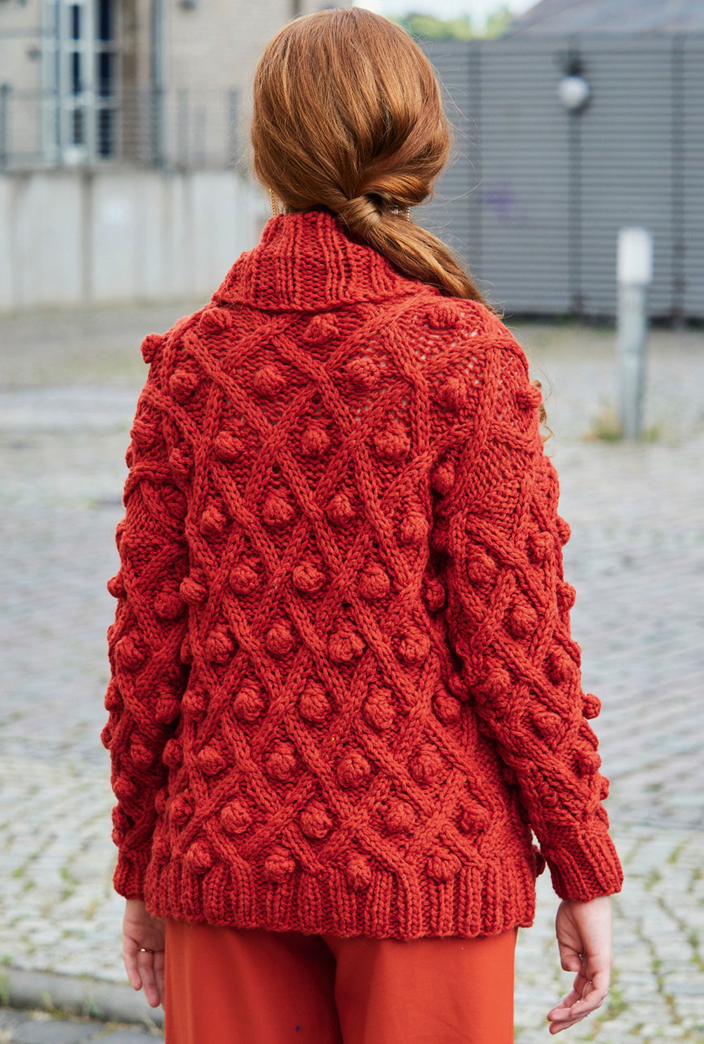 Comeback für Noppen: Bei diesem topmodischen Rolli werden sie in ein Rautengeflecht integriert – sieht stark aus und macht Eindruck! Noppen und verkreuzte Maschen sind sehr typisch für Island und auf den Aran-Inseln – in diesem Design wird gekonnt gezeigt, wie dynamisch und kraftvoll modern die Traditionsmaschen daherkommen können. Das Muster benötigt Anfangs schon Konzentration, aber die übersichtliche und klare Strickschrift in der Anleitung hilft dabei, den Überblick zu bewahren – schnell wirst du feststellen, dass Noppen zu stricken süchtig machen kann! Gestrickt wird in einzelnen Teilen von unten nach oben. Sind alle vier Teile fertig gestrickt, werden noch alle Nähte geschlossen und aus dem Halsausschnitt der Rollkragen im Rippenmuster herausgestrickt.
