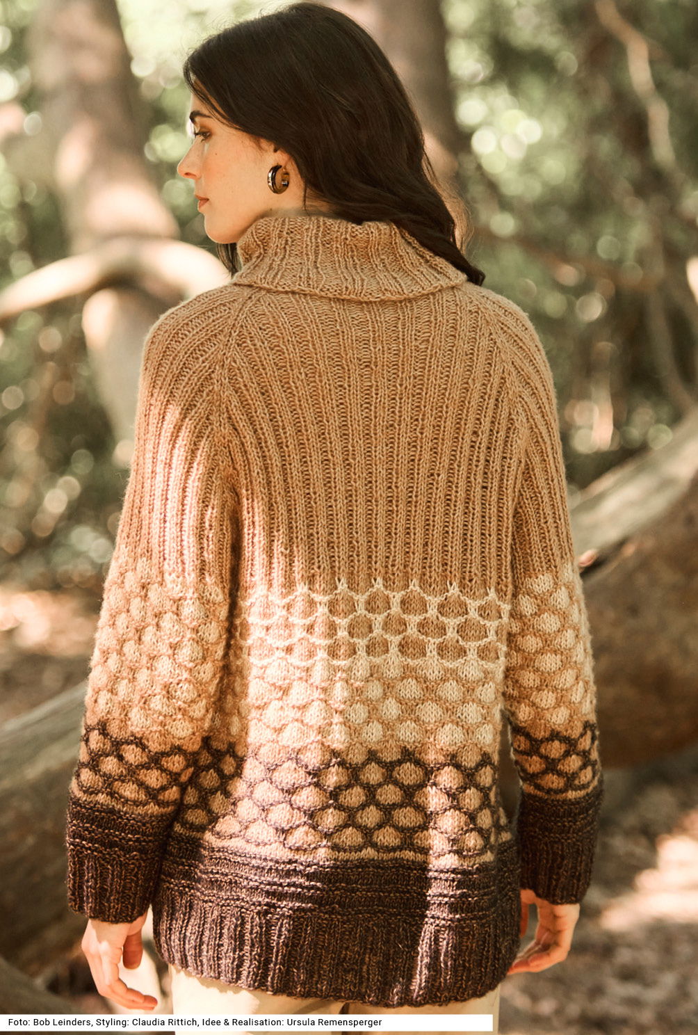 Der bis über die Hüften reichende Raglan-Pullover mit großzügigem Rollkragen ist ein idealer Begleiter für kalte Tage. Er ist aus einem baumwollenen Schlauchgarn gestrickt, in dessen Inneres gefärbte Schurwollfasern eingeblasen werden; es hat einen super soften, wattig zarten Griff. Abwechslungsreiche Muster lassen das Stricken zu einem wahren Vergnügen werden. Am Bund beginnt es mit 2/2-Rippenmuster, gefolgt von Querrippenmuster und Hebemaschenmuster in drei Farben. Die einzelnen Teile werden auf eine Rundstricknadel genommen und die Passe mit betonten Raglanabnahmen im Rippenmuster beendet. Eine Anleitung kann für die Größen 36/38, 40/42 und 44/46 downgeloadet werden.
