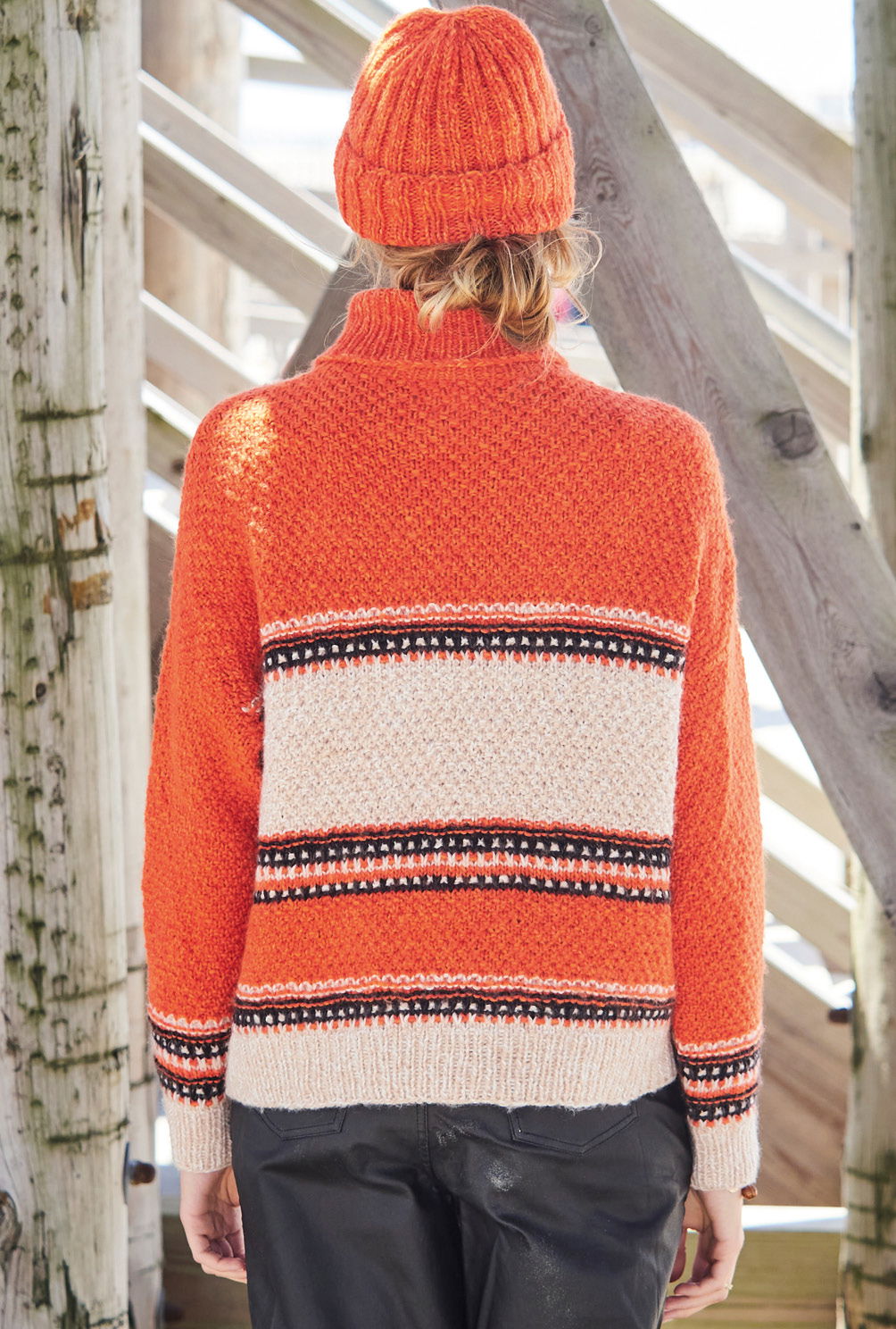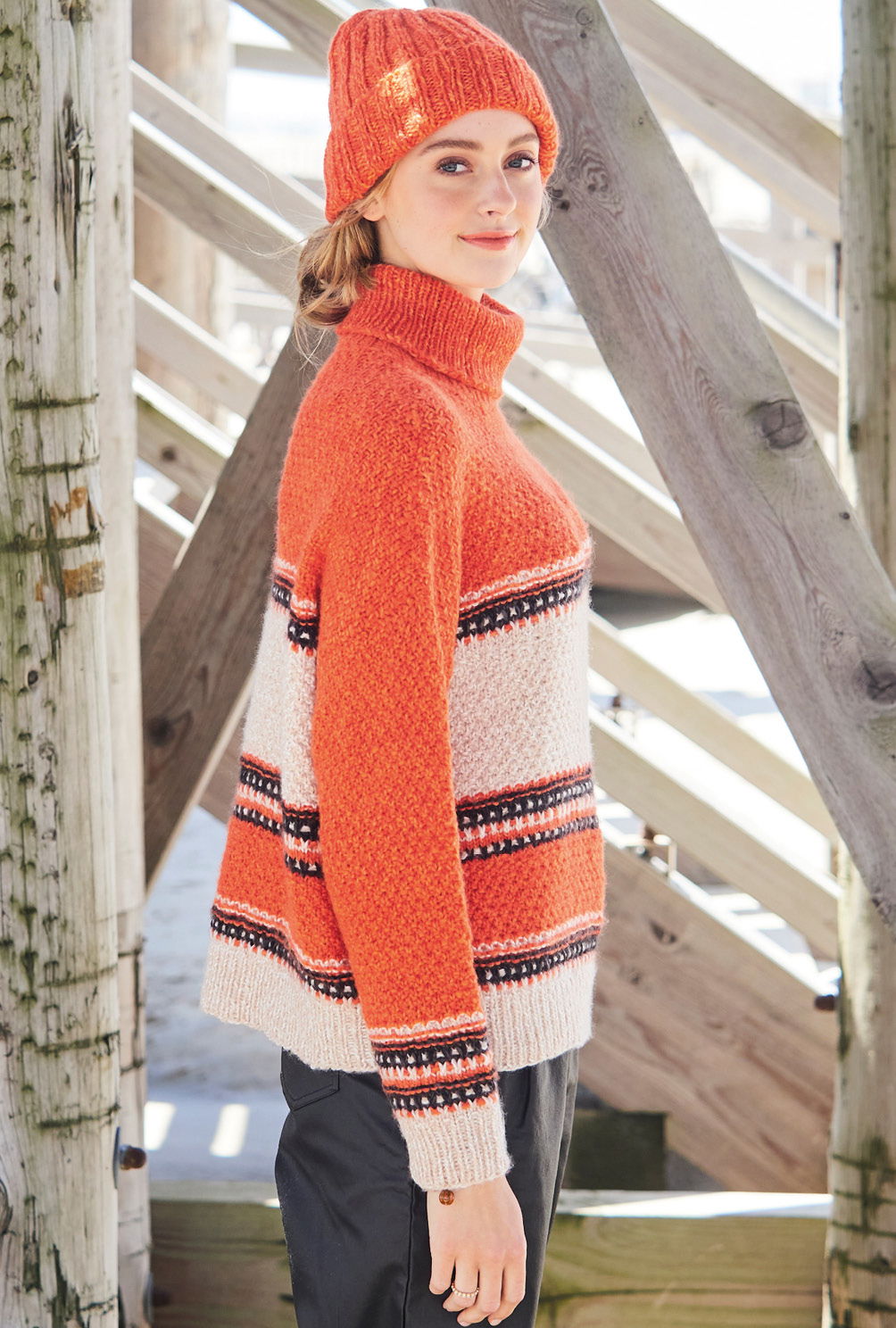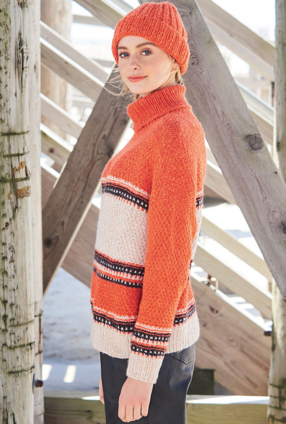 Extra groß und extra kuschelig – so lieben wir Pullis, die für jede Gelegenheit passen. Dieser hier bietet auch noch eine Vielfalt an Mustern: glatt und kraus rechts, kleines und großes Perlmuster sowie ein einfaches Hebemaschenmuster. Farblich hat Orange und Beige die Hauptrolle, Schwarz jedoch unterbricht beim Hebemaschenmuster gekonnt die einzelnen größeren Farbflächen, sodass der Pulli eine lebhafte Anmutung bekommt. Die überschnittenen Schultern und der Rollkragen lassen den Sweater zu einem Rundum-wohlfühl-Pulli werden. Der Rollkragen und die Bündchen werden im 1/1-Rippenmuster gearbeitet, die passende Mütze in 2/2-Rippen. Eine Anleitung gibts für die Größen 36/38, 40/42 und 44/46 sowie für die Mütze in Einheitsgröße.