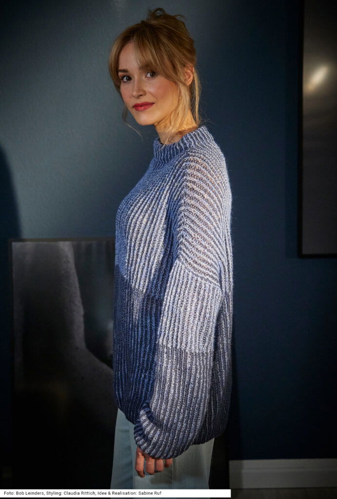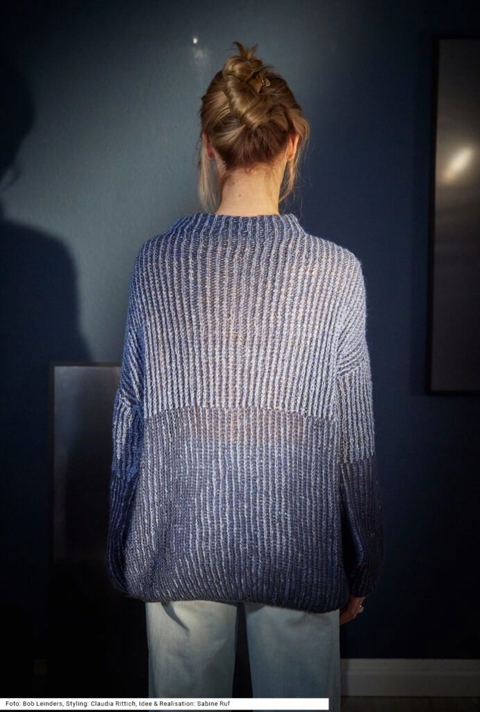 Der Oversize-Pullover mit weiten Ärmeln und überschnittenen Schultern ist nicht nur überaus bequem, sondern schillert dank des zweifarbigen Patentmusters aus dunkelblauem Schurwollgarn mit feinem Alpaka und hellblauem Garn aus Baumwolle, Alpaka, Polyamid und Schurwolle auch herrlich in Meeresfarben. Im unteren Bereich tritt Dunkelblau in den Vordergrund, im oberen Hellblau. Bis zu den Armausschnitten wird in Runden gearbeitet, danach in Reihen, wie auch die Ärmel. Für den Stehkragen wird das Patentmuster in Runden fortgesetzt. Eine Anleitung steht für die Größen 36/38, 40/42 und 44/46 zur Verfügung.