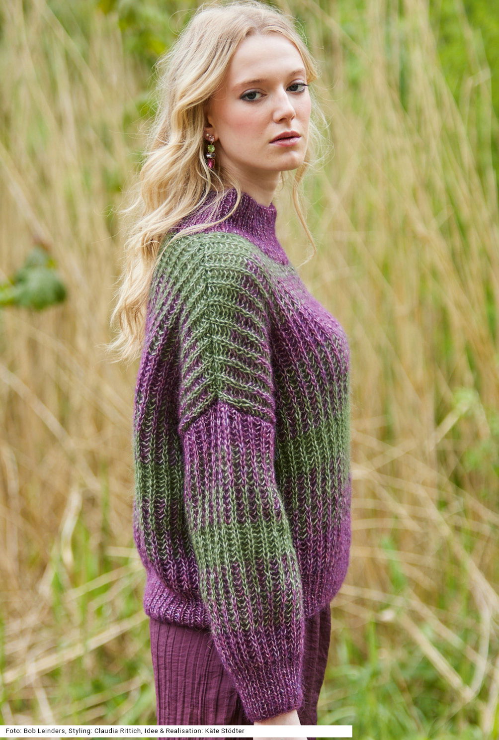 Dieser Pulli aus einem voluminösen Flauschgarn aus Alpaka und Baumwolle ist dank des Oversized-Schnitts besonders bequem und passt perfekt zu lässig geschnittenen Hosen. Gestrickt wird das Modell im zweifarbigen Patentmuster mit harmonisch-fließenden Übergängen zwischen den beiden Farben Oliv und Brombeer. Zweifarbiges Halbpatent ist etwas aufwendiger, aber nicht schwer und das Ergebnis lohnt allemal. Die Bündchen und der Stehkragen werden im 1/1-Rippenmuster gearbeitet. Weite, gerade eingesetzte Ärmel erleichtern das Einnähen. Eine Anleitung steht für die Größen 38/40, 42/44 und 46/48 zur Verfügung.