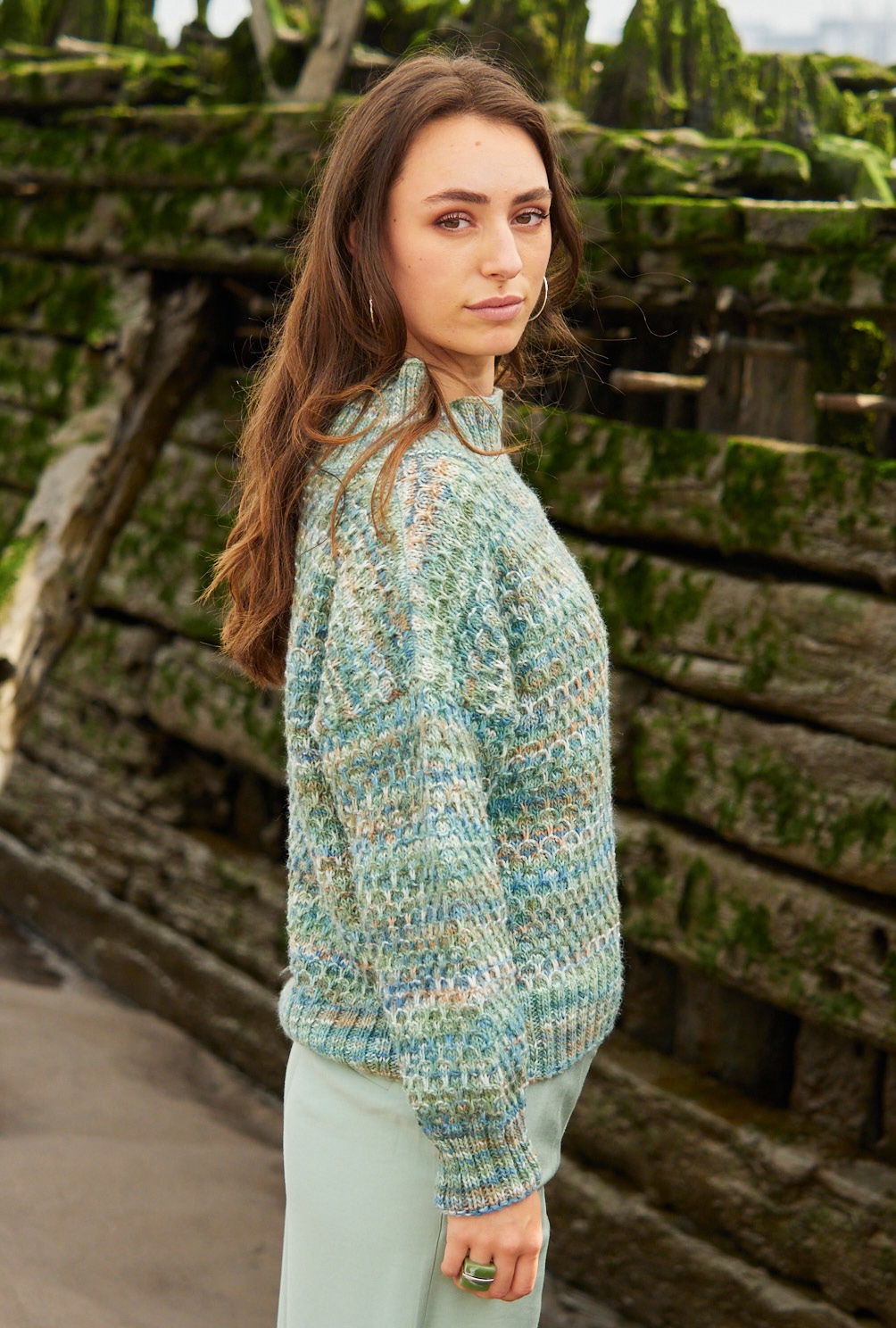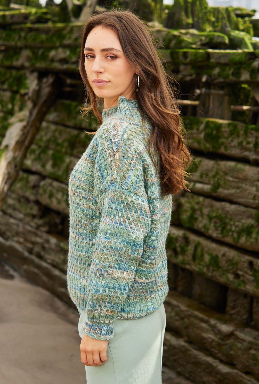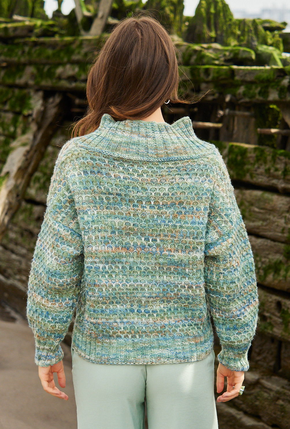 Ein lässig geschnittener Wabenmuster-Pulli mit opulentem Turtleneck-Kragen am breiten runden Halsausschnitt erhält durch das Farbverlaufsgarn seinen besonderen Charakter. Die verschiedenen Blau-, Grün-, Weiß- und Braunnuancen an sich ergeben schon eine Musterung, besonders betont werden sie durch das Hebemaschenmuster. Vorder- und Rückenteil werden nach oben hin immer breiter – deshalb die stark überfallenden Schultern – und auch die Ärmel sind extraweit geschnitten. Das Polyacryl-Schurwolle-Garn lässt sich im Wollwaschprogramm in der Waschmaschine waschen. Eine Anleitung steht für die Größen 38/40, 42/44 und 46/48 zur Verfügung.