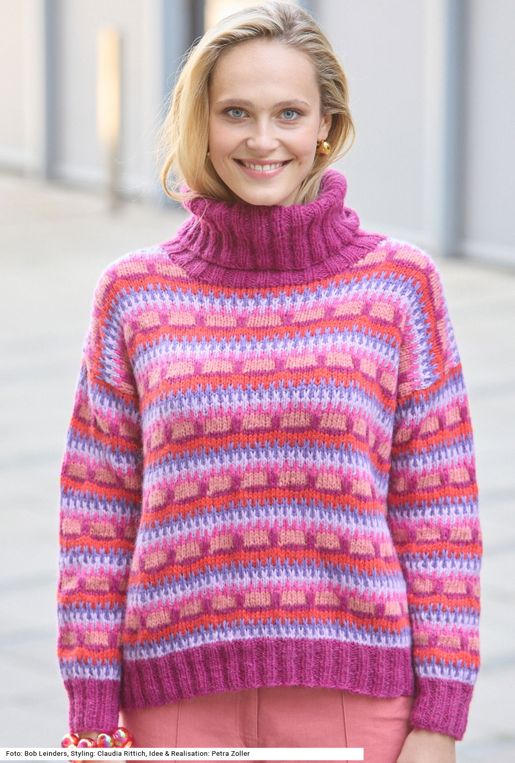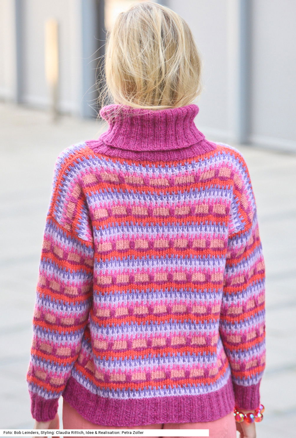 Ein Pullover mit weitem Rollkragen, der mit seinem farbenfrohen Hebemaschenmuster – fast Ton in Ton – begeistert. Die Bündchen und der Rollkragen sind im 2/2-Rippenmuster in nur einer Farbe gestrickt. Dank des flauschigen Garns aus Alpaka, Baumwolle und Schurwolle hält er zudem rundum warm. Der Schnitt ist ganz schlicht, Vorder- und Rückenteil werden bis zu den Armausschnitten in Runden gestrickt, die in Reihen gearbeiteten Ärmel sind gerade eingesetzt, was das Einnähen erleichtert. Eine Anleitung steht für die Größen 38/40, 42/44 und 46/48 zur Verfügung.