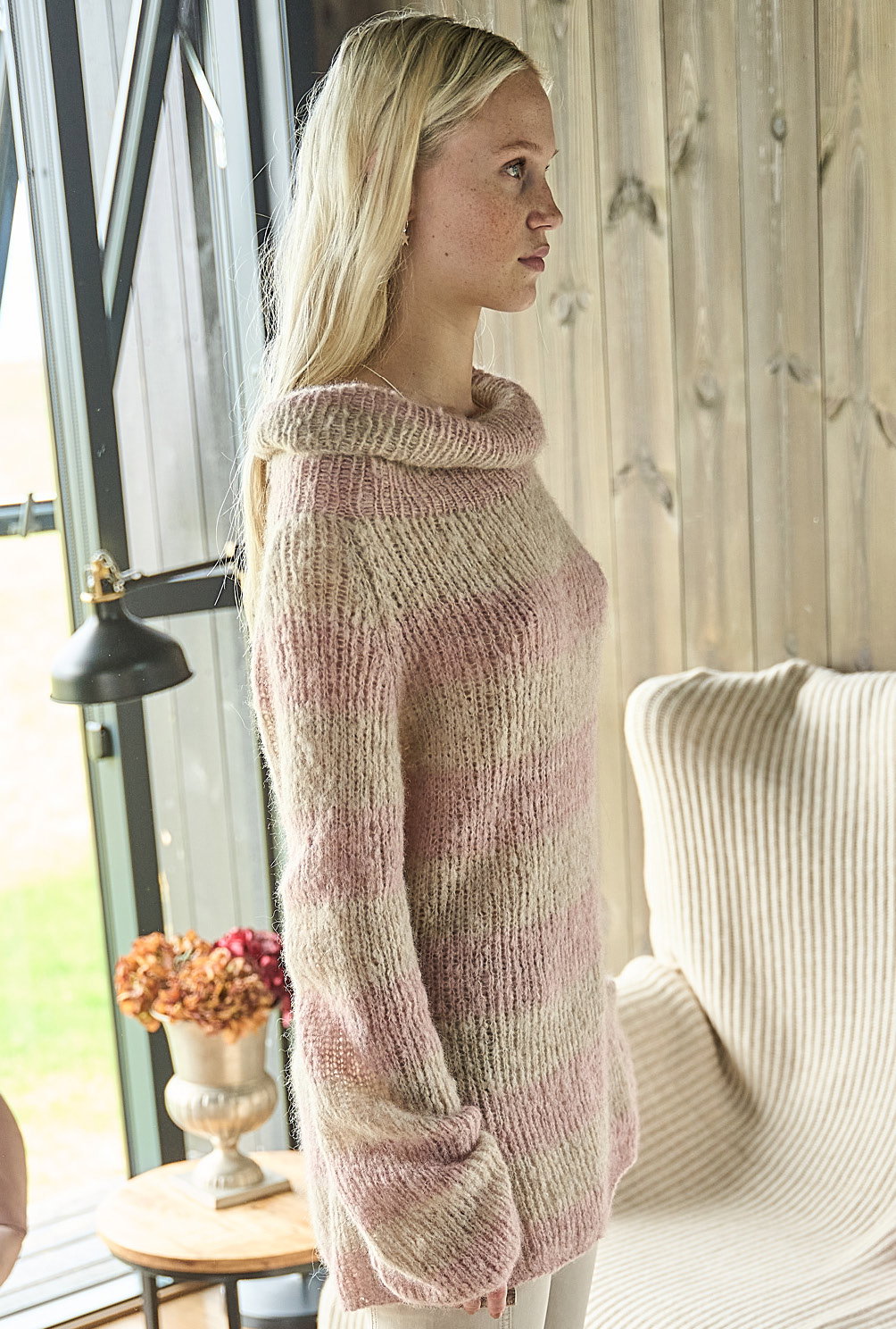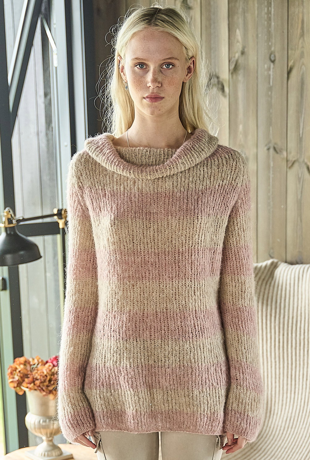 Ein zwangloser Look, an den sich auch Strickneulinge wagen können: Das exklusive Alpakamischgarn wird hier streifenweise glatt rechts gestrickt und lässt einen locker fallenden Raglanpulli entstehen. Besonders harmonisch wirkt die Farbkombination in Beige und Altrosa, die dem Teint jeder Frau schmeichelt. Weich umhüllt wird die Schulterpartie durch den locker fallenden Kragen, lange Ärmel sorgen für den modischen Touch. In Größe 36/38, 40/42 und 44/46 entsteht ein Lieblingsstück, das sich jedem Style perfekt anpasst.