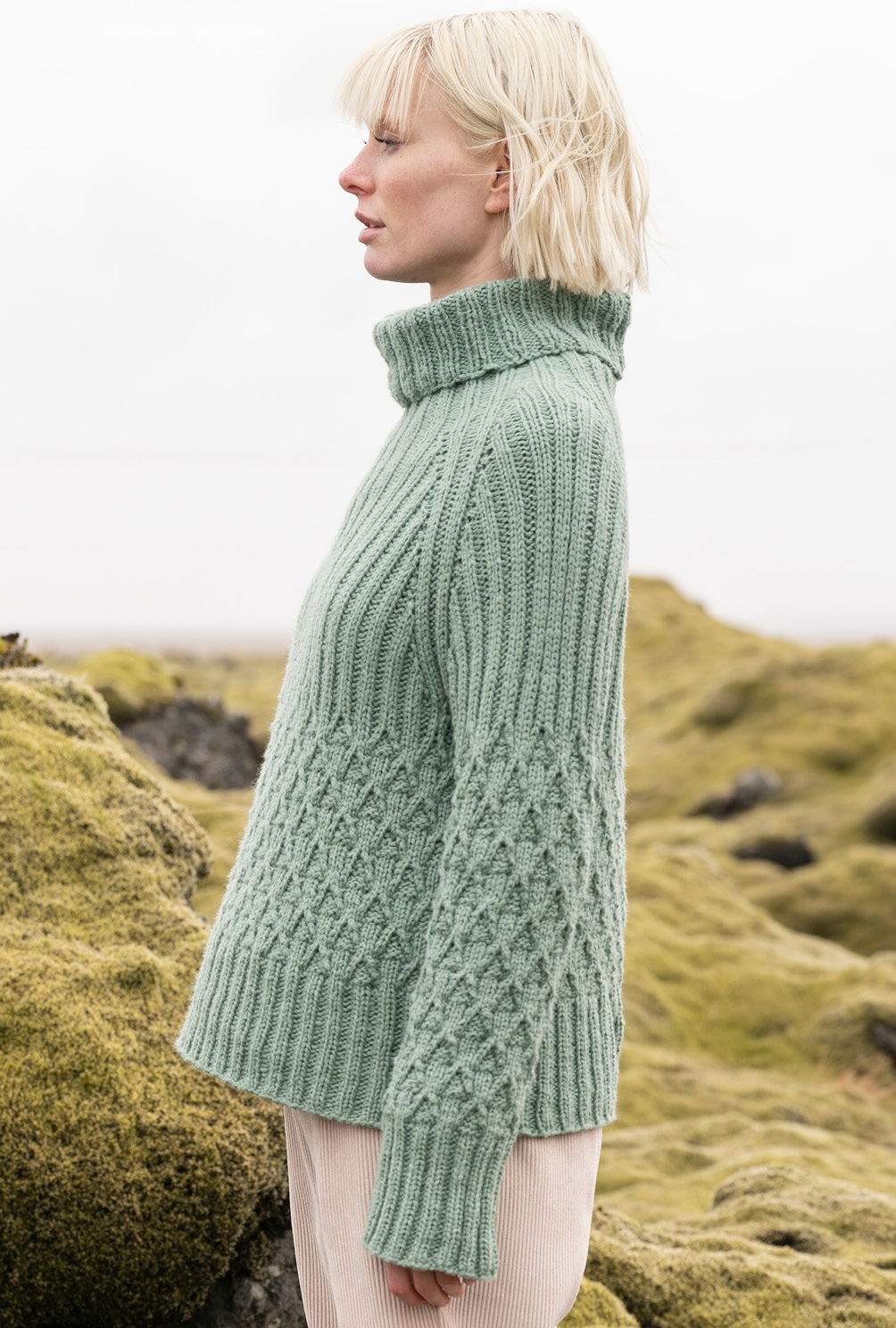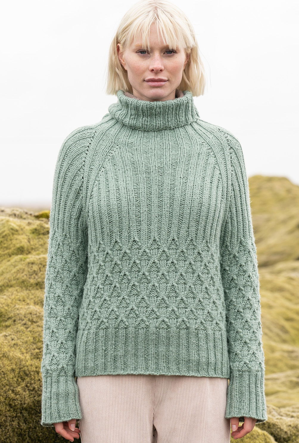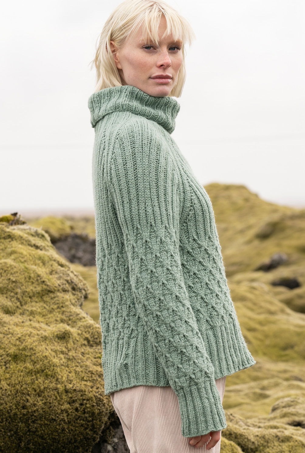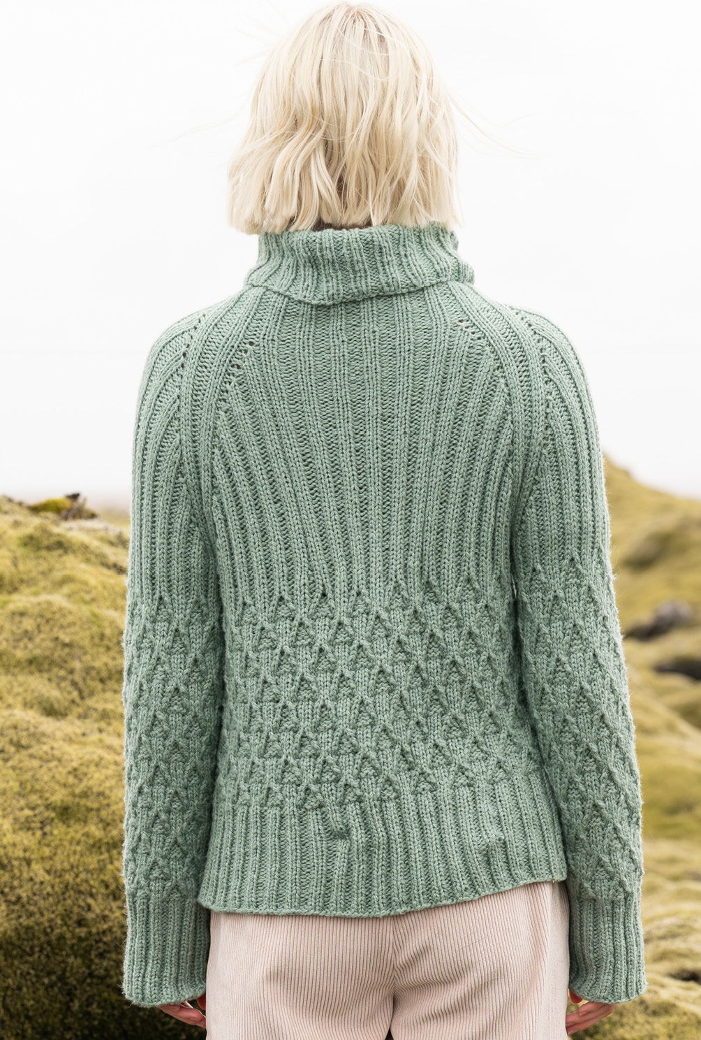 Top-down heißt hier die Devise, denn dieser Pulli wird in einem Stück von oben nach unten in Runden gestrickt. Begonnen wird also am Rollkragen, dann erfolgt die Einteilung für die Ärmel sowie für Rücken- und Vorderteil. Keine Angst, wir haben das in unserer Anleitung genau beschrieben. Nach der Fertigung der Raglanschrägungen werden die Teile jeweils in Runden im Zopf-Rautenmuster weitergearbeitet und enden mit hohen Rippenbündchen. Es entfällt also das lästige Konfektionieren der Nähte und du kannst ihn sofort anziehen.