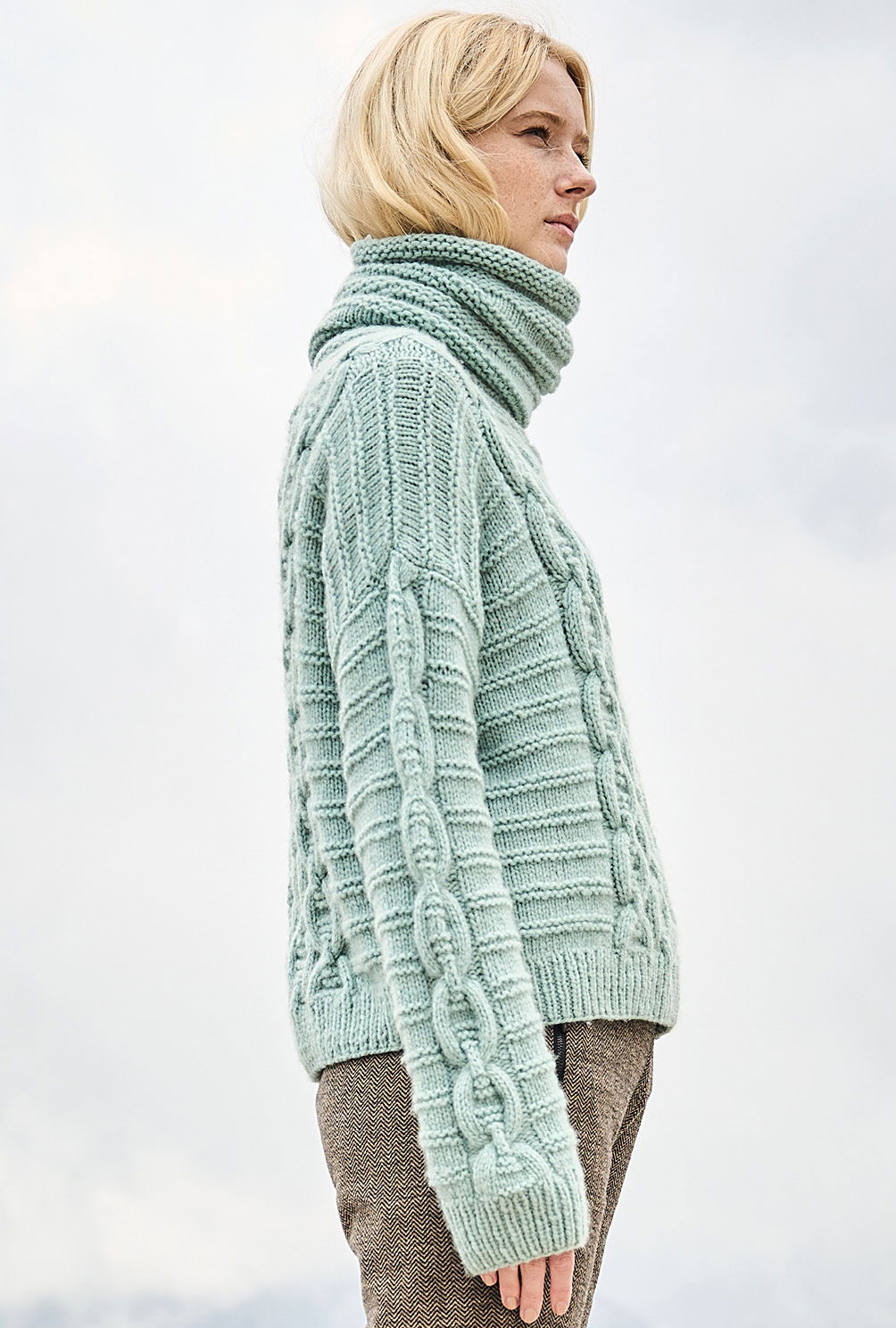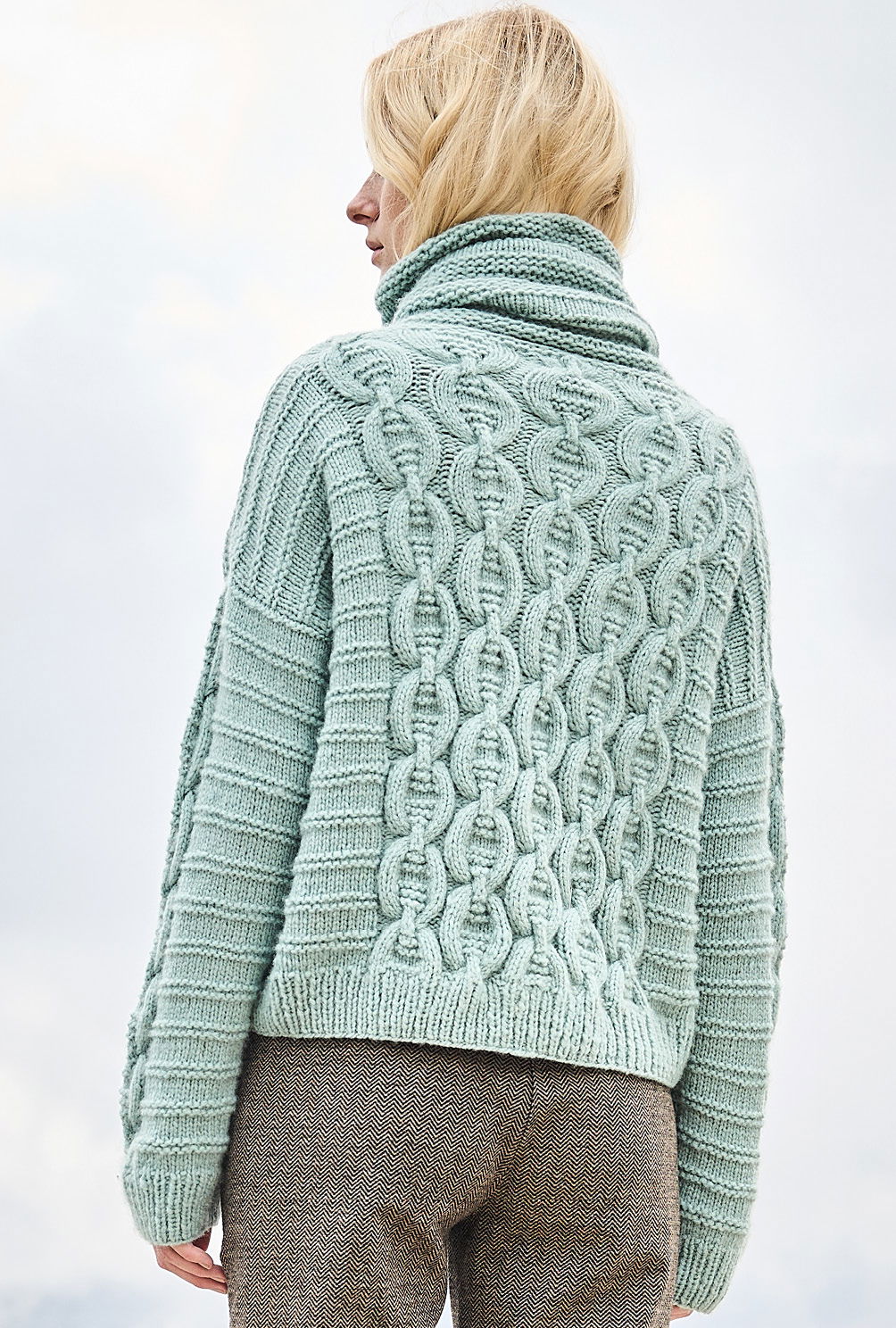 Material: 425 (450) 475 g Mint (Fb 14) "Cashmere Moda" (65% Schurwolle, 25% Kaschmir, 10% Polyester, LL = 90 m/25 g) von LANA GROSSA. Je 1 Paar Stricknadel Nr 6 und 6,5 sowie je 1 Rundstricknadel Nr 6 und 6,5.