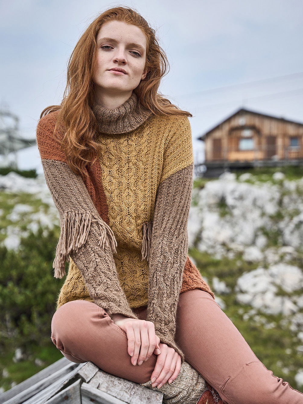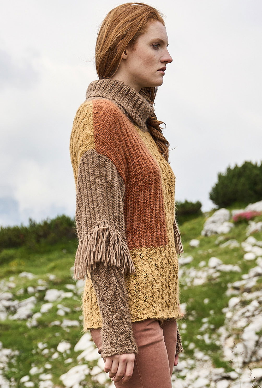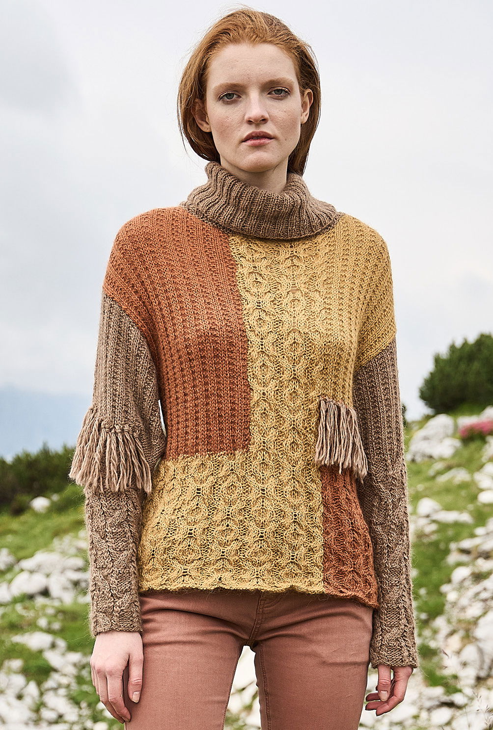 Material: Je 250 (300) 350 g Mais (Fb 102904) und Hellbraun (Fb 102903) und 100 (150) 200 g Terra (Fb 102905) "Woll Butt Alpaka" (70% Alpaka, 30% Polyamid, LL = 125 m/50 g) von BUTTINETTE. 1 Paar Stricknadel Nr 5 sowie 1 Rundstricknadel Nr 5 und 1 Häkelnadel Nr 4,5.