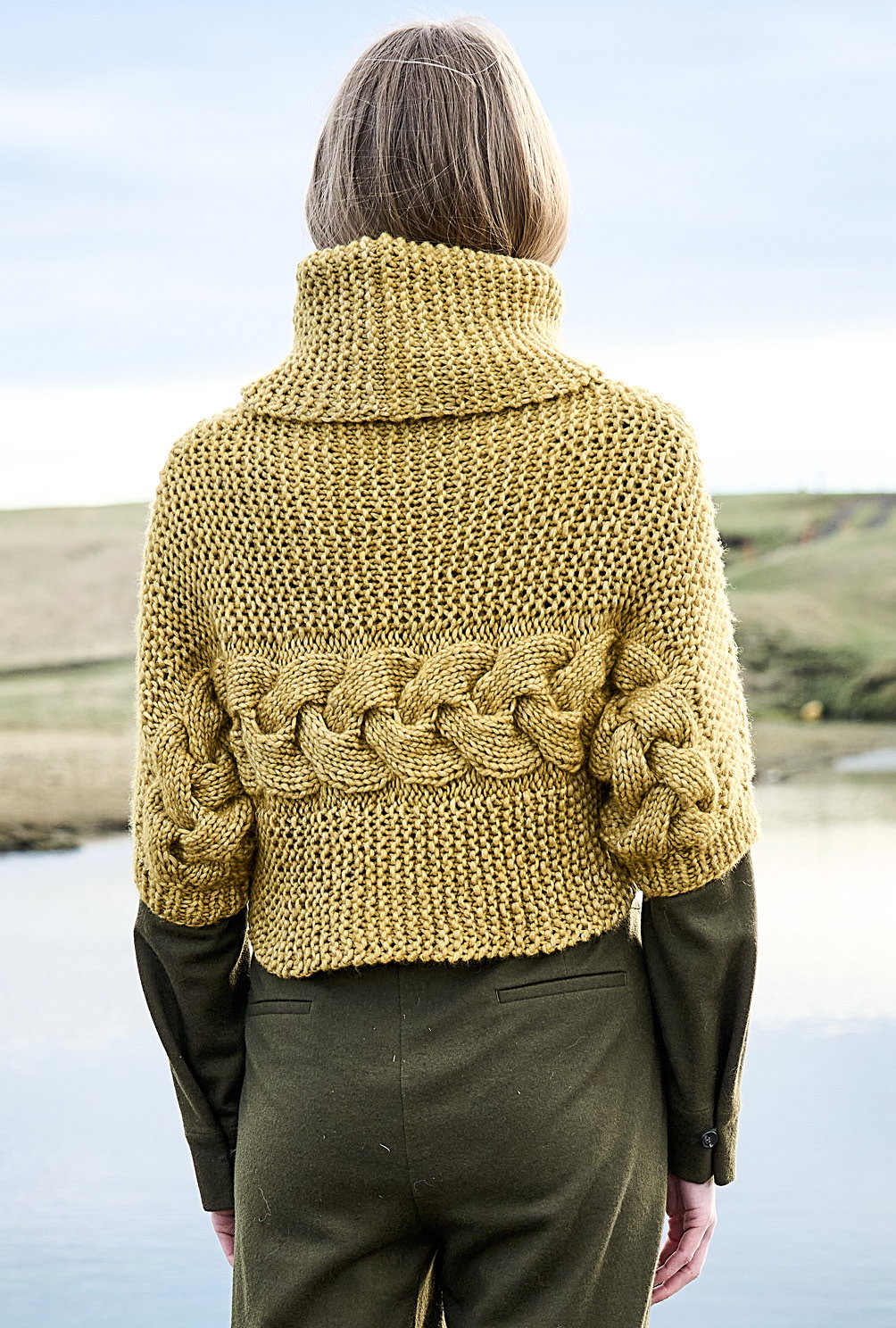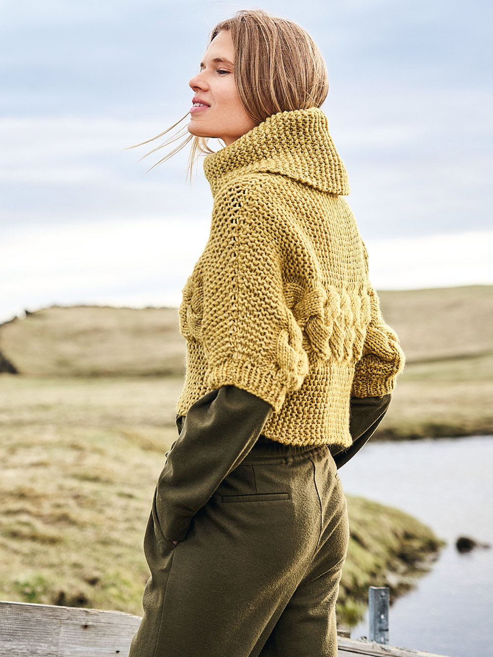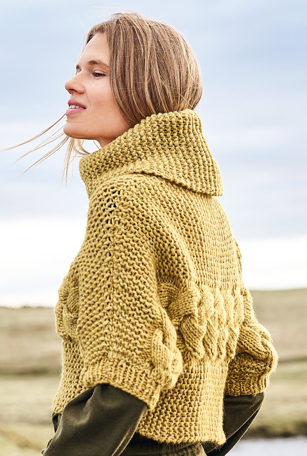 Kurz und gut: Von Ärmel zu Ärmel genadelt, steht hier das zitronengelbe Grobstrickgarn im Mittelpunkt. Daraus entsteht ein kesser Überzieher, dessen markanter Zopf zwischen Kraus-rechts-Streifen toll zu Geltung kommt. Hohe Schulter- und Ärmelschrägungen garantieren den perfekten Sitz dieses modischen Maschenhighlights. Den voluminösen Kragen strickst Du separat und nähst ihn zum Schluss in den Halsausschnitt. Tipp: Wer es lieber etwas länger mag, schlägt an der Seitenkante einfach ein paar Maschen mehr an.