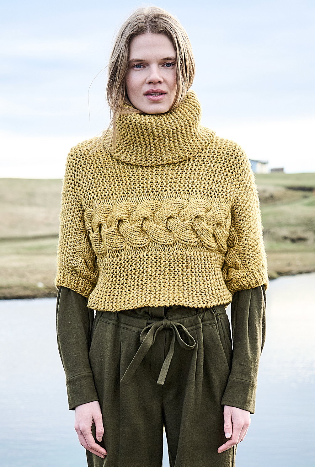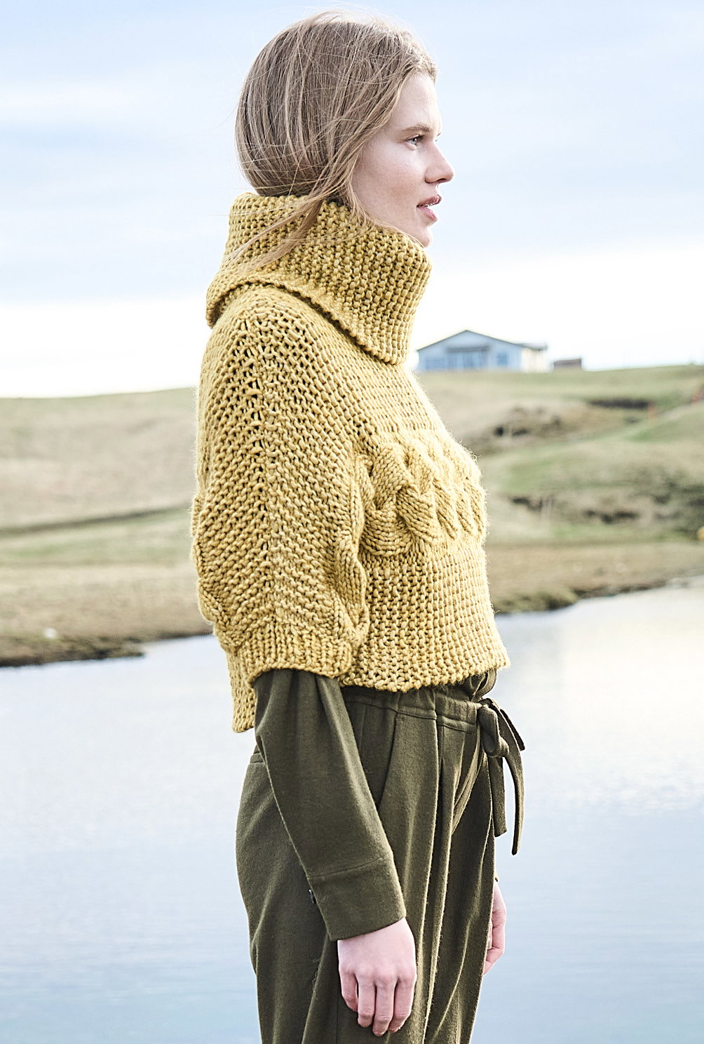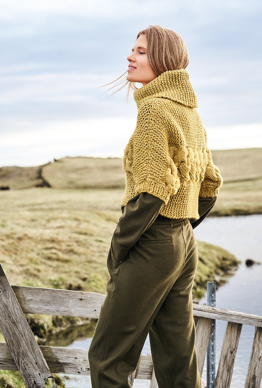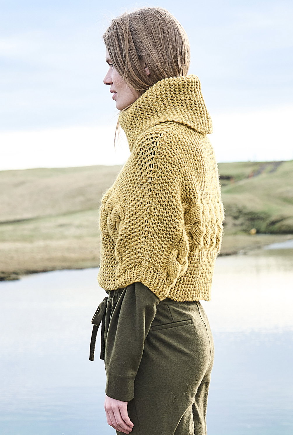 Kurz und gut: Von Ärmel zu Ärmel genadelt, steht hier das zitronengelbe Grobstrickgarn im Mittelpunkt. Daraus entsteht ein kesser Überzieher, dessen markanter Zopf zwischen Kraus-rechts-Streifen toll zu Geltung kommt. Hohe Schulter- und Ärmelschrägungen garantieren den perfekten Sitz dieses modischen Maschenhighlights. Den voluminösen Kragen strickst Du separat und nähst ihn zum Schluss in den Halsausschnitt. Tipp: Wer es lieber etwas länger mag, schlägt an der Seitenkante einfach ein paar Maschen mehr an.