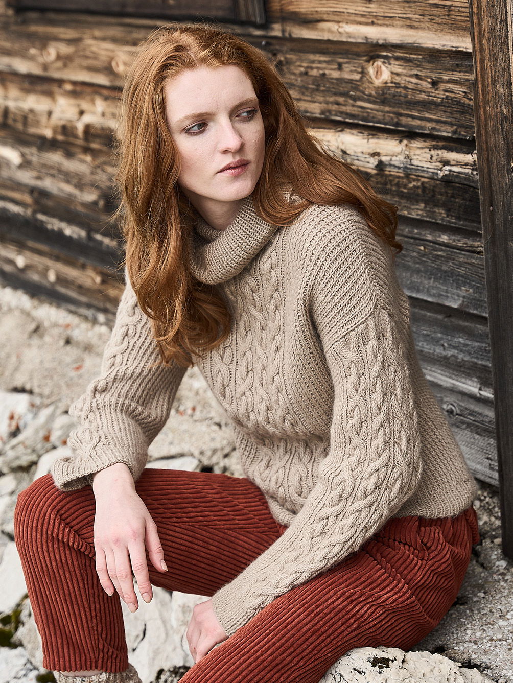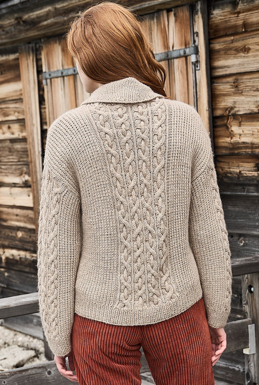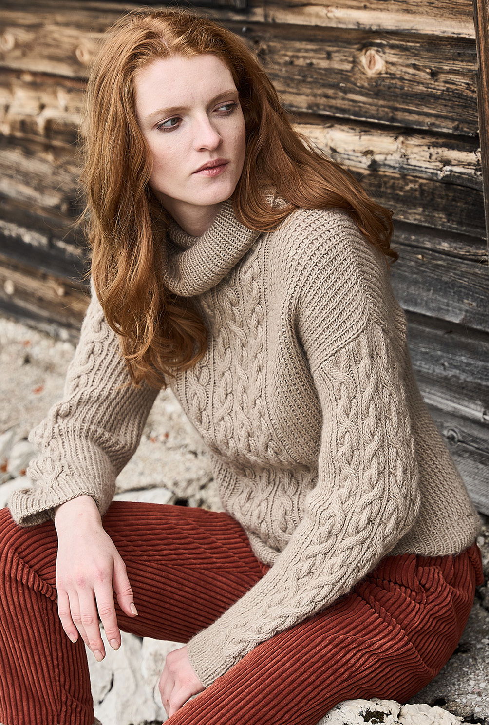Material: 800 (800) 900 g Khaki (Fb 66) "Moonshine" (40% Schurwolle, 40% Alpaka, 20% Seide, LL = 180 m/100 g) von JUNIPER MOON. 1 Paar Stricknadel Nr 5 sowie 1 Rundstricknadel Nr 5.