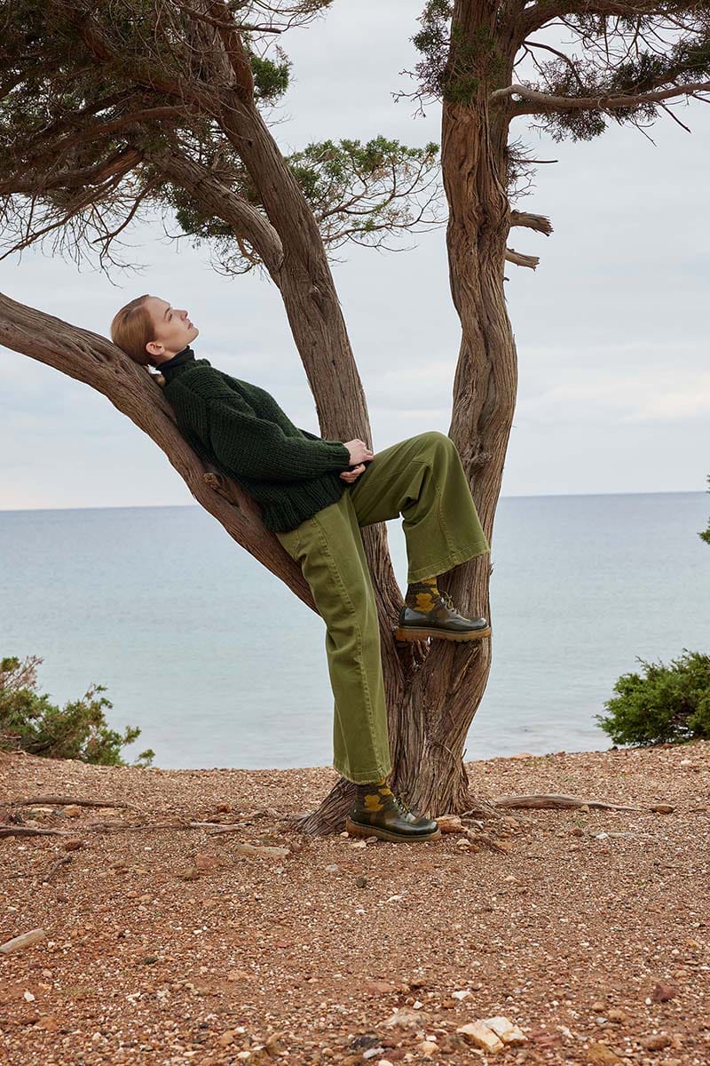 The TREE OF LIFE sweater combines a simple silhouette with striking statement decreases on the sleeves, mimicking the graceful taper of tree branches. Crafted from warm, super bulky yarn, it is an ideal layer for crisp, chilly days.