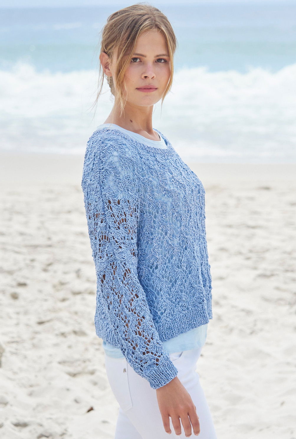 Der kurz geschnittene Pulli wird nach oben hin immer breiter und erhält dadurch eine weit überschnittene Schulterpartie. Zum Sommer passend ist das besonders luftige Allover-Ajourmuster, es verläuft wellenförmig nach oben. Das Baumwollgarn mit Seide und Viskose schimmert leicht und verleiht dem Pullover dadurch eine edle Note. Die Bündchen und die Blende am weiten runden Halsausschnitt sind in 1/1-Rippen gearbeitet. Nicht nur ein weißes T-Shirt darunter, auch ein durchblitzender Bikini betonten das zarte Ajourmuster. Eine Anleitung für die Größen 36/38 und 40/42 sowie 44/46 steht zum Download bereit.