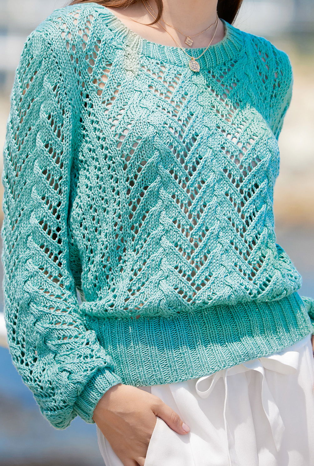 Dieser Lochmusterpulli ist in jeder Hinsicht ein Klassiker. In 4 Teilen gestrickt verleiht das 10 cm hohe Bündchen dem Pulli einen sehr guten Sitz auf Hüfthöhe. Das Ajourmuster bekommt durch integrierte Zöpfe das besondere Etwas und ein strapazierfähiges Garn mit leichtem Glanz unterstreicht das Strickmuster mit zartem Lüster. Die gemäßigten Keulenärmel verleihen dem Pullover dann den modischen, lässig-femininen Dreh. So entsteht ein Allrounder, der zu Hosen ebenso gut passt, wie zu Röcken. Insbesondere die Kombination mit weiten, weich schwingenden Röcken mit feinen, floralen Motiven wird jede Romantikerin beglücken. Auch wenn das Muster ein wenig Konzentration erfordert, ist der Sommerpulli mit Nadelstärke 5 kein Hexenwerk und recht schnell fertig gestrickt.