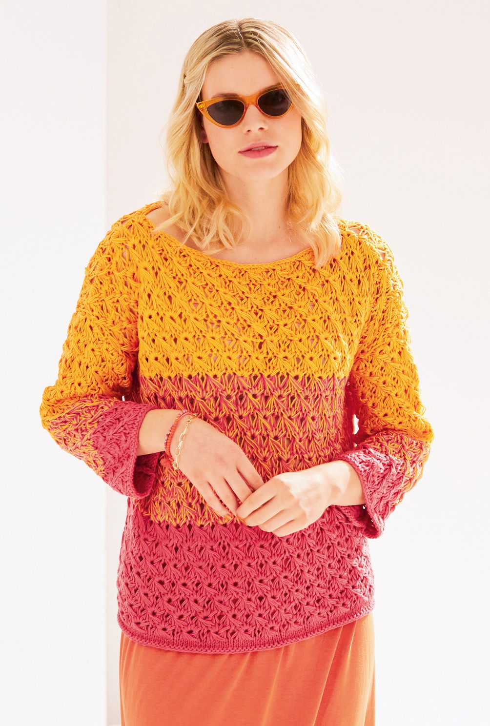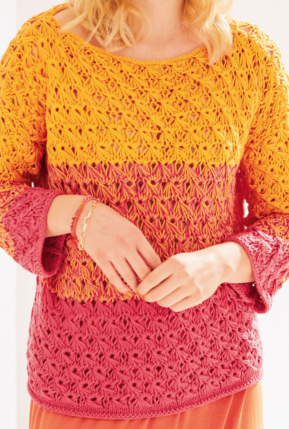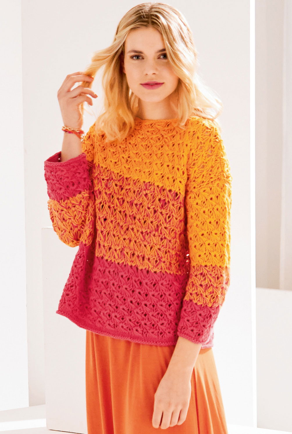 Welch Leuchtkraft – dieser Pulli!. Den weichen Übergang von Rot zu Orange erreichst du durch doppelte Fadenführung und bei der mittleren Farblfäche das Arbeiten mit beiden Fäden zusammen. Das dekorative Schlingenmuster entsteht durch zusammengestrickte Maschen, Umschläge und Fallmaschen und macht denSommersweater im lebhaften Colour-Blocking zum absoluten Must-Have. Damit du dich voll und ganz auf das Muster konzentrieren kannst, wurde der Schnitt schlicht gerade gehalten, was auch perfekt zu den Blockstreifen passt. Eine genaue Strickschrift erleichtert das Nachstricken des sonnigen Traumteiles. Mit dieser Strickanleitung mit mittlerem Schwierigskeitsgrad, kannst du den Pullover in den Größen 36/38, 42/44 und 48/ 50 stricken.