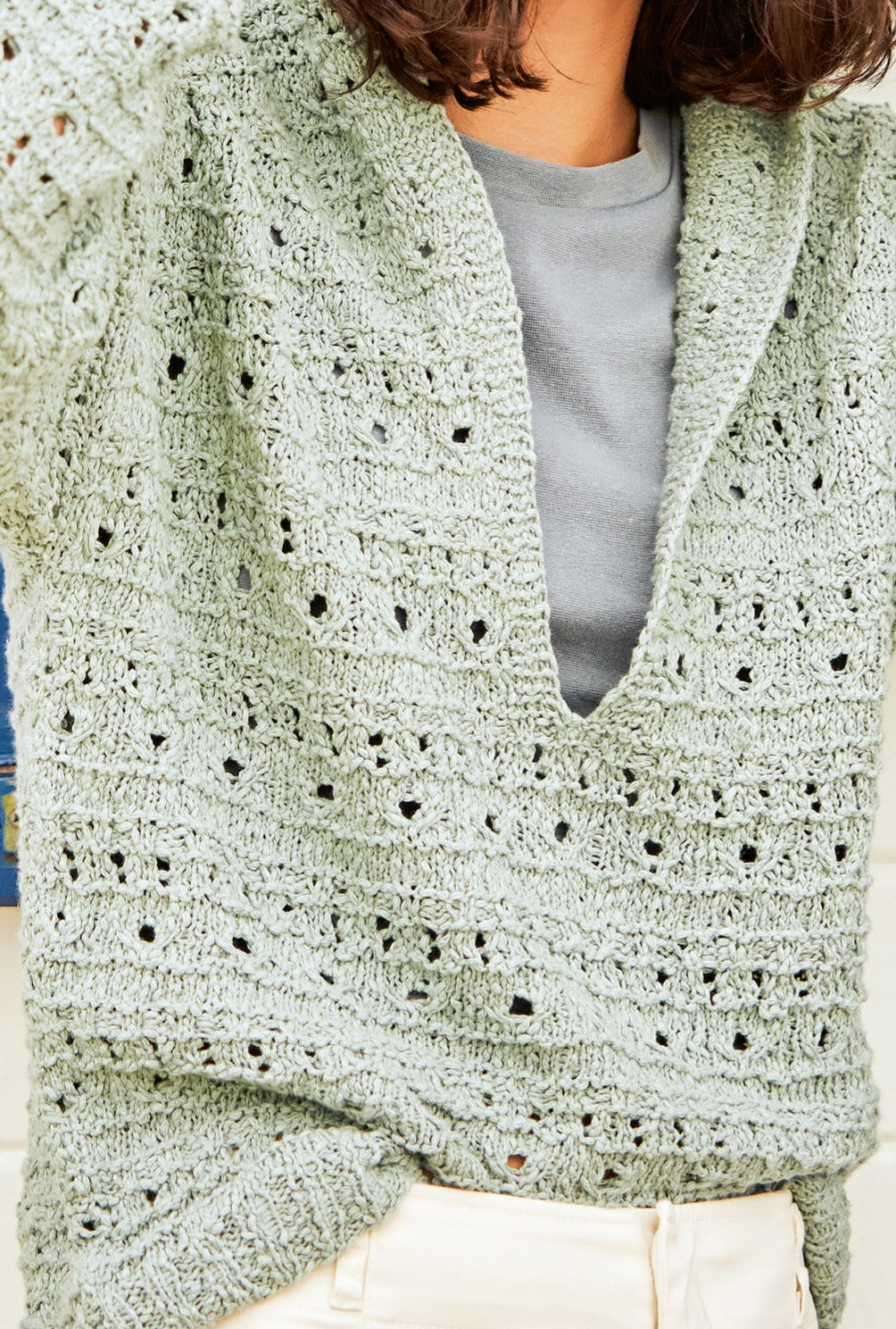 Genau das Richtige, wenn eine frische Brise aufkommt: der trendige Hoodie im Mustermix aus einem dezent genopptem Baumwollgarn macht einfach alles mit! Unterschiedliche Rippen- und Strukturmuster wechseln sich mit kraus rechts und glatt rechts gestrickten Partien ab und bilden mit den feinen Noppen des Garns ein harmonisches Zusammenspiel. Verkreuzte Maschen und Umschläge sorgen für Leichtigkeit im Muster, die übersichtliche Strickschrift wiederum sorgt dafür, dass stets der Überblick gewahrt bleibt. Begonnen wird das Strickvergnügen mit dem Rückenteil, dann das Vorderteil mit dem tiefen Schlitz, dessen Blenden gleich in kraus rechten Maschen mitgestrickt werden. Nach der Fertigstellung der Ärmel geht es dann an die Kapuze. Dafür werden erst einmal die Schulternähte geschlossen, dann die zuvor stillgelegten Maschen des rechten Vorderteils, des Rückenteils und des linken Vorderteil mit einer Rundstricknadel aufgefasst und schließlich die Kapuze in glatt rechts mit direkt angestrickten Blenden in kraus rechts gearbeitet. Zum Schluss noch die Ärmel einsetzen und die Seitennähte schließen.