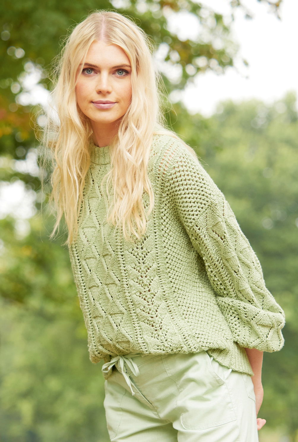 Wenn du gerne Muster strickst und Abwechslung liebst, liegst du bei diesem Pullover genau richtig! Klassische Rippen, Lochrippen, Ajour-Blütenranken und Rautenstreifen lassen beim Stricken keine Langeweile aufkommen. Die einzelnen Muster sind nicht allzu schwierig und kleine Maschenmarkierer zwischen den einzelnen Musterstreifen erleichtern dir die Übersicht. Das pillingarme Kettengarn mit Pima-Baumwolle ist angenehm elastisch und eignet sich daher besonders gut für unbeschwertes Mustervergnügen. Der Pulli wird in vier Teilen mit Nadeln Nummer 5 gestrickt, lediglich die Blenden benötigen eine kleinere Nadelstärke: Erst das Rückenteil, dann das Vorderteil mit dem runden Halsausschnitt und dann die Keulenärmel. Sowohl der Halsausschnitt, als auch die Ärmel, erhalten ganz zum Schluss noch eine Rippenblende. Die Blende des Ausschnitts wird dann noch zur Hälfte nach innen umgesäumt.