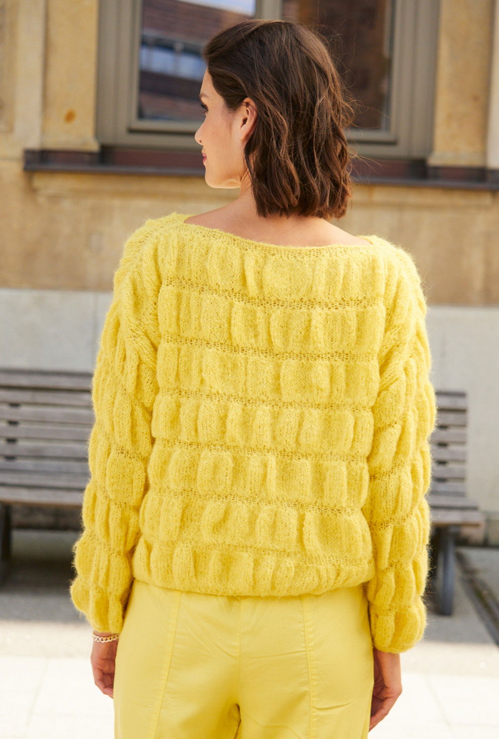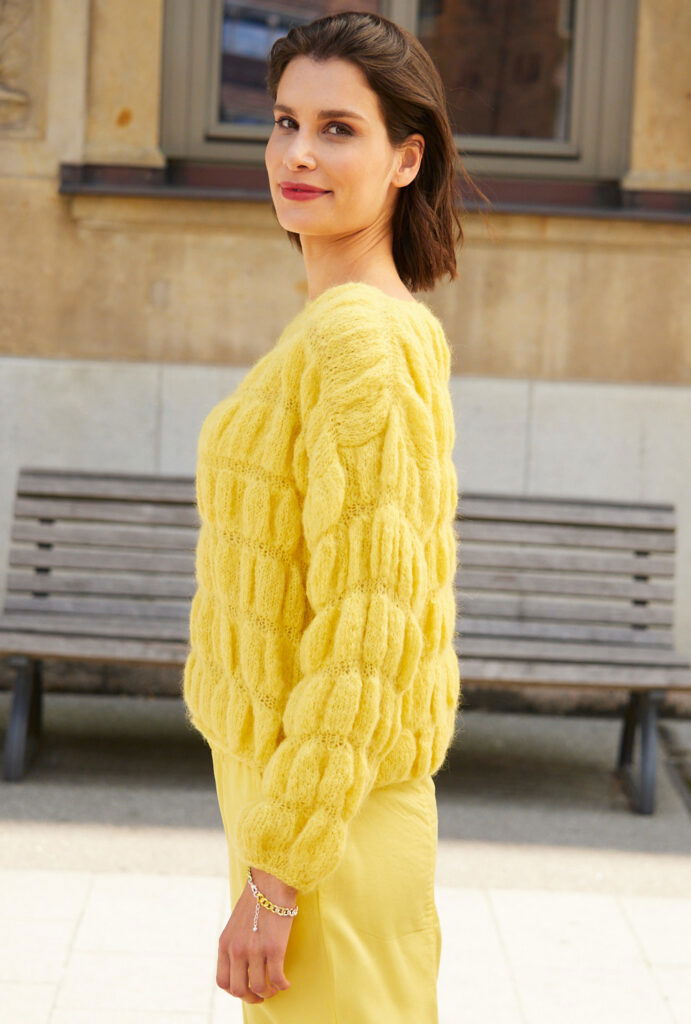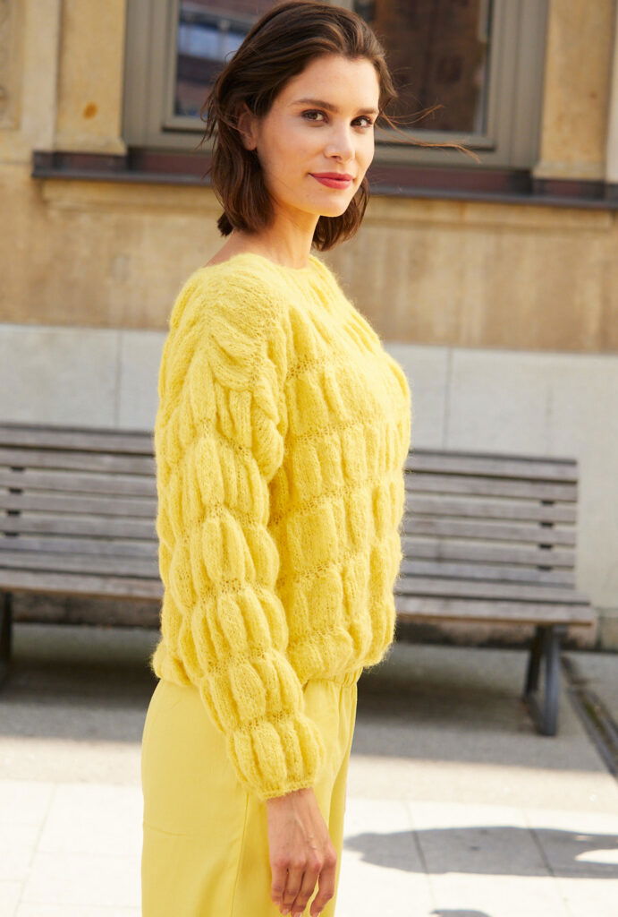 Sehr feminin und gleichzeitig sehr lässig kommt dieser Oversize-Pullover aus einem edlen Alpaka-Seide-Schurwolle-Mischgarn daher. Die leuchtend gelbe Farbe, der sportlich wirkende U-Boot-Ausschnitt sowie das prägnante Smokmuster ziehen die Blicke auf sich. Das Muster geht ganz einfach: Es wird grundsätzlich glatt rechts gestrickt, dabei werden nach ein paar Reihen in jede Masche drei Maschen gearbeitet, die wiederum nach ein paar Reihen abgenommen werden. Für die schmale Blende am Saum und den Ärmelrändern werden 2 Reihen kraus rechts gestrickt, der U-Boot-Ausschnitt ist mit 1 Runde Kettmaschen umhäkelt. Eine Anleitung gibts für die Größen 36/38, 40/42 und 44/46.