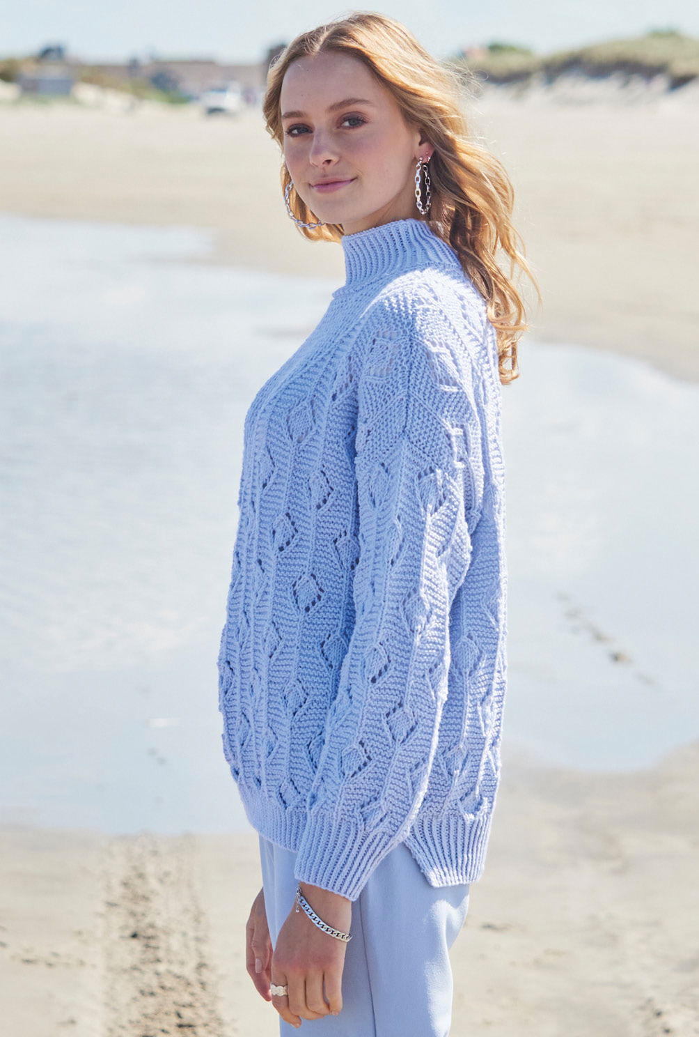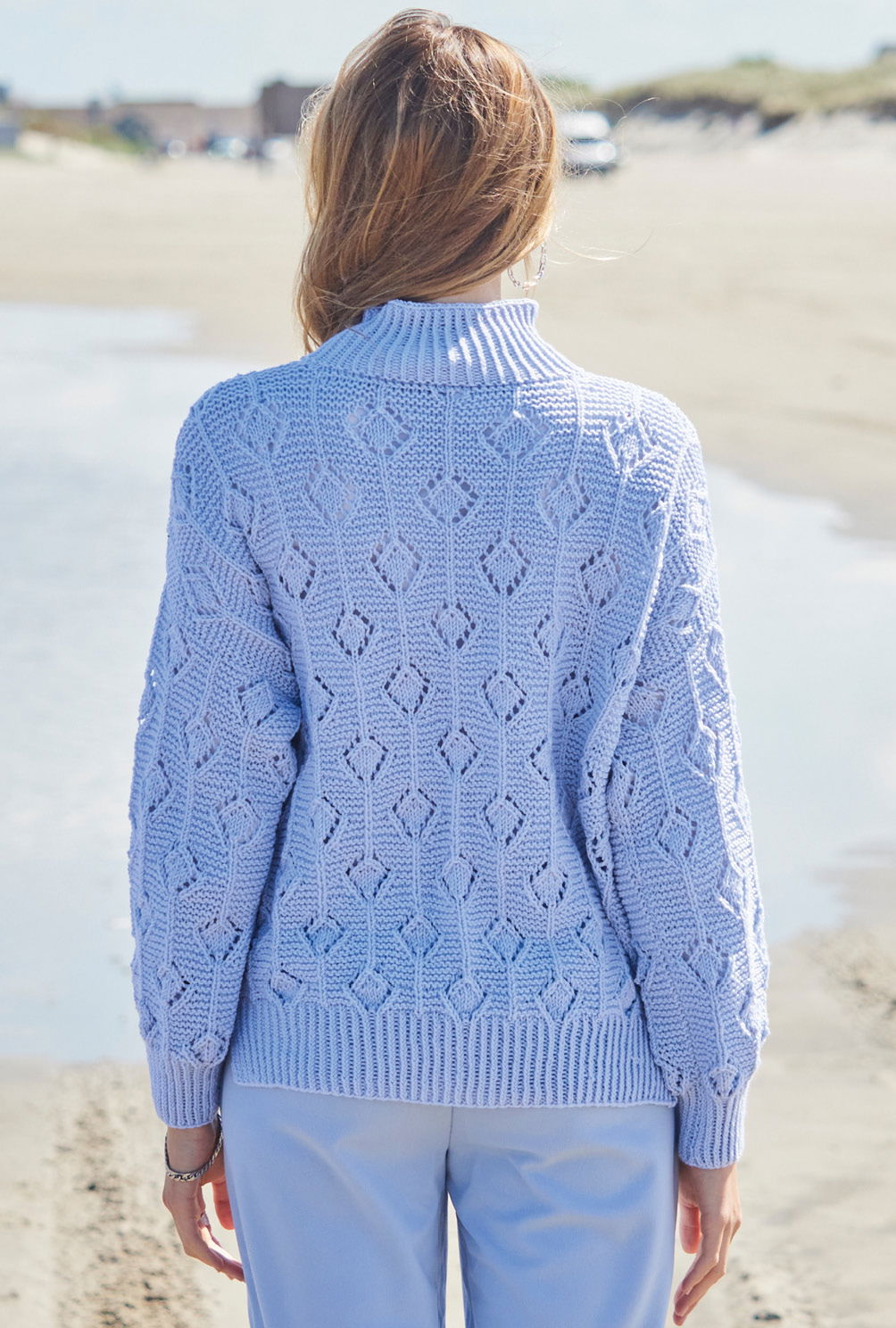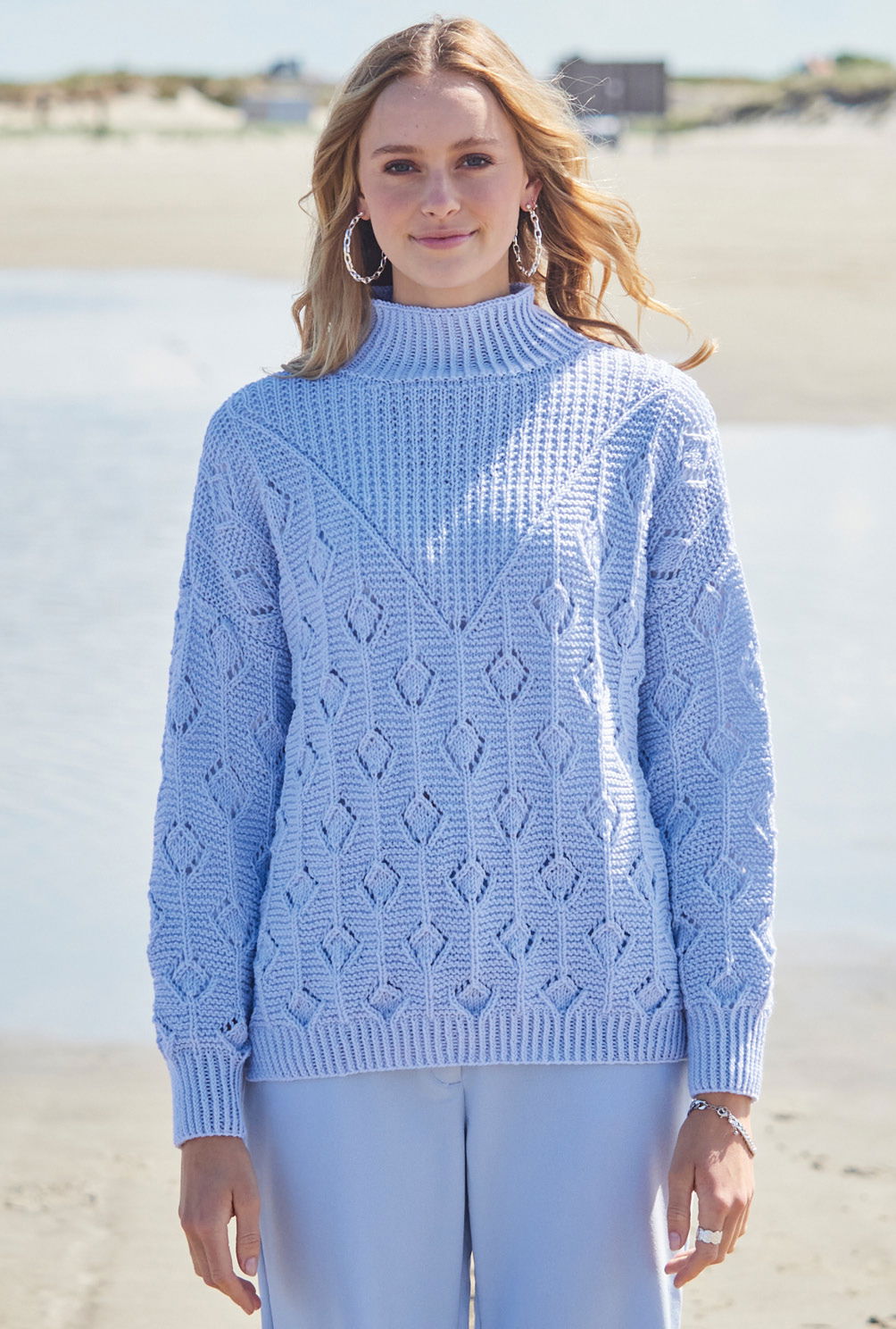Sabrina Strickjournal Hellblauer Pulli mit Ajourmuster und Rippenpasse
