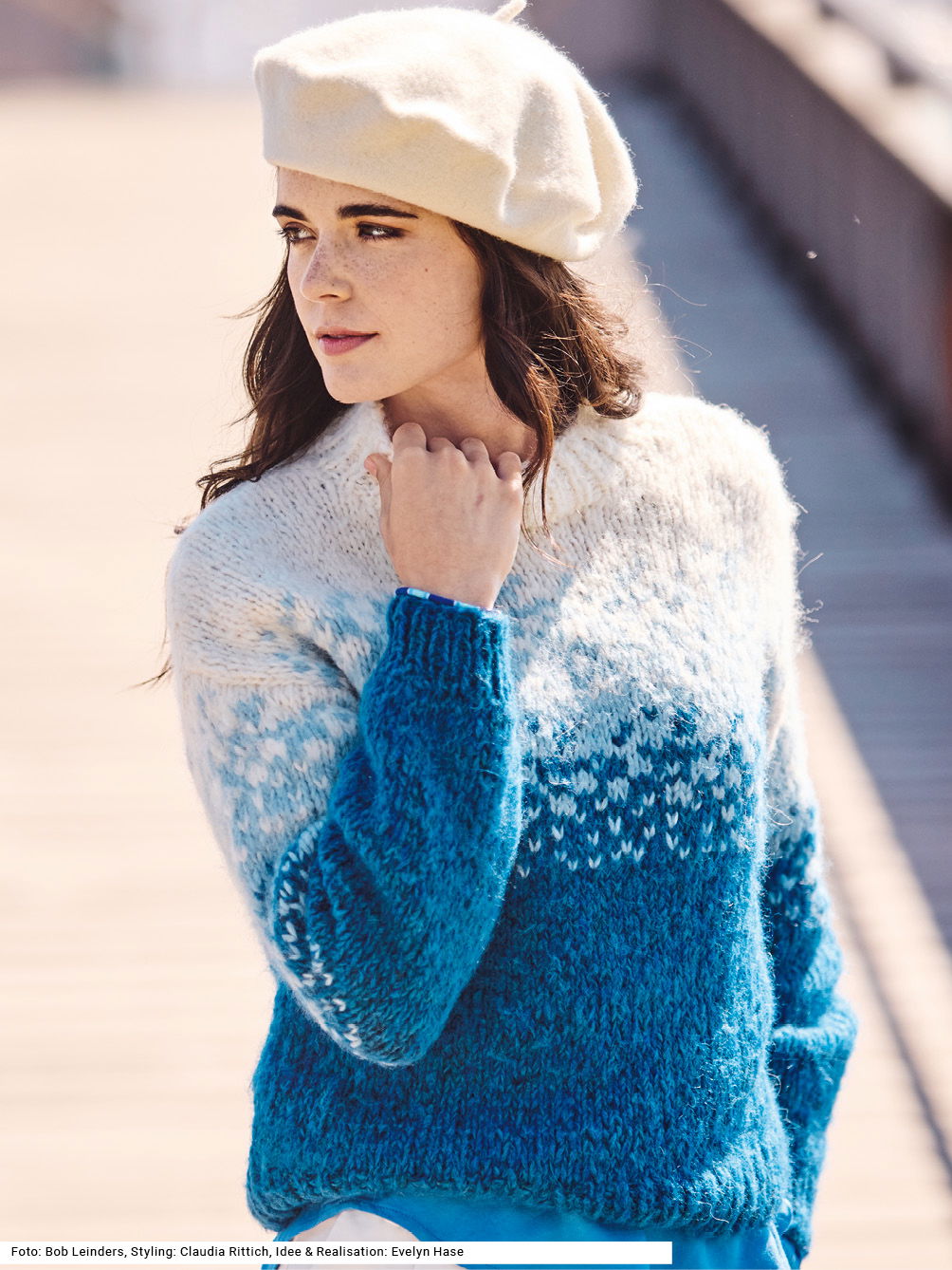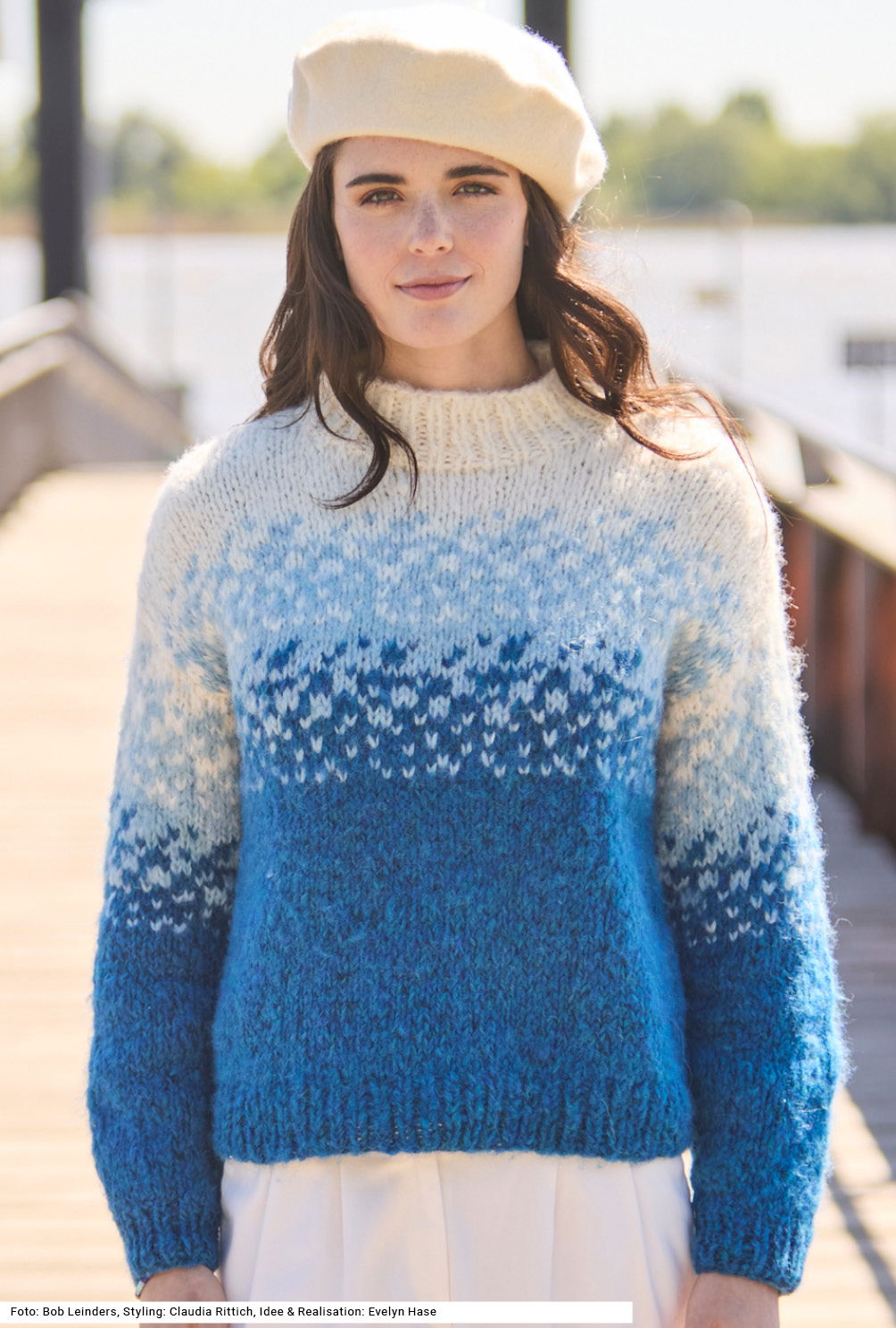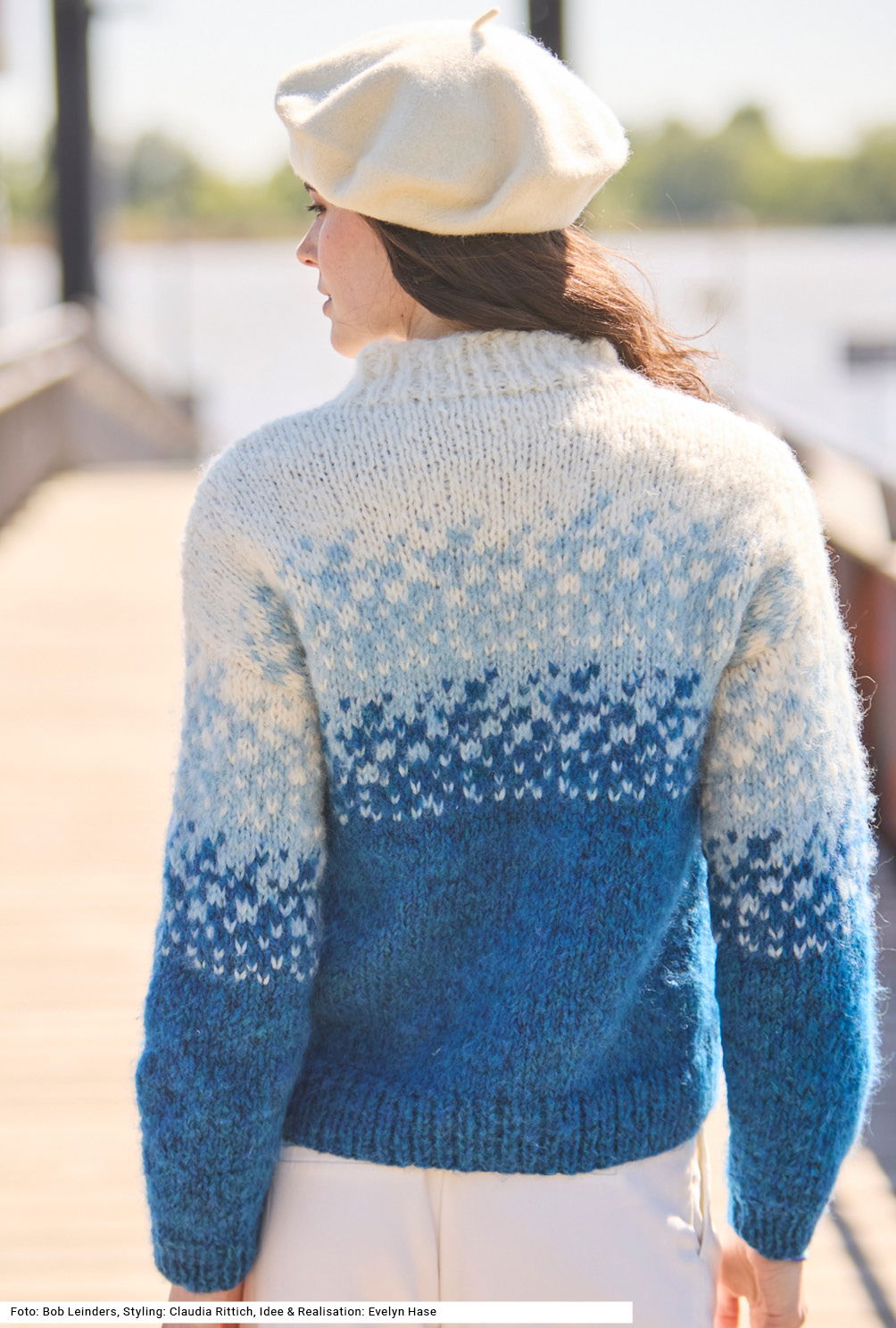 Einem Schneegestöber gleich entwickelt sich das Jacquardmuster von dunkel nach hell. Dieser klassische, gerade geschnittene und leicht flauschige Pulli erzeugt eine herrliche Winter-Anmutung. Dazu passt das weiche Garn aus Alpaka, Schurwolle und Baumwolle. Gerade eingesetzte Ärmel erleichtern das Einnähen und lassen die Schultern lässig überfallen. Hauptsächlich glatt rechts gearbeitet, werden die Bündchen und der Stehkragen jedoch im 1/1-Rippenmuster in der jeweils passenden Farbe gestrickt. Eine Anleitung kann für die Größen 36/38, 42/44 und 48/50 downgeloadet werden.
