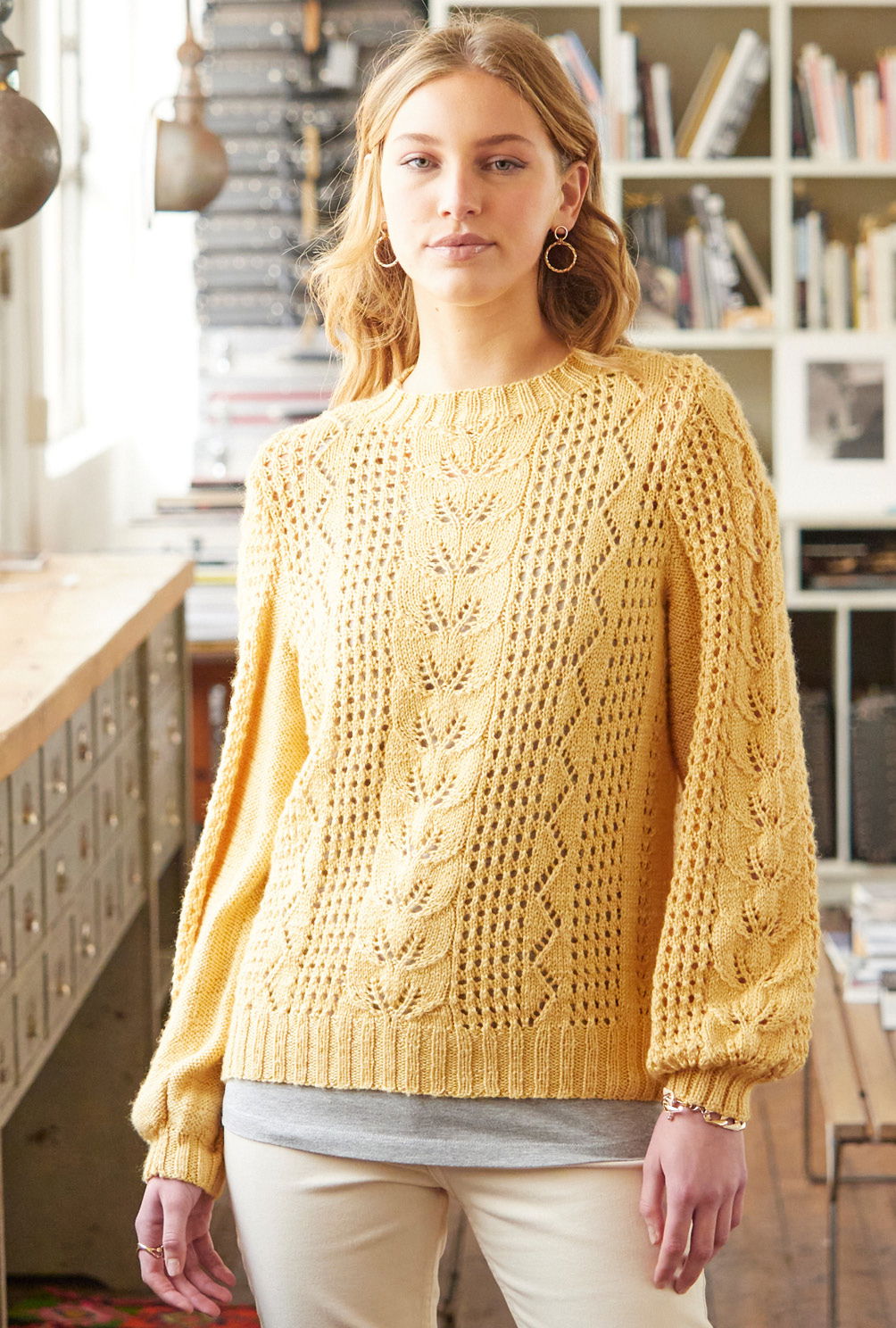 Ein toller Mustermix trifft auf eine lockere Passform. Dieser Pullover überzeugt mit einem eindrucksvollen Muster das durch ein einfaches Lochmuster dominiert wird. Dieses ist wirklich einfach zu stricken und verleiht dem Pullover eine grafische Note. Das Blattmuster sorgt für einen eleganten femininen Touch und ist durch die detaillierte Strickschrift in der Anleitung ganz einfach umzusetzen. Der Pullover verfügt über einen geraden Schnitt und locker sitzende Ärmel. Alle Teile werden einzeln mit Nadelstärke 3 und 4 in Reihen gestrickt und zum Schluss zusammengesetzt. Die Blende am Halsschnitt ist der letzte Arbeitsschritt, bevor der Pullover das erste Mal groß ausgeführt werden kann.