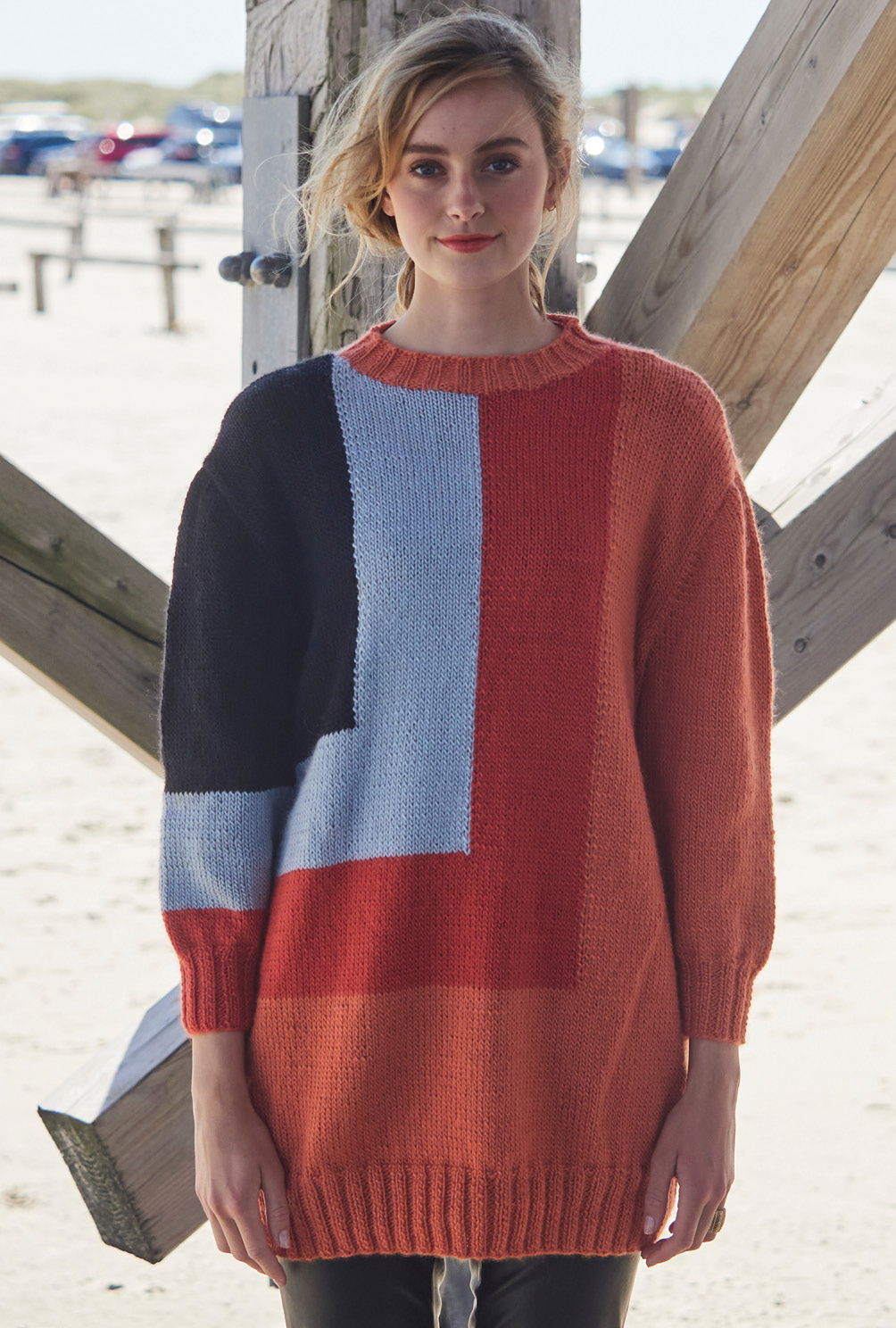 Sabrina Strickjournal Langer Pullover mit farbigen Flächen in Orange, Hellrot, Schwarz und Hellgrau