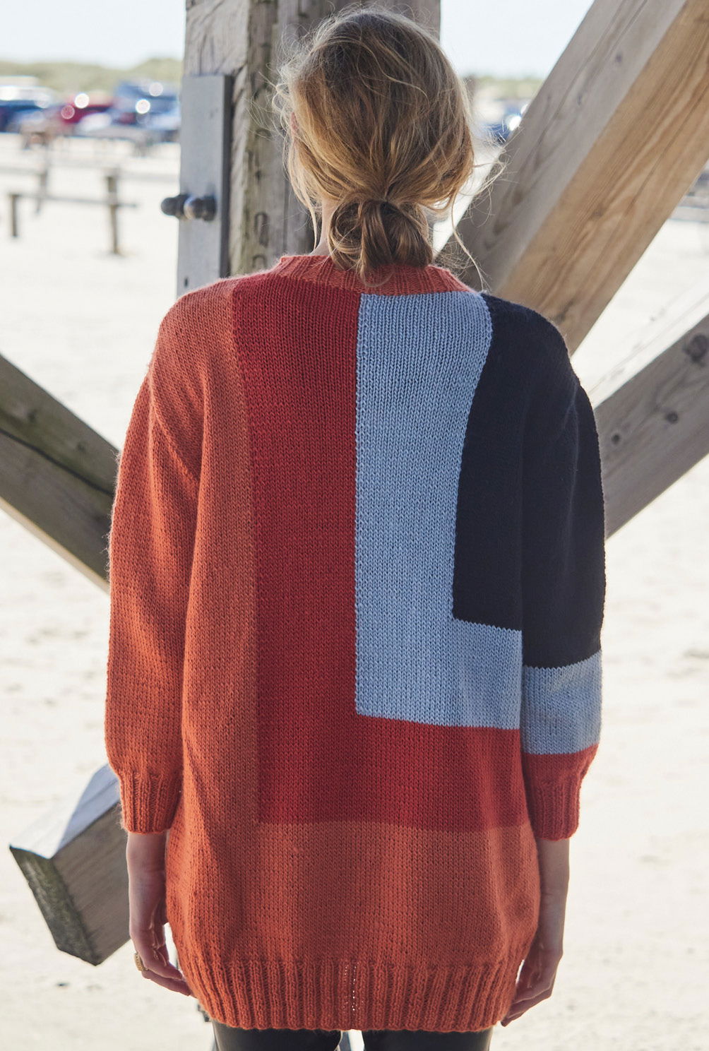 Fast wie ein Kunstwerk von Mondrian mutet dieser Pullover mit großzügigen Farbflächen an. Es dominiert in Orange, das auch für die Bündchen und die Blende zum Einsatz kommt. Hellrot, Hellgrau und Schwarz bilden die L-förmigen eingestrickten Flächen. Bündchen und Halsblende sind in 2/2-Rippen gearbeitet, ansonstenwird nur glatt rechts in der sogenannten Intarsientechnik (bei der lediglich beim Farbwechsel in der Reihe die beiden Fäden miteinander verkreuzt werden müssen) gestrickt. Die Ärmel sitzen perfekt, dank Armkugel. Eine Anleitung gibt es für drei Größen: 36/38, 40/42 und 44/46.
