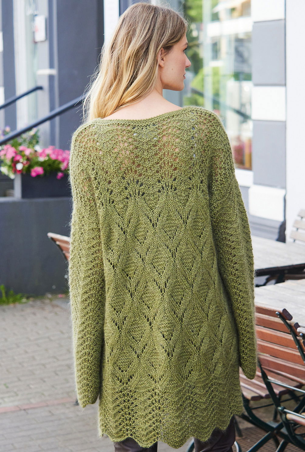 Ein langer Pullover, der durchaus auch mal als Minikleid getragen werden kann. Er wird zweifädig mit einem Superkid-Mohair und einem Schurwolle-Baumwolle-Garn gearbeitet. Das Pfauenmuster wird sowohl am hohen Bund als auch an der Passe und den extraweiten Ärmeln gestrickt. Dazwischen kommt das Fantasie-Ajourmuster mit großen Rauten zum Einsatz. Die Ärmel sind gerade eingesetzt, was das Zusammennähen erleichtert. Der runde Halsausschnitt bekommt zum Schluss noch einen mit Krebsmaschen gehäkelten Abschluss. Die Anleitung dazu gibt es für die Größen 38/40, 42/44) und 46/48.