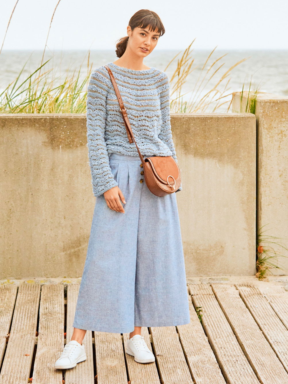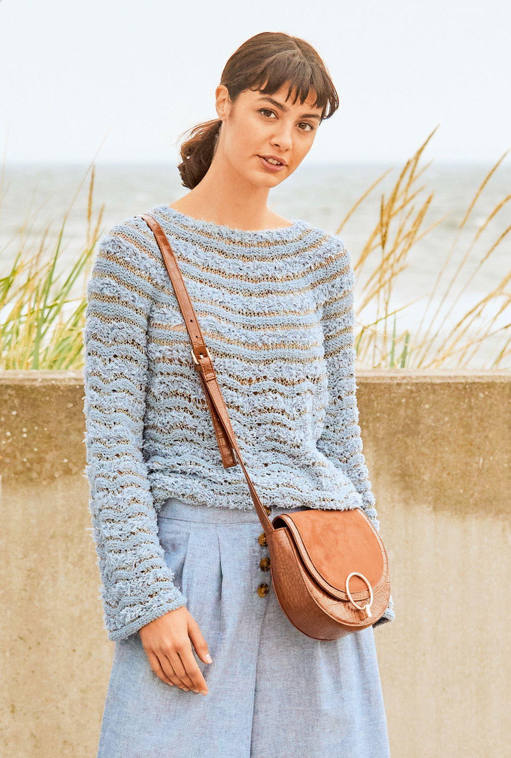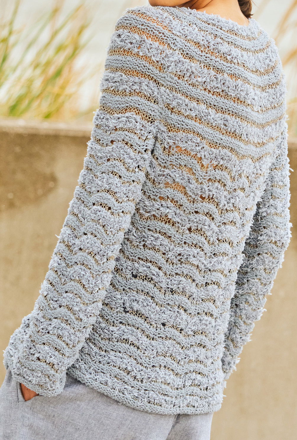 Gestrickt wird der leicht durchscheinende Pulli nahtlos in einem Stück von oben nach unten. Nach der Rundpasse werden hierfür die Ärmelmaschen erst einmal stillgelegt und der Körper immer in Runden fertig gestrickt. Im Anschluss kommen die Ärmelmaschen wieder auf die Nadeln und auch diese werden in Runden von oben nach unten gearbeitet. Das hat neben der höchst angenehmen Strickweise auch noch den zusätzlichen Vorteil, dass der Pulli immer mal wieder anprobiert werden kann, um Länge und Passform zu kontrollieren.