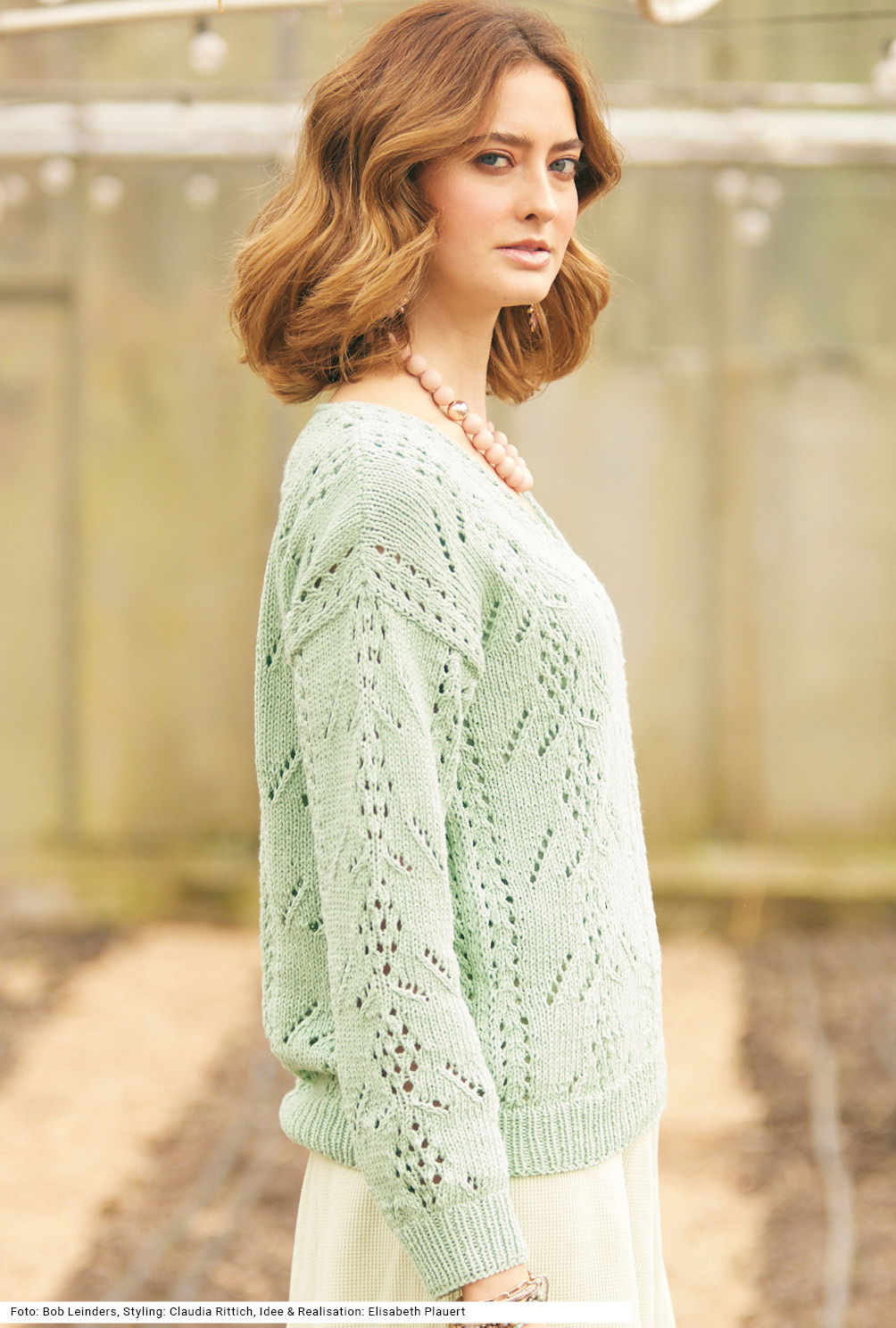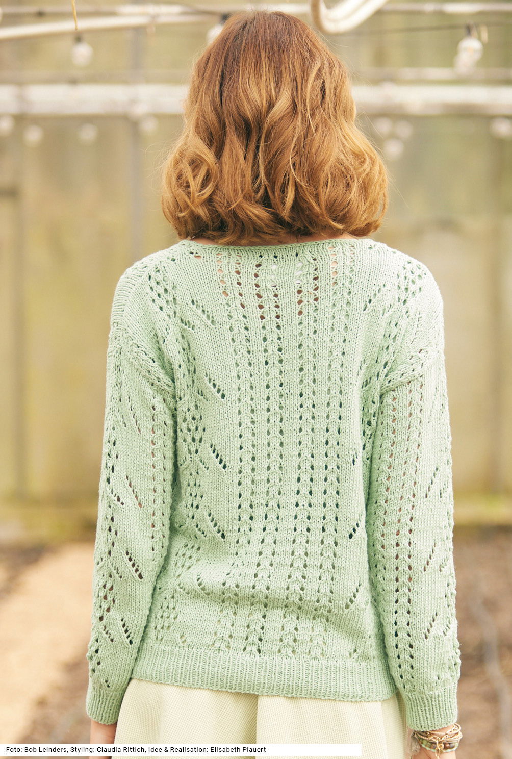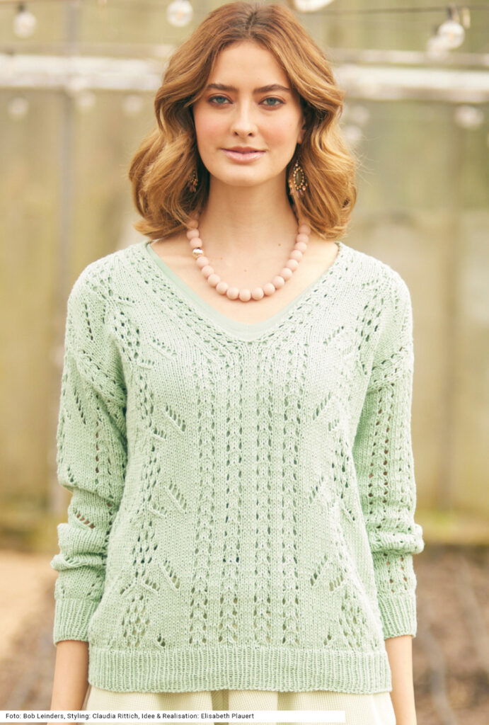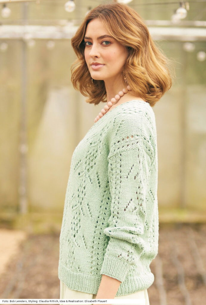 Dass Ajourmuster ganz unterschiedlich daherkommen können, beweist dieser lindgrüne Pulliaus einem Baumwolle-Viskose-Leinen-Gemisch. Es gibt ein flügelartig ausschweifendes und ein längs verlaufendes Ajourmuster; wobei das vertikale Lochmuster am V-Ausschnitt entlang fortgeführt wird. Damit die löchrigen Muster gut zur Geltung kommen, wird dazwischen glatt rechts gestrickt. Saum- und Ärmelbündchen sind im 1/1-Rippenmuster gearbeitet, der V-Ausschnitt bekommt lediglich noch eine Umrandung aus einer gehäkelten Runde Kettmaschen für einen sauberen Abschluss. Die Anleitung kann für die Größen 36/38, 40/42 und 44/46 downgeloadet werden.