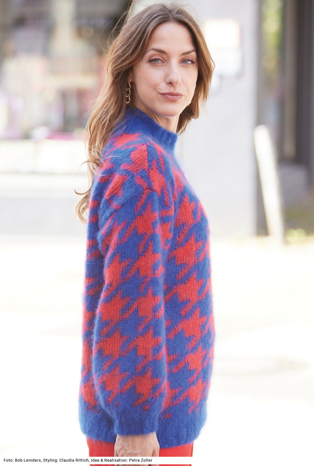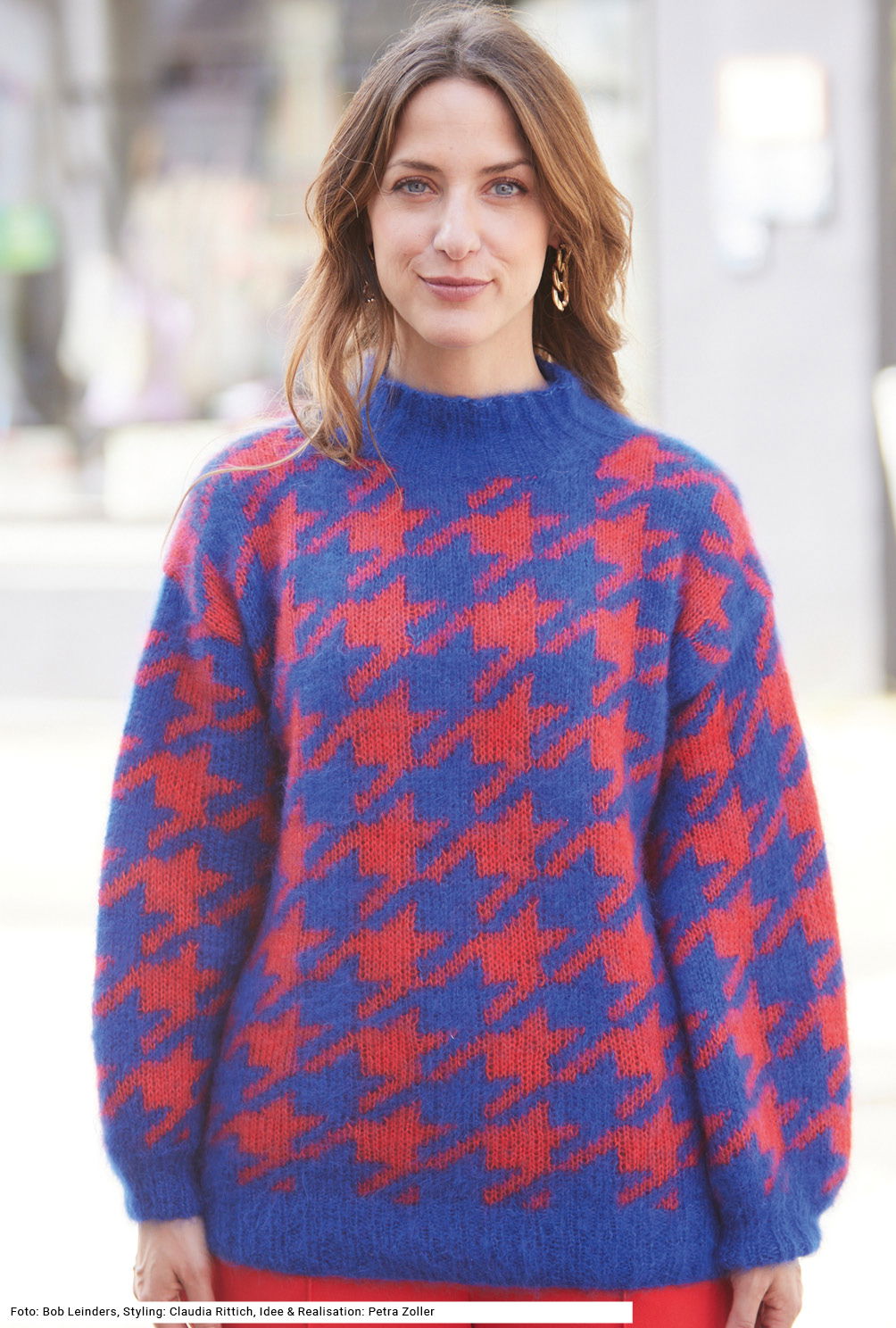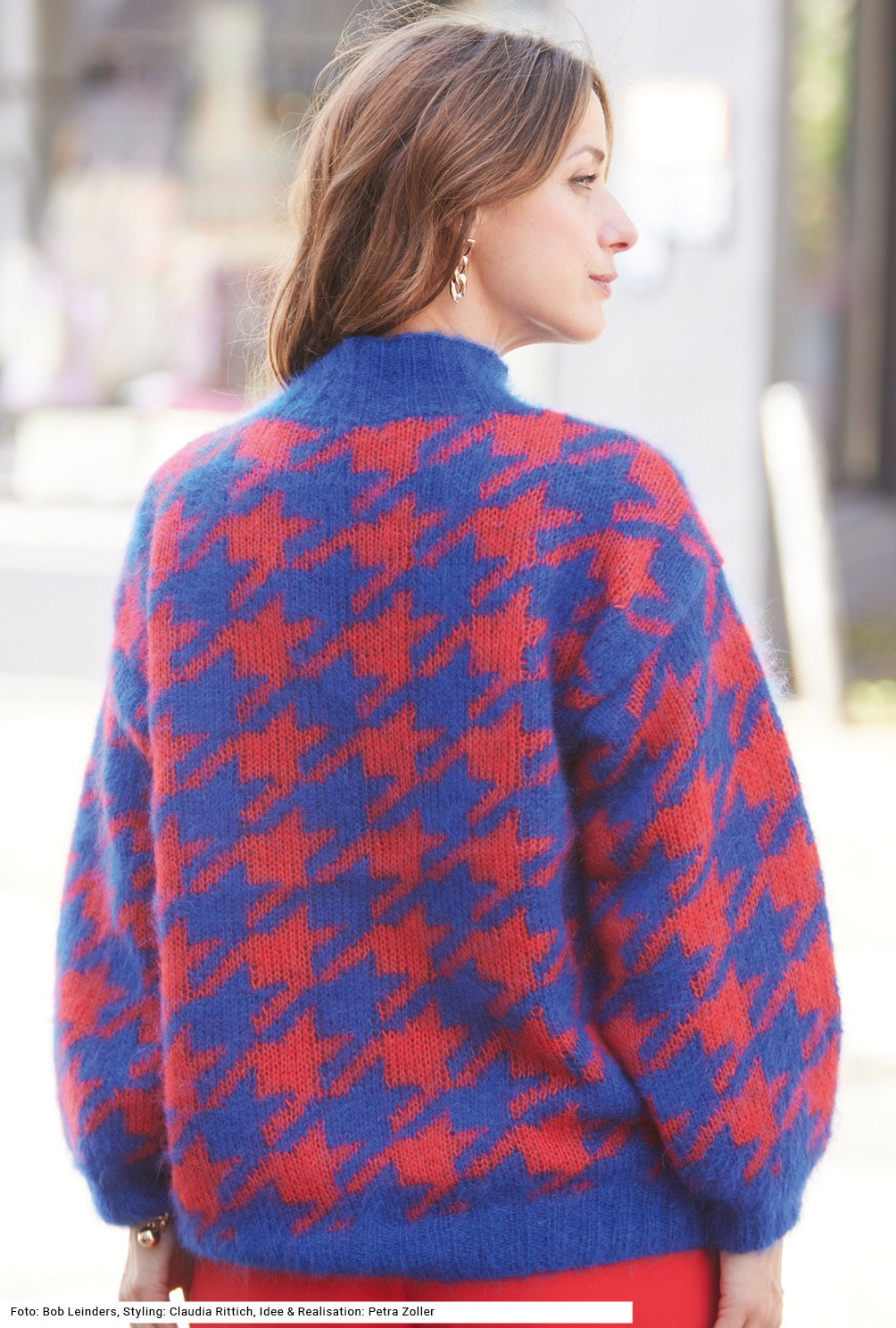 Der ausdrucksstarke Mohairpulli wird mehrfädig aus verschiedenen Mohair-Qualitäten mit hohem Seidenanteil gestrickt – trotzdem ist er ein Federgewicht! Das grafische Allover-Jacquardmuster kommt durch die kräftigen Farben besonders gut zur Geltung. Gestrickt wird der flauschige Pullover in Einzelteilen, wobei Vorder- und Rückenteil bis zum Beginn des Halsausschnitts gerade hoch gearbeitet werden und auch die Ärmel ohne Zunahmen auskommen. Dadurch entsteht nicht nur der lässige Schnitt, auch das plakative Muster bleibt durchgehend erhalten und während des Strickens kann man sich ganz allein auf das Muster konzentrieren. Die farbige Strickschrift in der Anleitung hilft zusätzlich dabei, stets den Überblick zu behalten. Sind alle Teile fertig, werden nur noch die Nähte geschlossen, die Ärmel eingenäht und der Halsausschnitt bekommt noch die Rippenblende angestrickt.