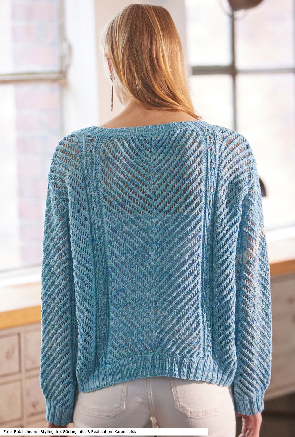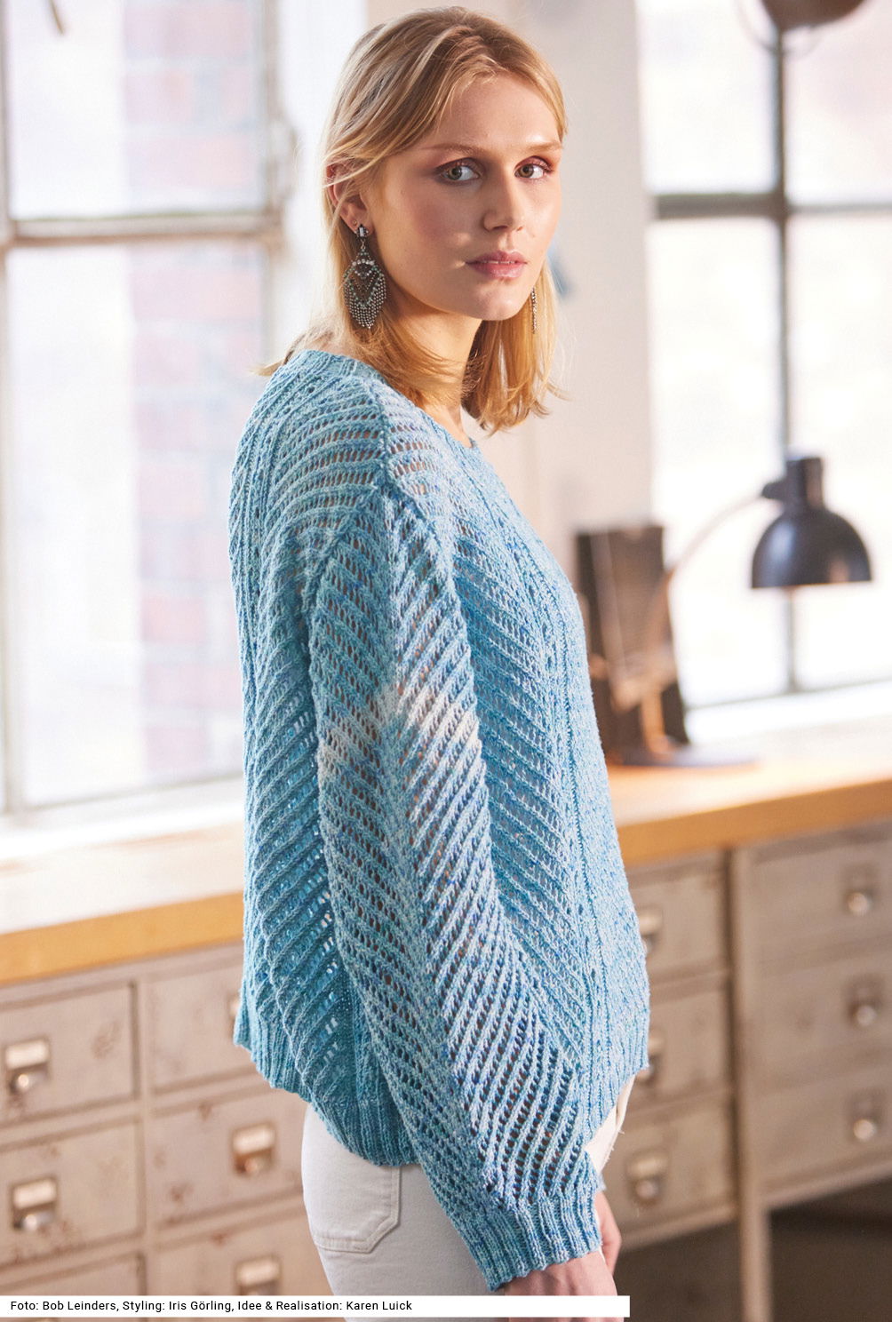Dieser sehr weit geschnittene Pulli aus edler, reiner Seide fließt locker um den Körper. Die azurblaue Farbe passt zum Frühling wie ein frischer Windhauch. Besonders frisch wirkt die Farbe zu einer weißen Hose. Durch die Kombination aus einem diagonal verlaufenden Ajourmustern und vertikalen Lochstreifen flankiert mit glatt links bekommt das Modell eine wunderbare Dynamik. Alle Saum- und Ärmelbündchen sowie die Ausschnittblende sind als Rippen 2 rechts, 2 links gearbeitet. Eine Anleitung dafür steht in den Größen 38/40, 42/44 und 46/48 zur Verfügung.