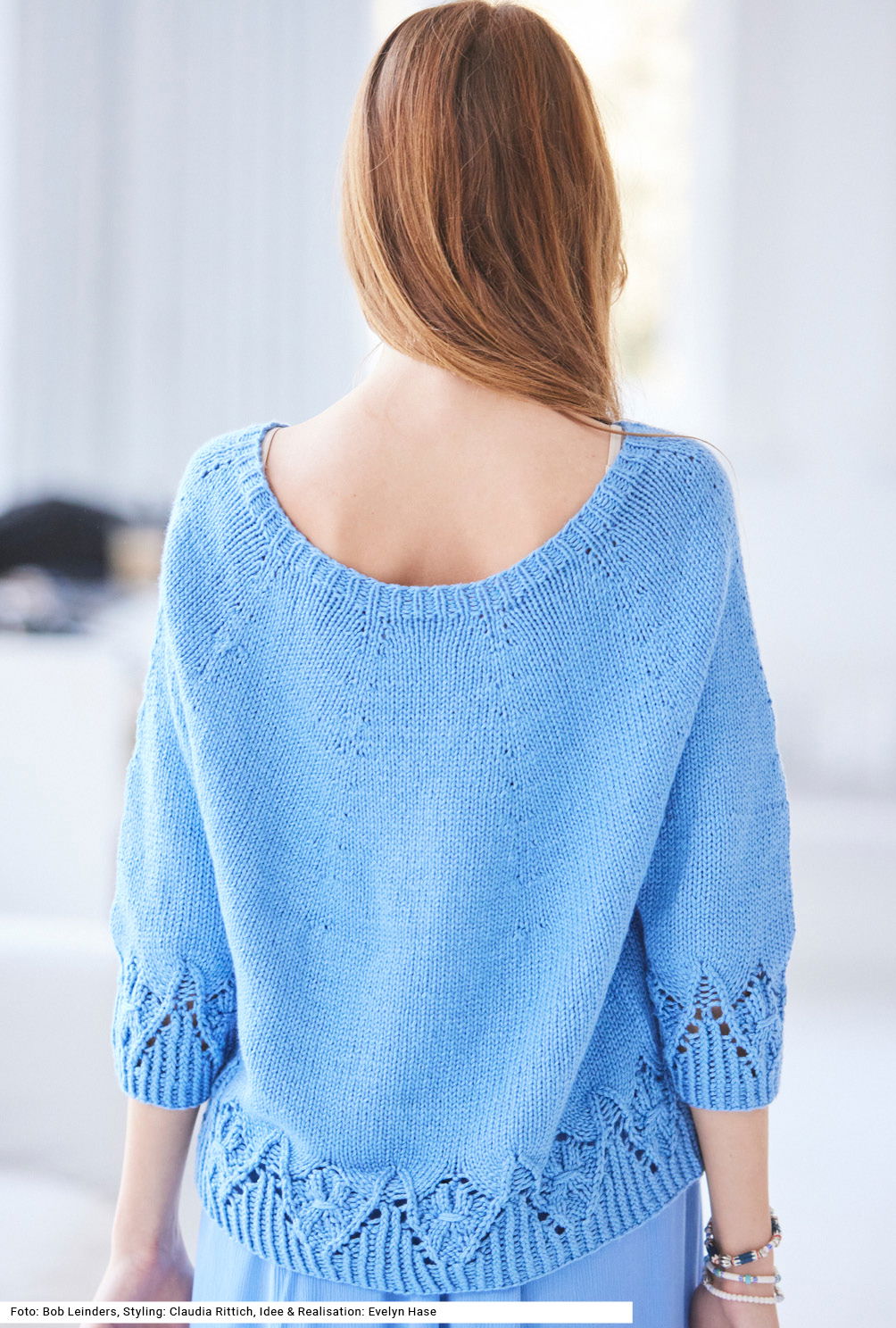 Dieser in einem Stück, von oben nach unten gestrickte Pullover mit Raglanschrägungen ist genau das Richtige für Leute, die nicht gerne zusammennähen. Aus einem leicht glänzenden Garn aus Baumwolle, Viskose und Polyamid gearbeitet. Am Saum von Vorder- und Rückenteil sowie den dreiviertellangen Ärmeln sorgt eine Ajourbordüre für eine besondere Note. Ansonsten wird glatt rechts gestrickt, wobei die Bündchen und die Halsausschnittblende im 1/1-Rippenmuster gemacht sind. Eine Anleitung steht für die Größen 36/38, 42/44 und 48/50 zur Verfügung.