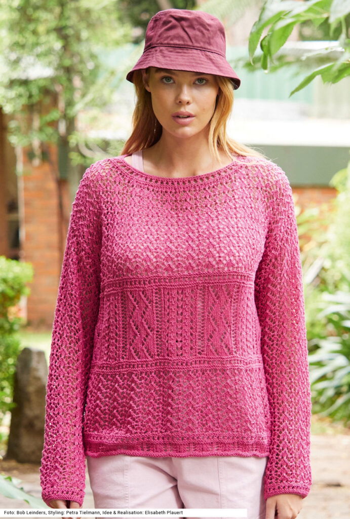 Dir sind einfache Muster und Schnitte zu langweilig? Dann ist dieser Pulli mit vielfältigem Ajourmuster-Mix genau das Richtige. Er ist aus reiner Baumwolle in frischem Fuchsia gearbeitet. Die Ärmelbündchen und die Blende am runden Halsausschnitt werden glatt links und mit einem schmalen Lochmuster gearbeitet, am Saum beginnt nach der glatt-linken Blende gleich das erste Ajourmuster. Der gerade Schnitt und die locker sitzenden weiten Ärmel, die nach oben hin noch mehr an Weite gewinnen, machen das Zusammennähen einfach. Die Anleitung steht für die Größen 38/40, 42/44 und 48/50 zur Verfügung.
