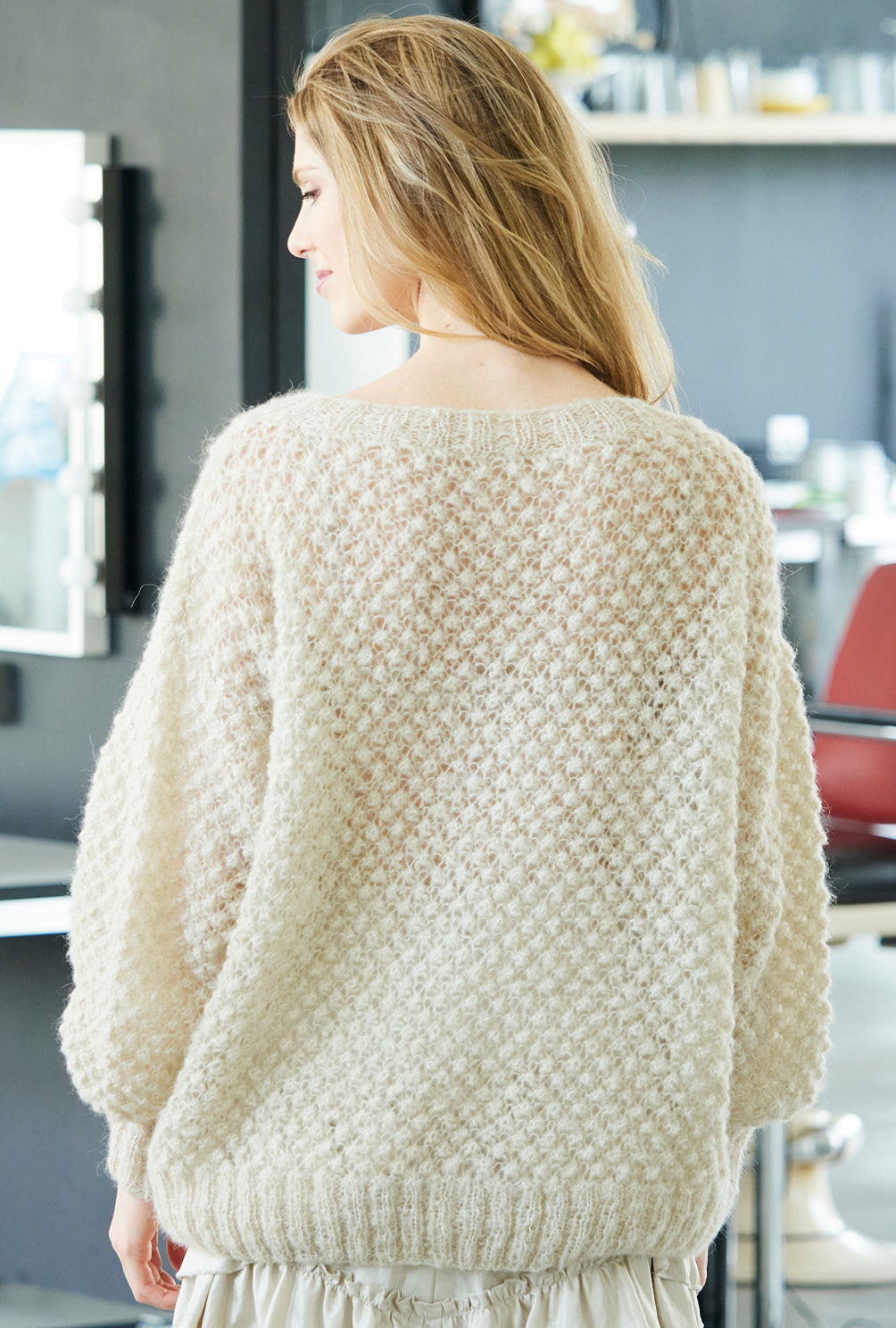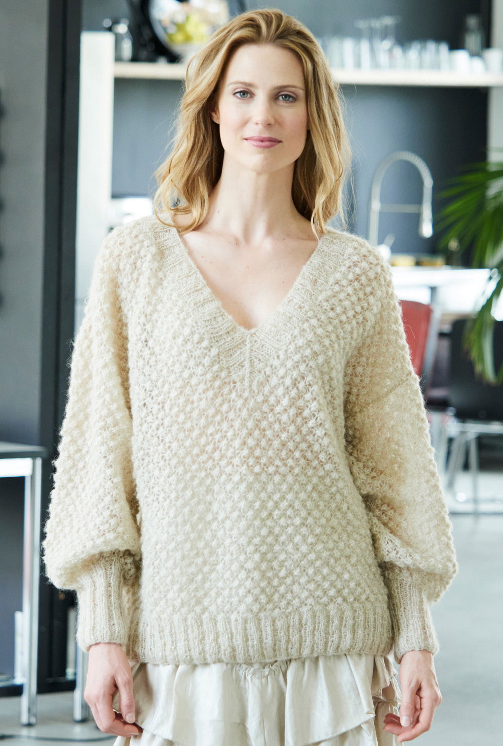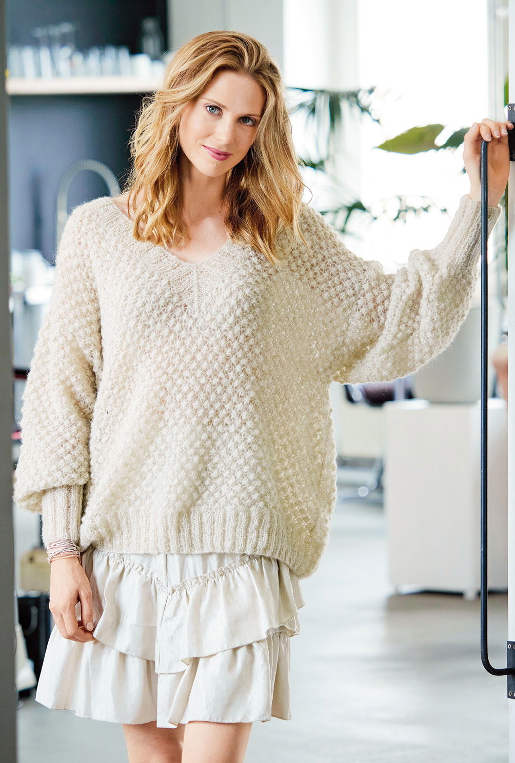 Wenn wir uns entspannen können und unsere Freizeit mit Dingen verbringen, die uns mit Freude erfüllen – dann haben wir unsere ganz persönliche Quality Time. Wie gemacht dafür ist dieser wollweiße Pullover, gestrickt aus weichem Garn und im romantischem Dornröschenmuster, der durch seine weiten Keulenärmel modische Akzente setzt und uns gleichzeitig genügend Raum zum Wohlfühlen lässt. Das Muster ist eingängig, bietet uns Abwechslung, ohne anzustrengen und lässt uns mit Nadelstärke 5 in angenehmen Tempo vorankommen. Sind alle Teile fertig, die Nähte geschlossen und die Halsausschnittblenden gestrickt, haben wir einen Begleiter geschaffen, der uns warm umhüllt, modisch kleidet und uns bei jeder Art von Quality Time wohlfühlen lässt.