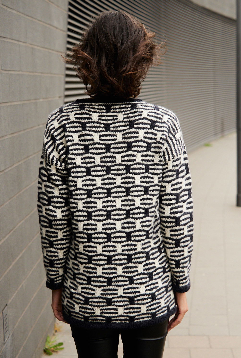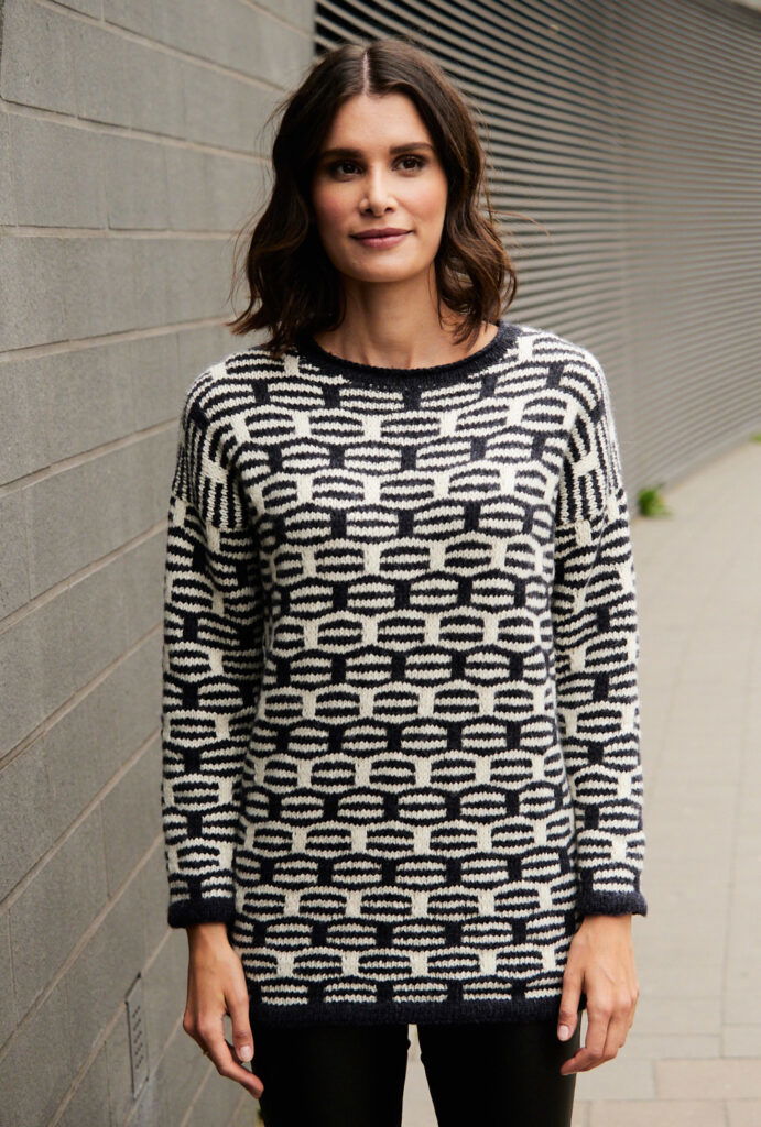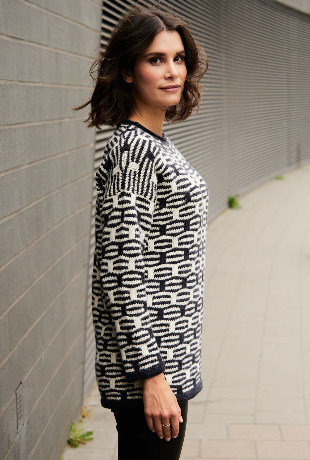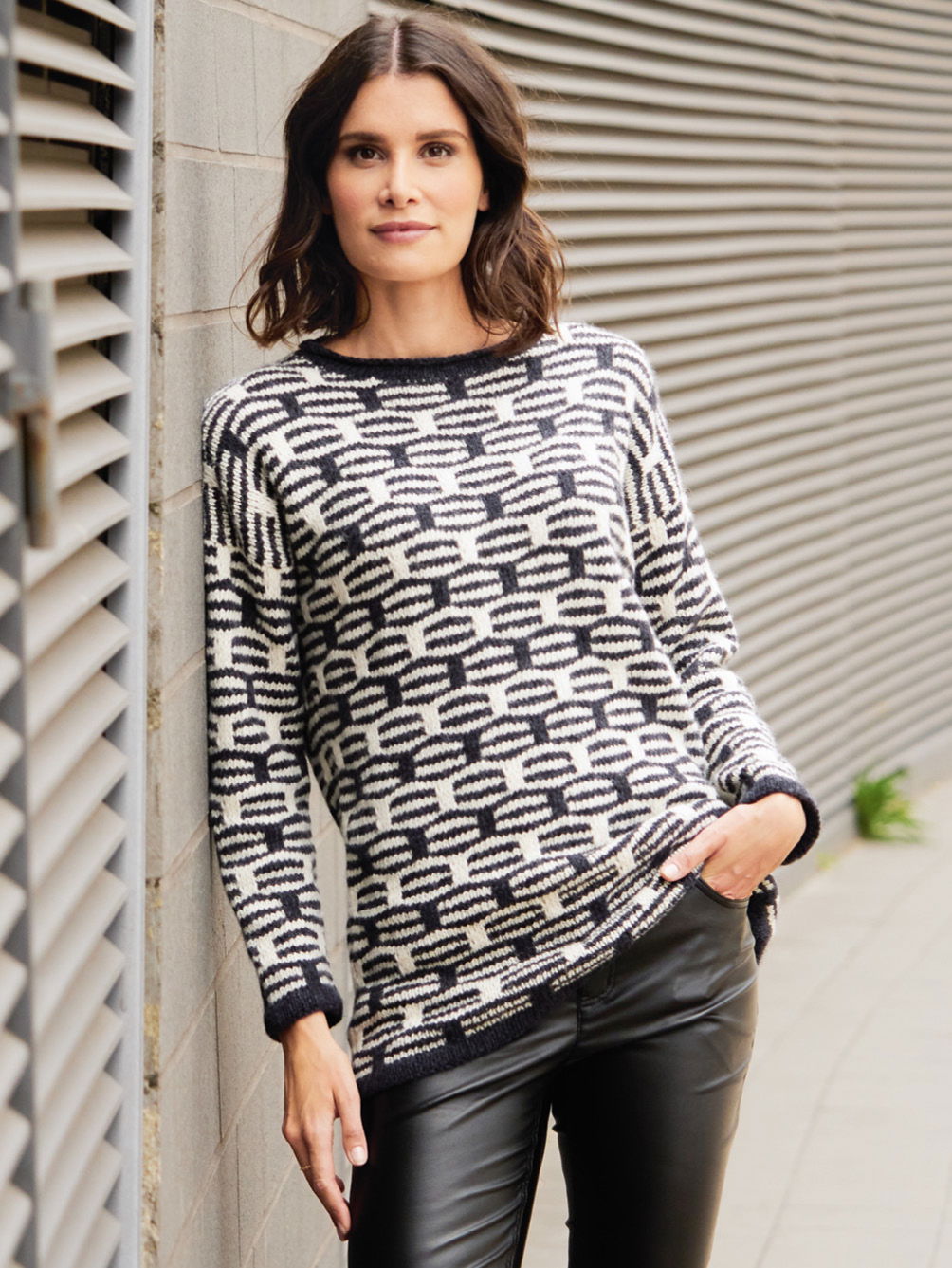 Für diesen Longpulli werden eigentlich immer nur je 2 Reihen in Anthrazit und Rohweiß gestrickt, jedoch stehen durch die hochgezogenen Hebemaschen je nach Betrachtungsweise mal die dunklen, mal die weißen Elemente optisch in den Vordergrund. Die doppelten Bündchen und die Halsausschnittblende sind in Schwarz glatt rechts gearbeitet. Wer dem Pullover lieber eine helle Anmutung geben möchte, kann auch weiße Bündchen arbeiten. Gestrickt ist das Modell aus einem Garn mit Alpaka, Baumwolle und etwas Schurwolle. Die Anleitung steht in den Größen 38/40, 42/44 und 46/48 zur Verfügung.