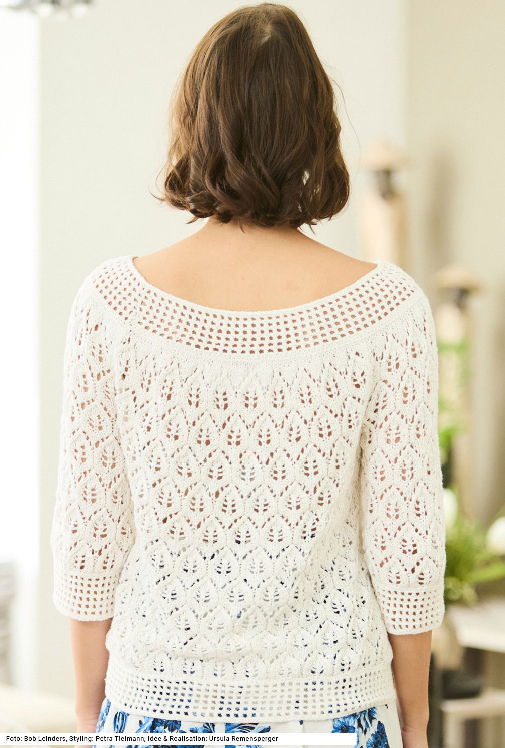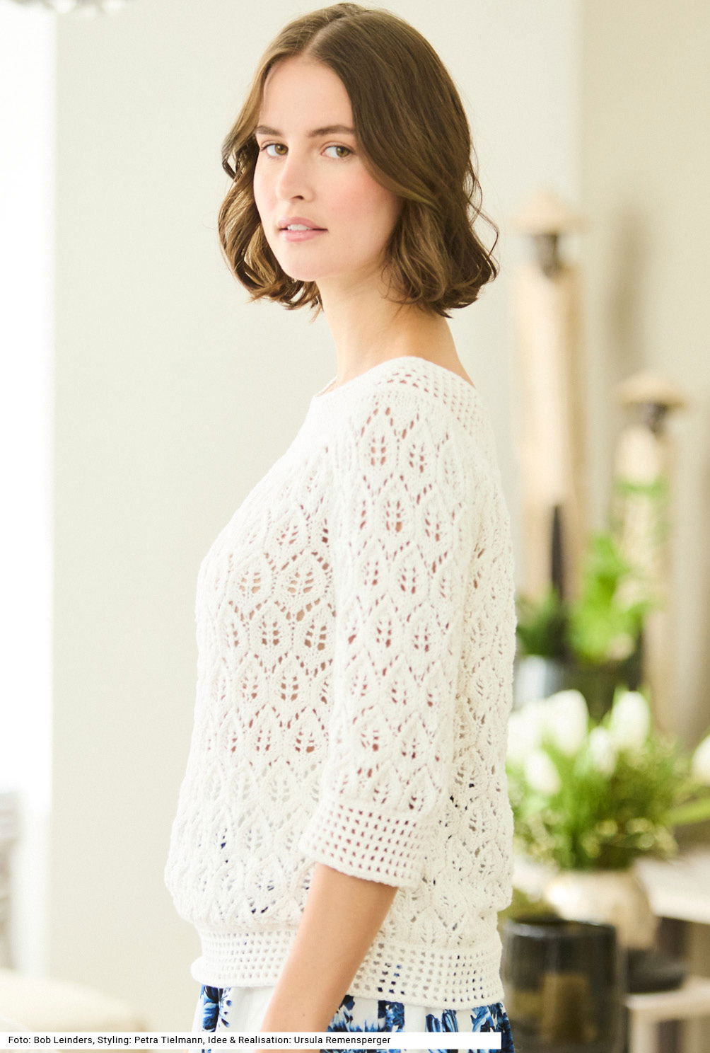 Der Pulli mit Allover-Ajourmuster punktet mit einem besonderen Extra: Saum- und Ärmelbündchen und auch die Ausschnittblende sind mit einem luftigen Filetmuster behäkelt. Die Schnittführung sieht kompliziert aus, ist es aber nicht: Bis kurz nach den Armausschnitten wird ganz gerade gearbeitet, dann alle Maschen abgekettet. Die anschließend angehäkelte breite Blende legt sich wunderbar um den Halsausschnitt und zeigt ein schönes Dekolleté. Ein weiches Garn aus viel Baumwolle mit etwas Kaschmir schmeichelt der Haut. Eine Anleitung dazu gibt es für die Größen 36/38, 40/42 und 44/46.