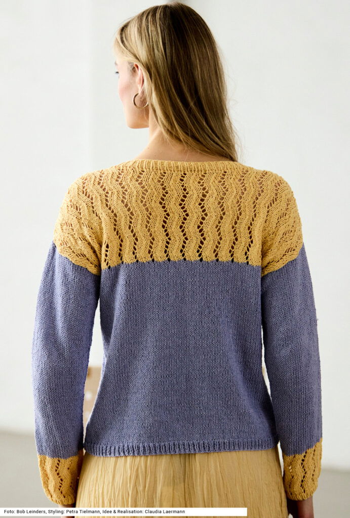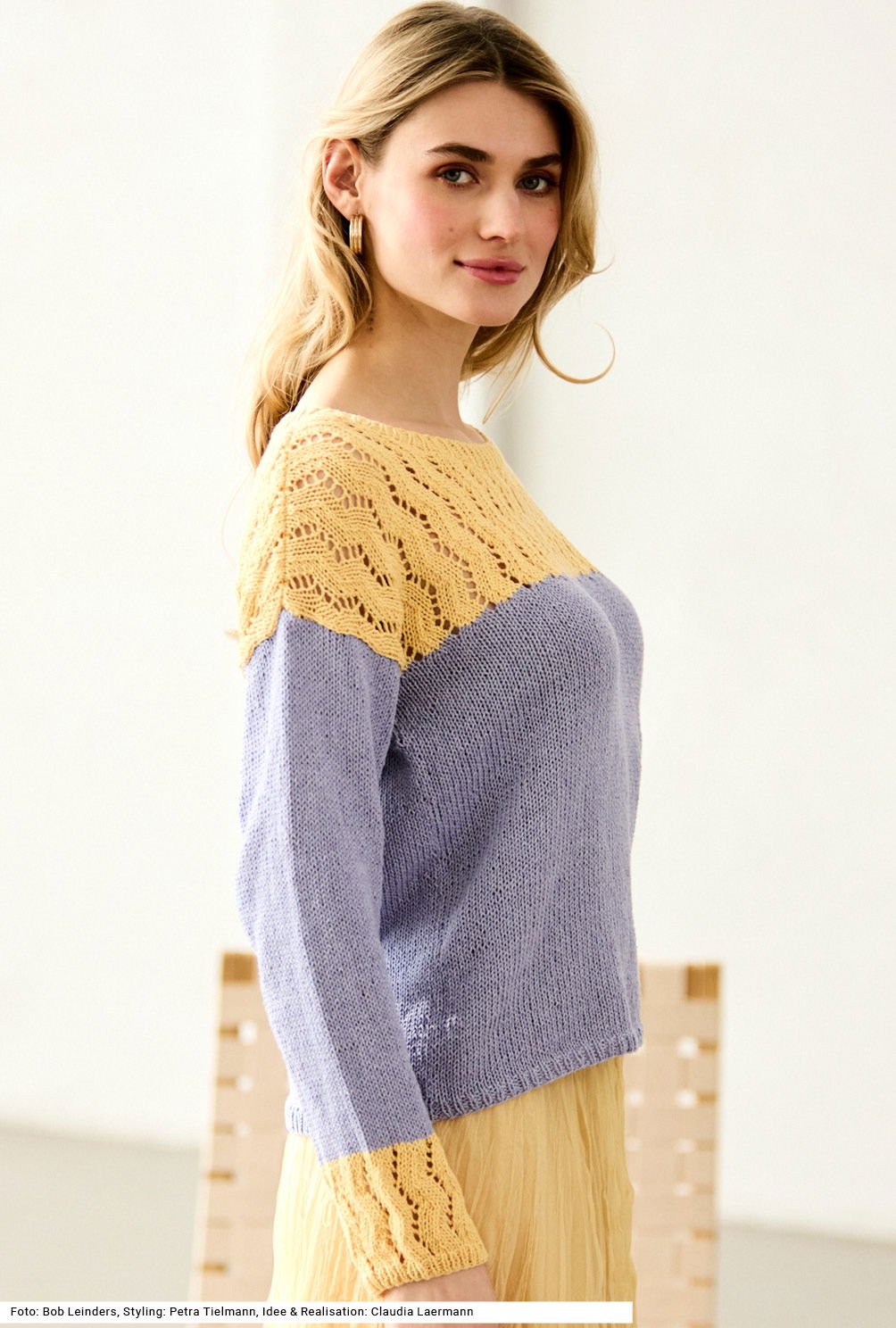 Schmeichelhaft ist dieser lässige Pulli nicht nur zur Figur, er liegt dank des Garns mit 50-prozentigem Seidenanteil (der Rest ist aus Baumwolle) auch wunderbar weich auf der Haut. Zudem sorgen die farbig abgesetzten Ajourmuster-Partien an der Passe und am Beginn der Ärmel für eine besondere, überaus feminine Note. Davor bzw. danach wird glatt rechts in einer kontrastierenden Farbe gearbeitet. Die schmalen Bündchen und die Ausschnittblende sind im 1/1-Rippenmuster gestrickt. Eine Anleitung kann für die Größen 36/38, 40/42 und 44/46 downgeloadet werden.