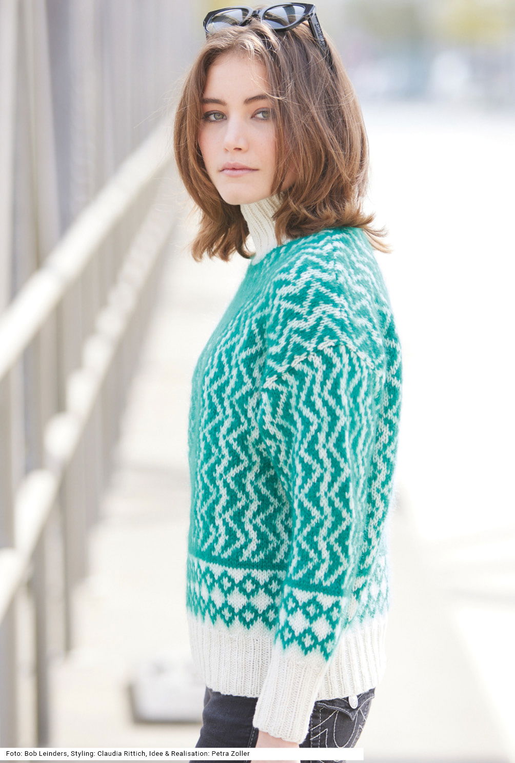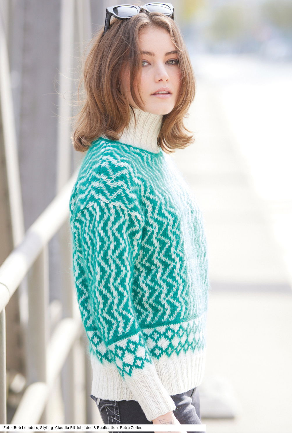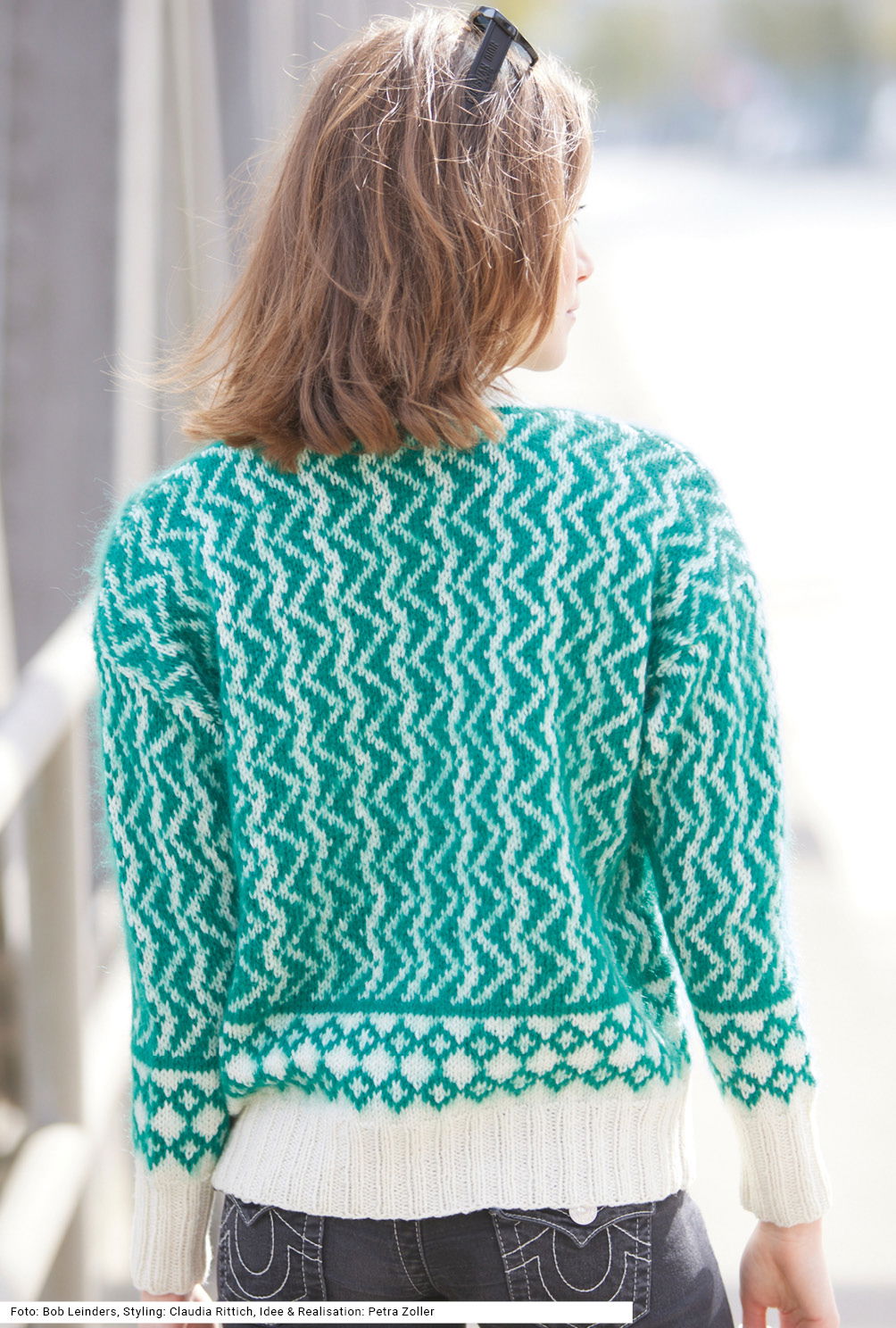 Dieser Pulli mit Jacquardmuster lebt von der harmonischen Kombination zweier Garnqualitäten – während das weiße Schurwollgarn für Wärme und Struktur sorgt, gibt das opalgrüne Mohair-Seide-Garn dem Pullover eine wunderbar flauschige Haptik. Alle Bündchen und der Stehkragen sind in Weiß im Rippenmuster gearbeitet, nach dem Bund folgt zunächst eine Bordüre mit kleinen Rauten, danach kommt das Zackenmuster. Schmal beginnende, nach oben hin breitere Ärmel und die geraden Seitenlinien sorgen für überschnittene Schultern. Eine Anleitung kann für die Größen 36/38, 40/42 und 44/46 downgeloadet werden.